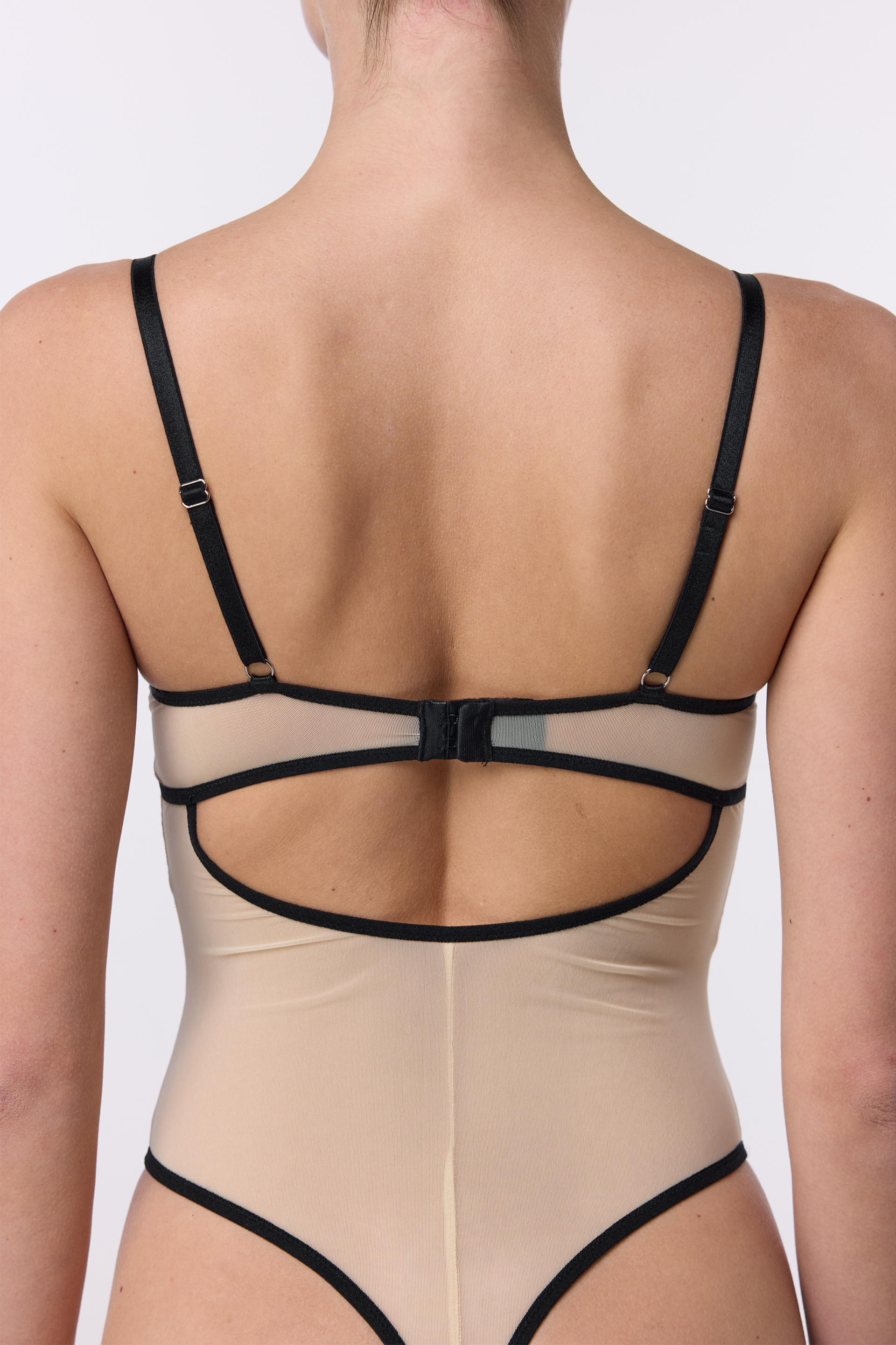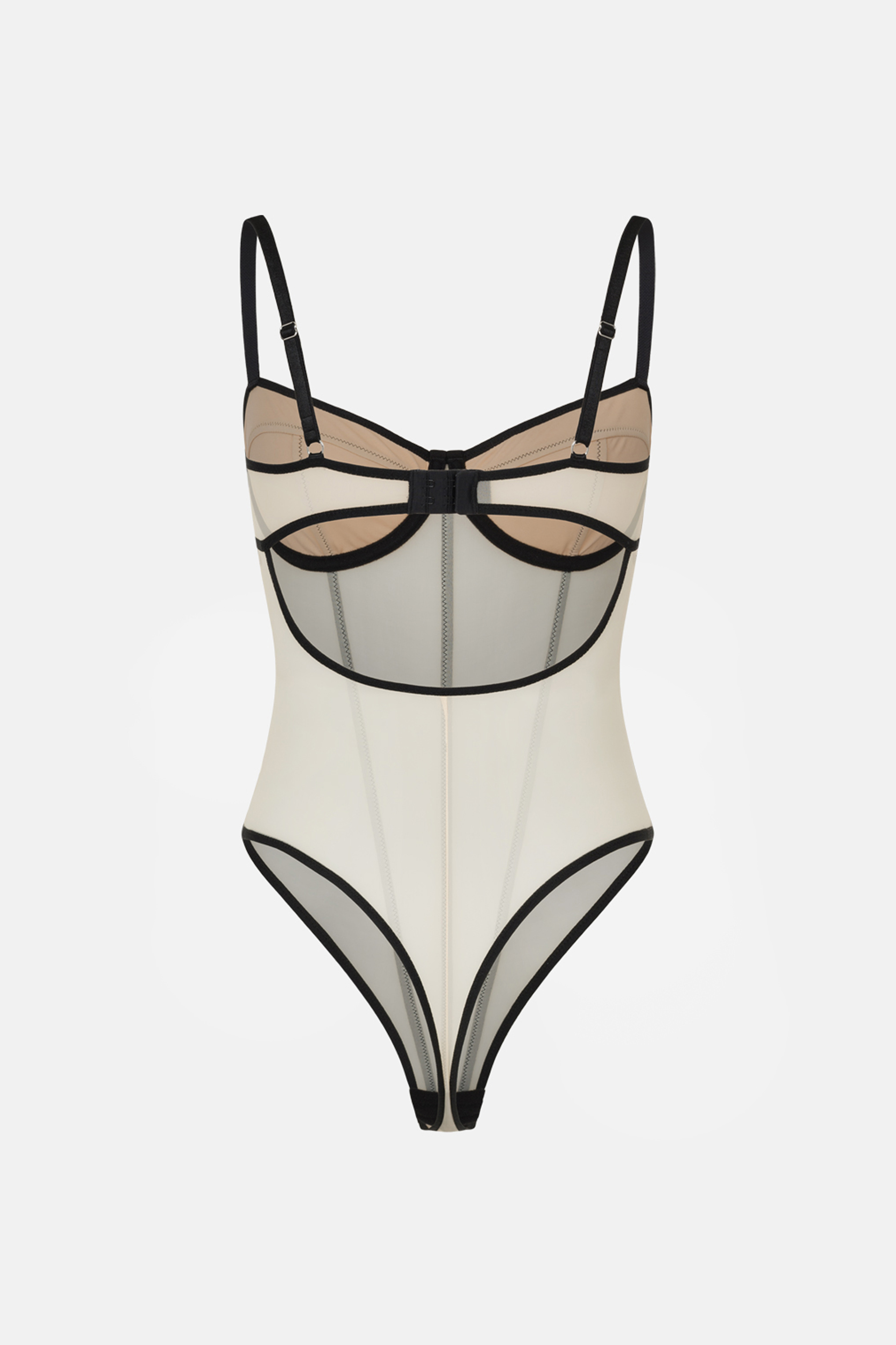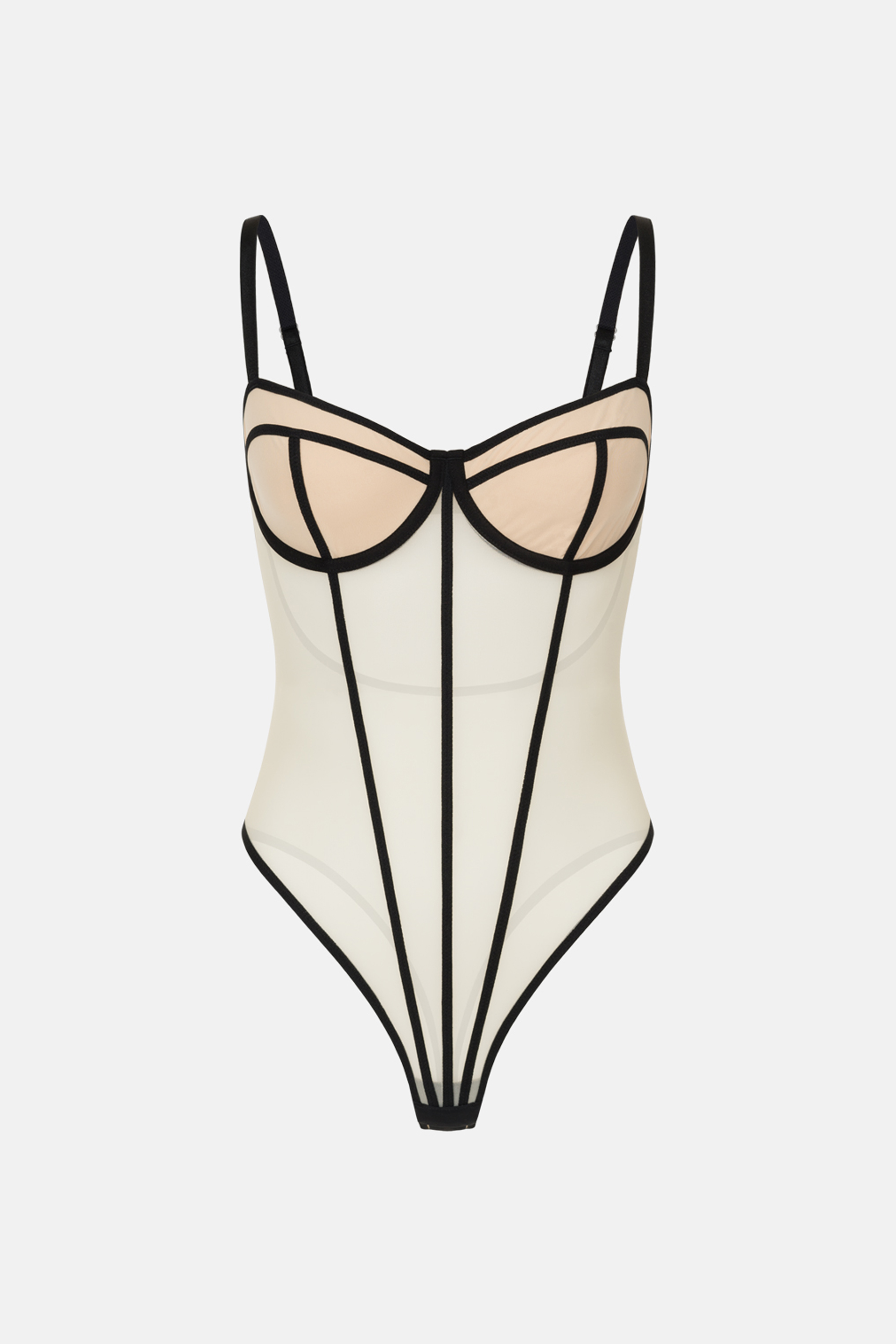 Боді Contour — це поєднання чуттєвості, комфорту та архітектурної точності ліній. Модель створена з еластичної напівпрозорої тканини, що м’яко повторює контури тіла, підкреслюючи природну жіночність. Вшиті каркасні елементи формують витончену форму та підтримку, а тонкі бретелі додають легкості силуету. Делікатна текстура створює образ впевненості й ніжності водночас.