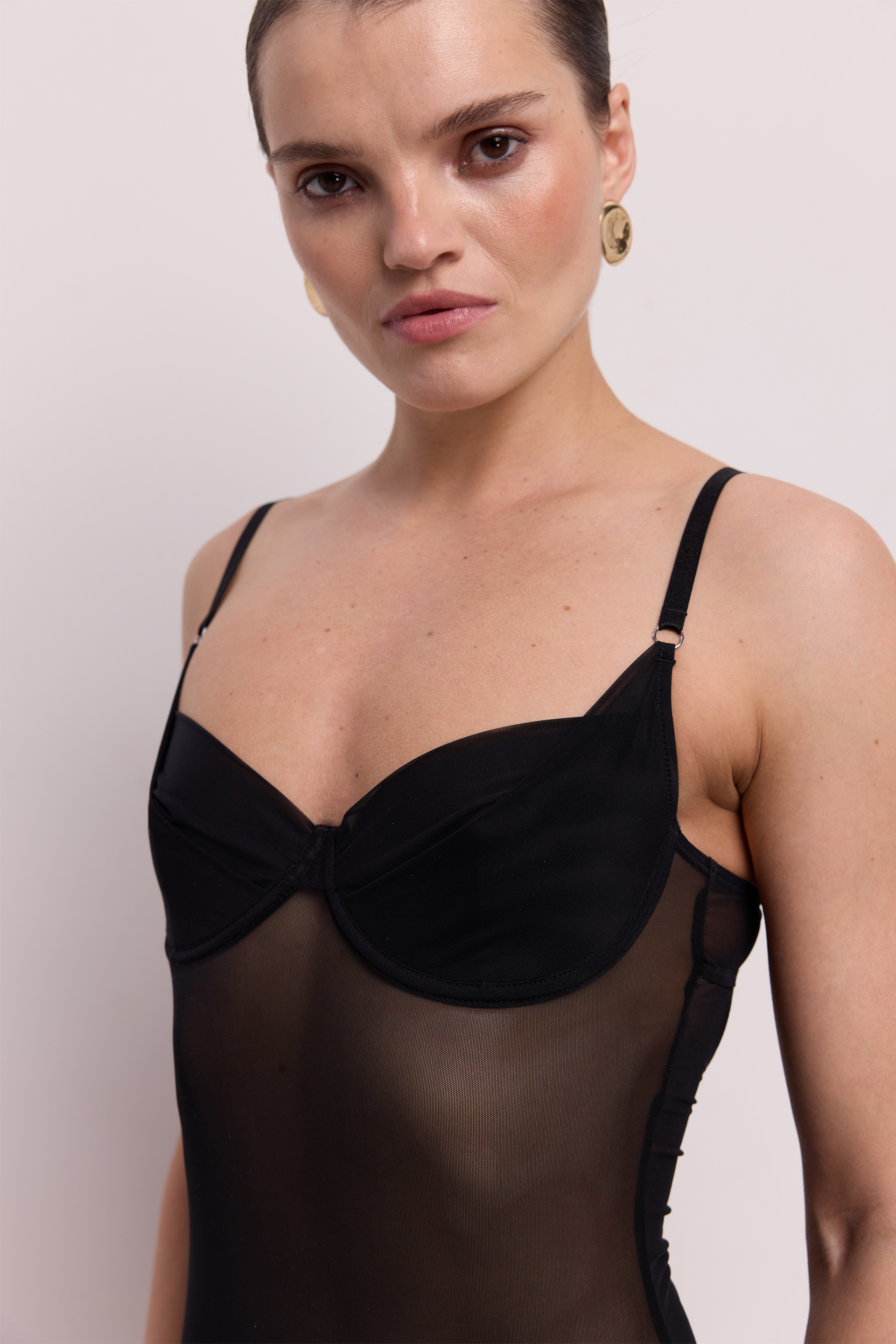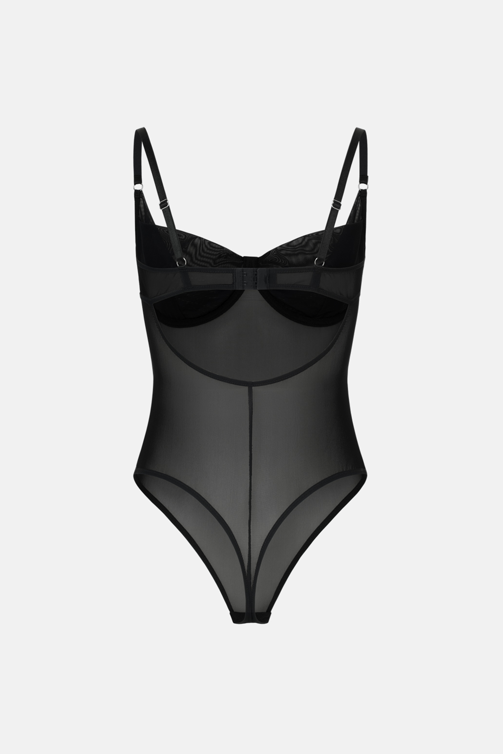Eventide bodysuit — підійде для дівчат зі зростом 158–166 см. Силует, що обіймає тіло, як другий шар шкіри. Боді поєднує в собі глибокий виріз із чіткими лініями чашок, створюючи образ, в якому комфорт межує з провокацією. Для тих, хто звик носити впевненість під одягом.