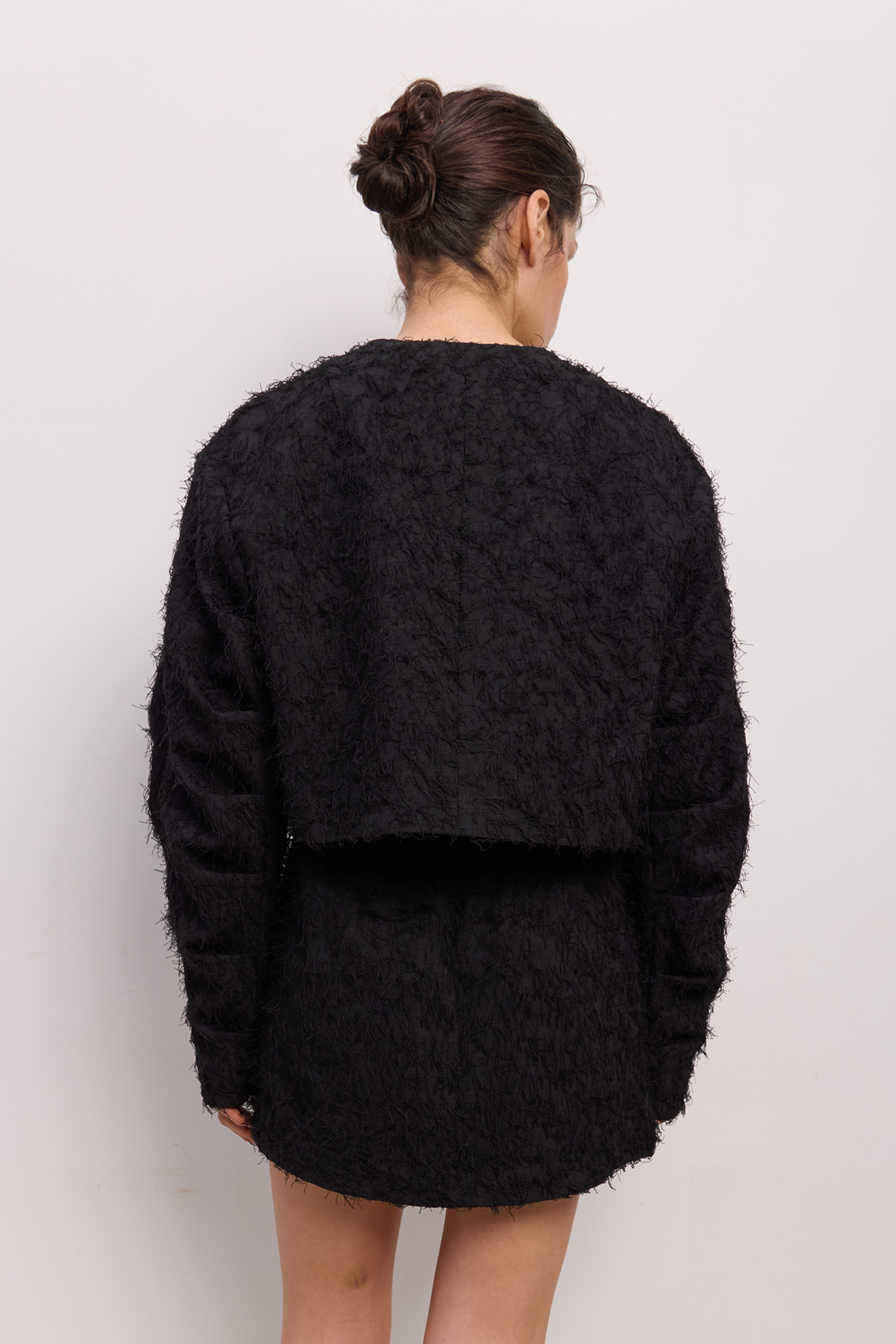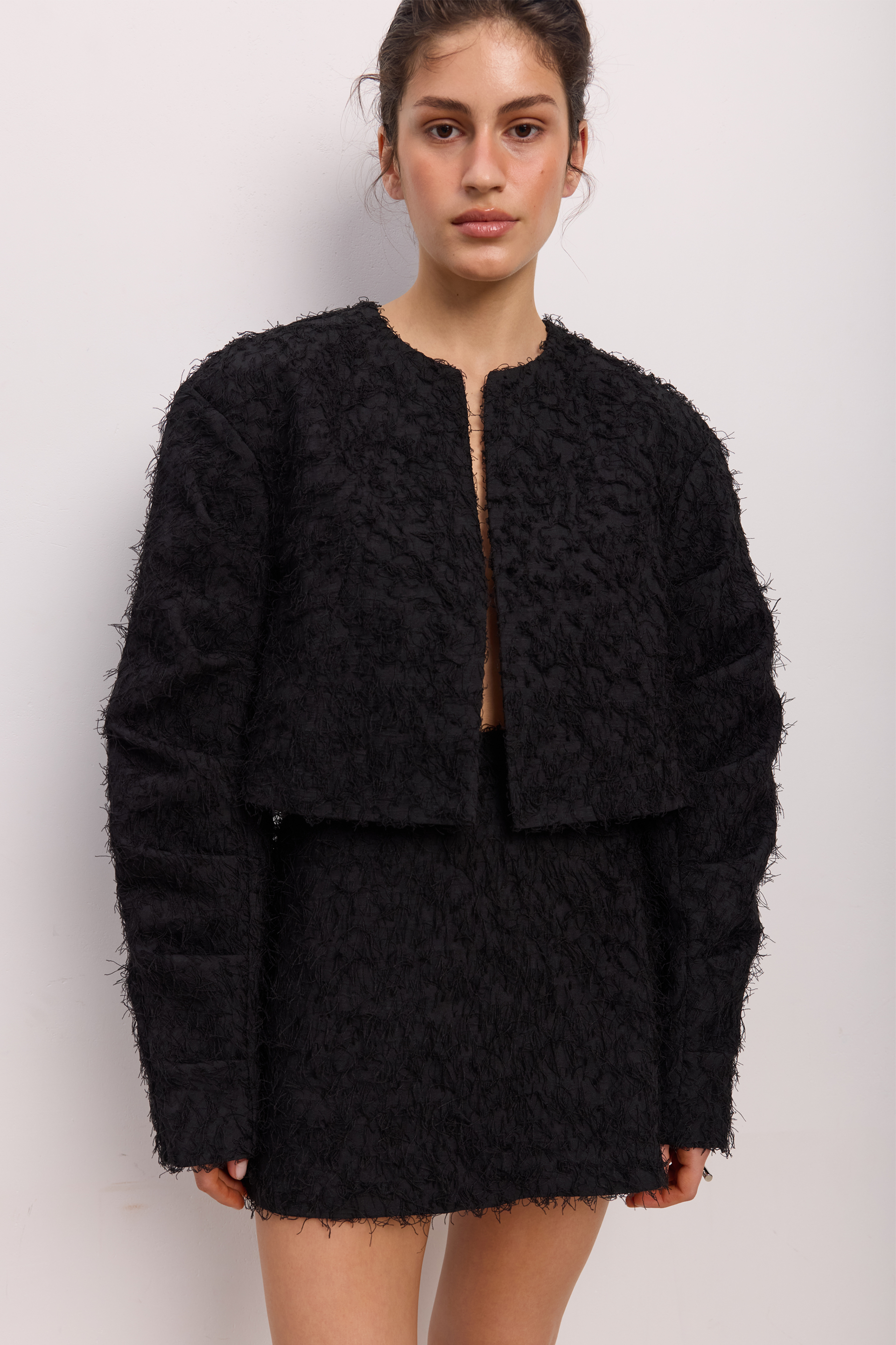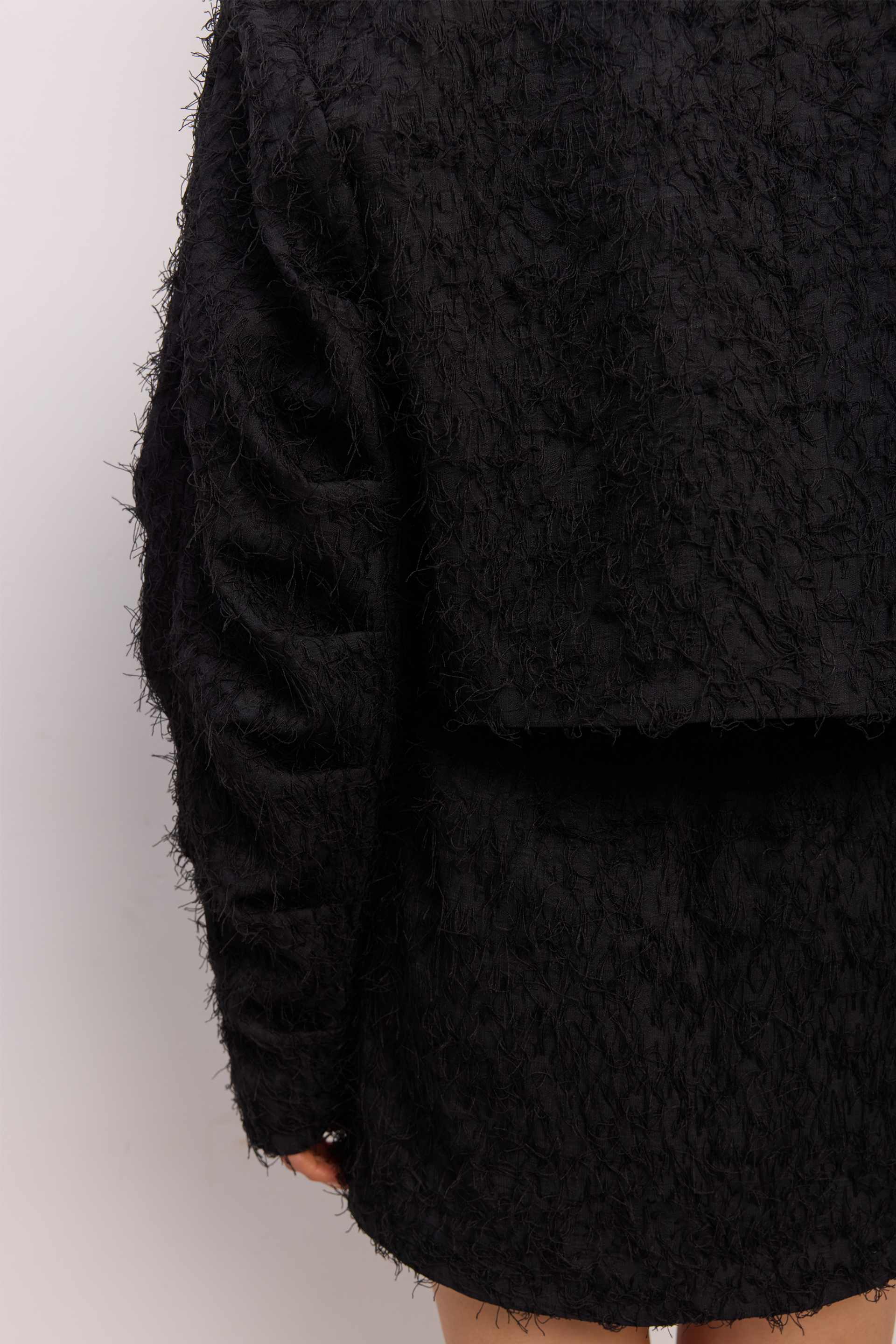 Оверсайз-бомбер зі збіркою на рукаві, пухнастий. Виготовлений з міксу віскози, бавовни та поліестеру, що дарує комфорт та стиль. Ідеальний вибір для створення затишних і модних образів. Гармонійно поєднується з брюками, джинсами або елегантними аксесуарами для завершеного вигляду.