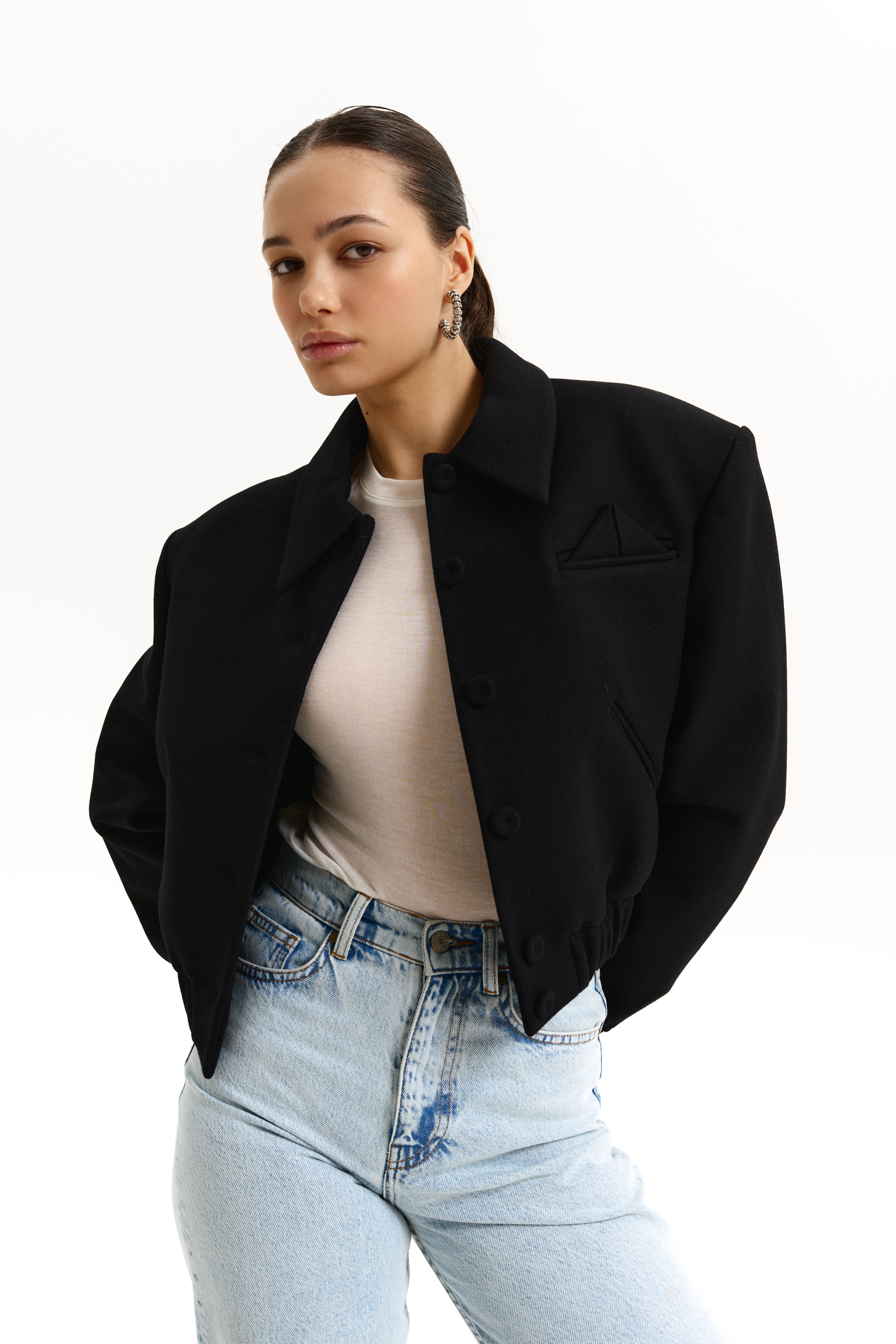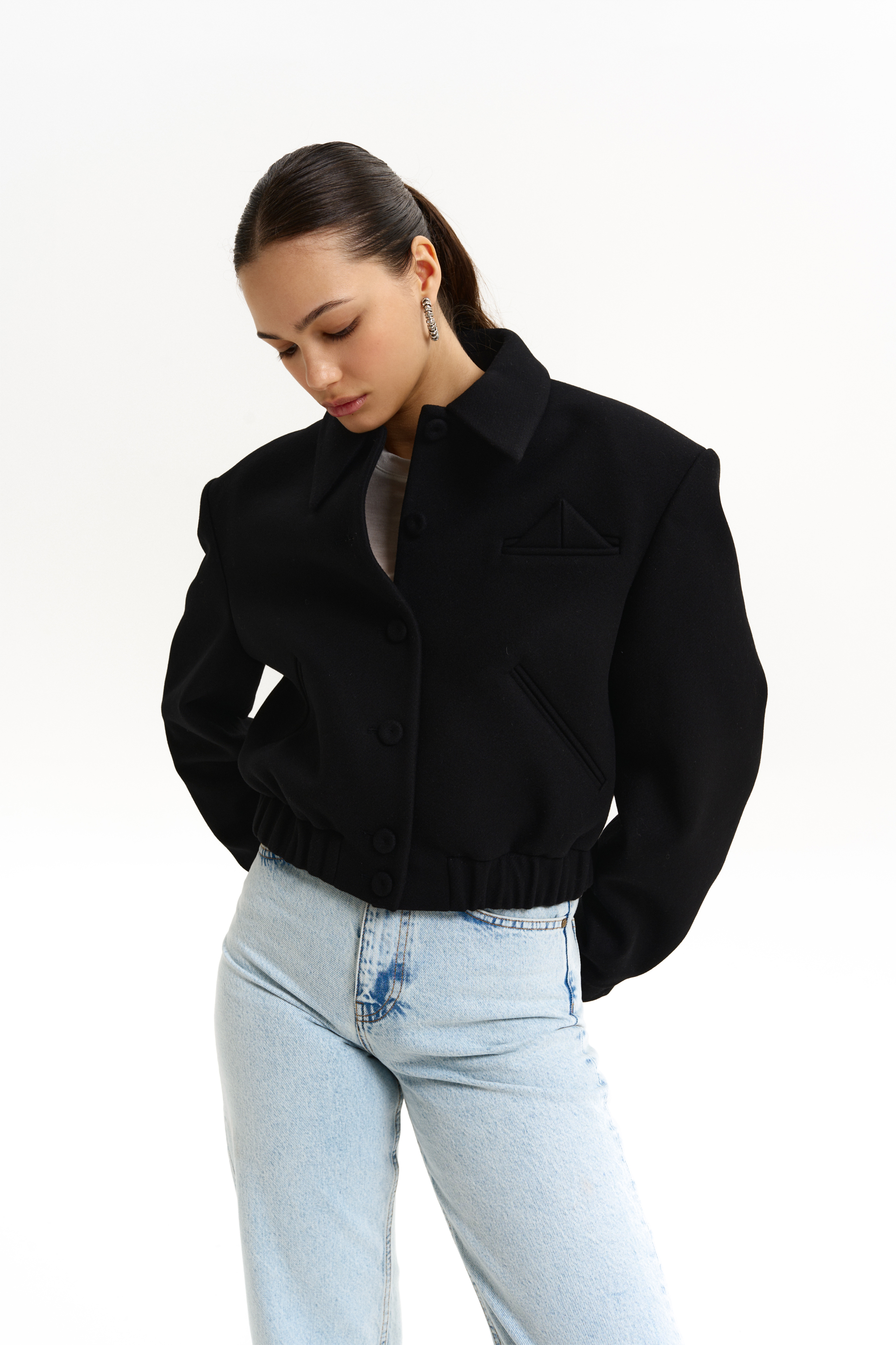 Оверсайз-бомбер на гудзиках з трикутним елементом. Виготовлений із virginwool, що забезпечує тепло і комфорт. Гармонійно виглядає з брюками, спідницею або мінімалістичними аксесуарами, створюючи стильний і затишний образ.