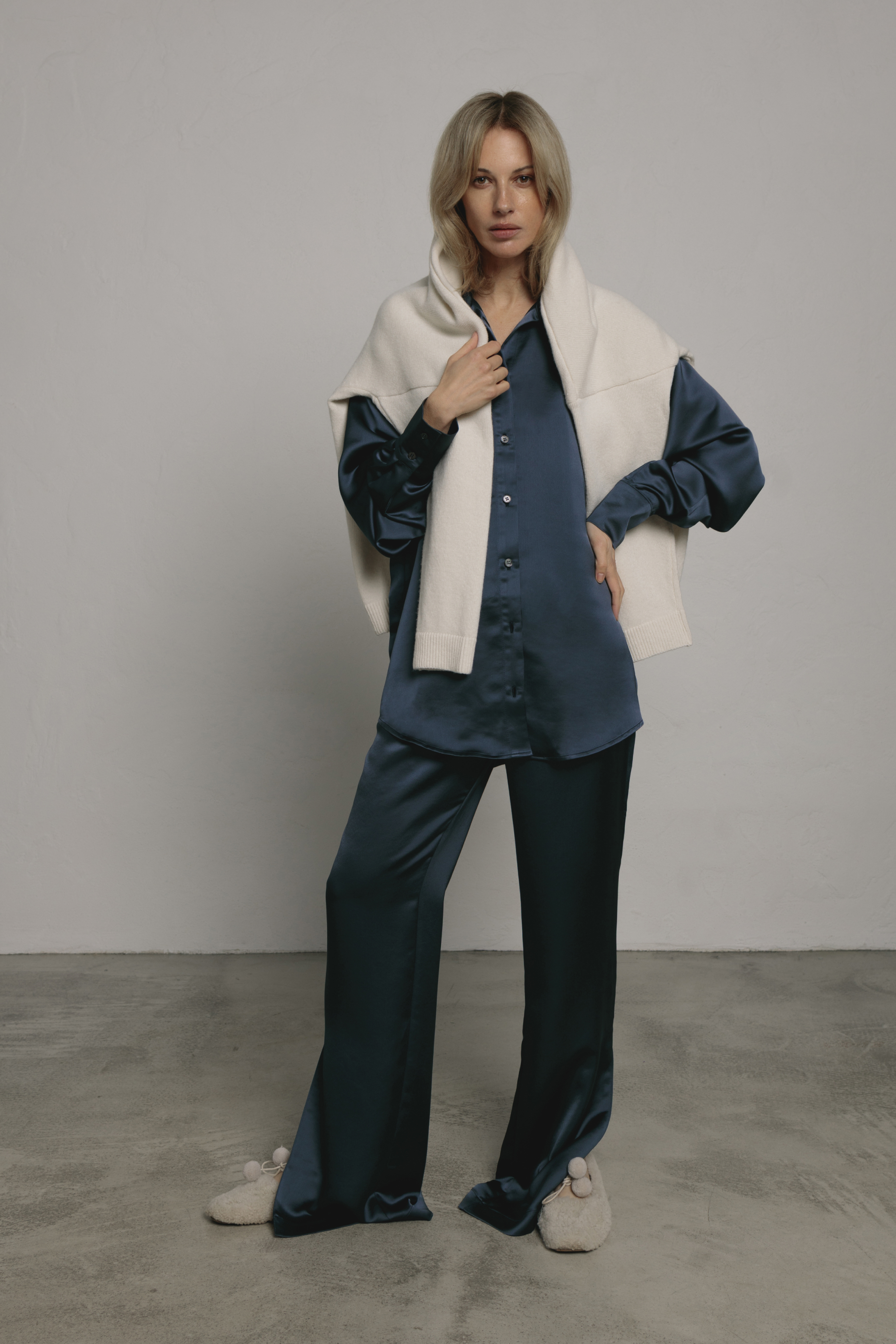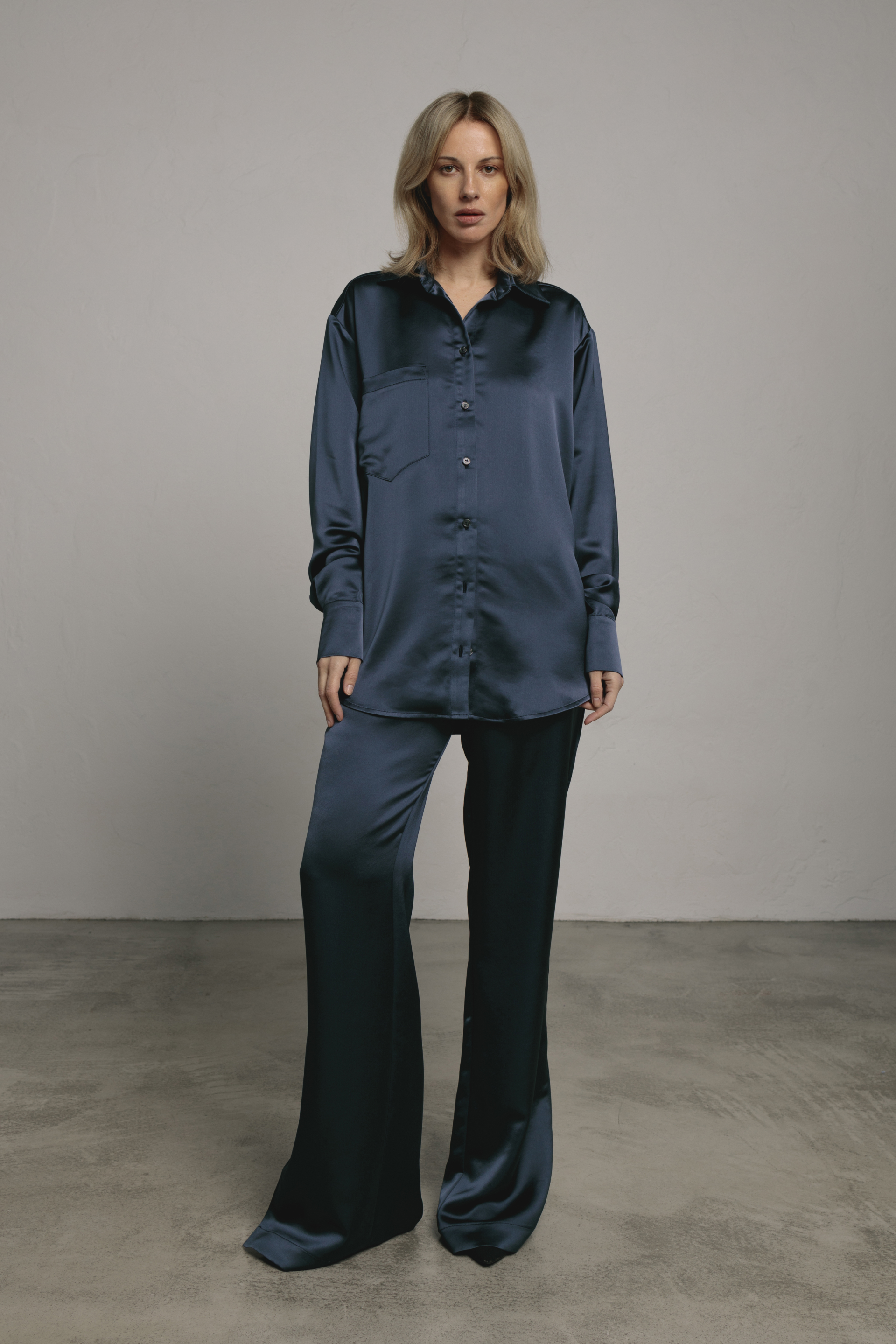 Брюки атласні з розрізами, що додають елегантного вигляду. Виготовлені з віскози та еластану, що забезпечує приємну текстуру і зручну посадку. Ідеально підходять для вечірніх виходів або стильних образів на особливі події. Гармонійно поєднуються з класичними топами чи жакетами.