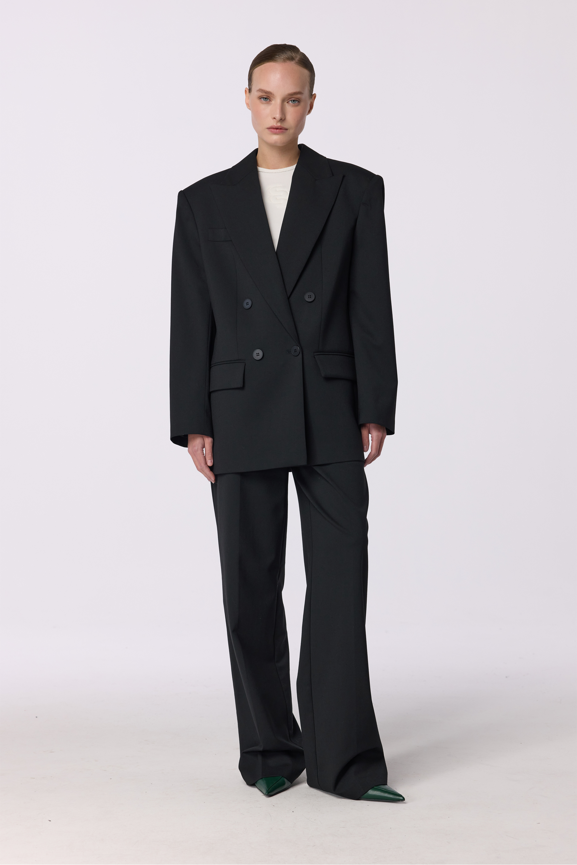 Брюки зі стрілками на середній посадці — графічна чіткість у поєднанні з тактильним комфортом. Виготовлені з virginwool, вони зберігають тепло і тримають форму, залишаючись універсальними для ділових образів або вечірніх виходів. Добре поєднуються з лонгслівом, кардиганом або лаконічним топом.