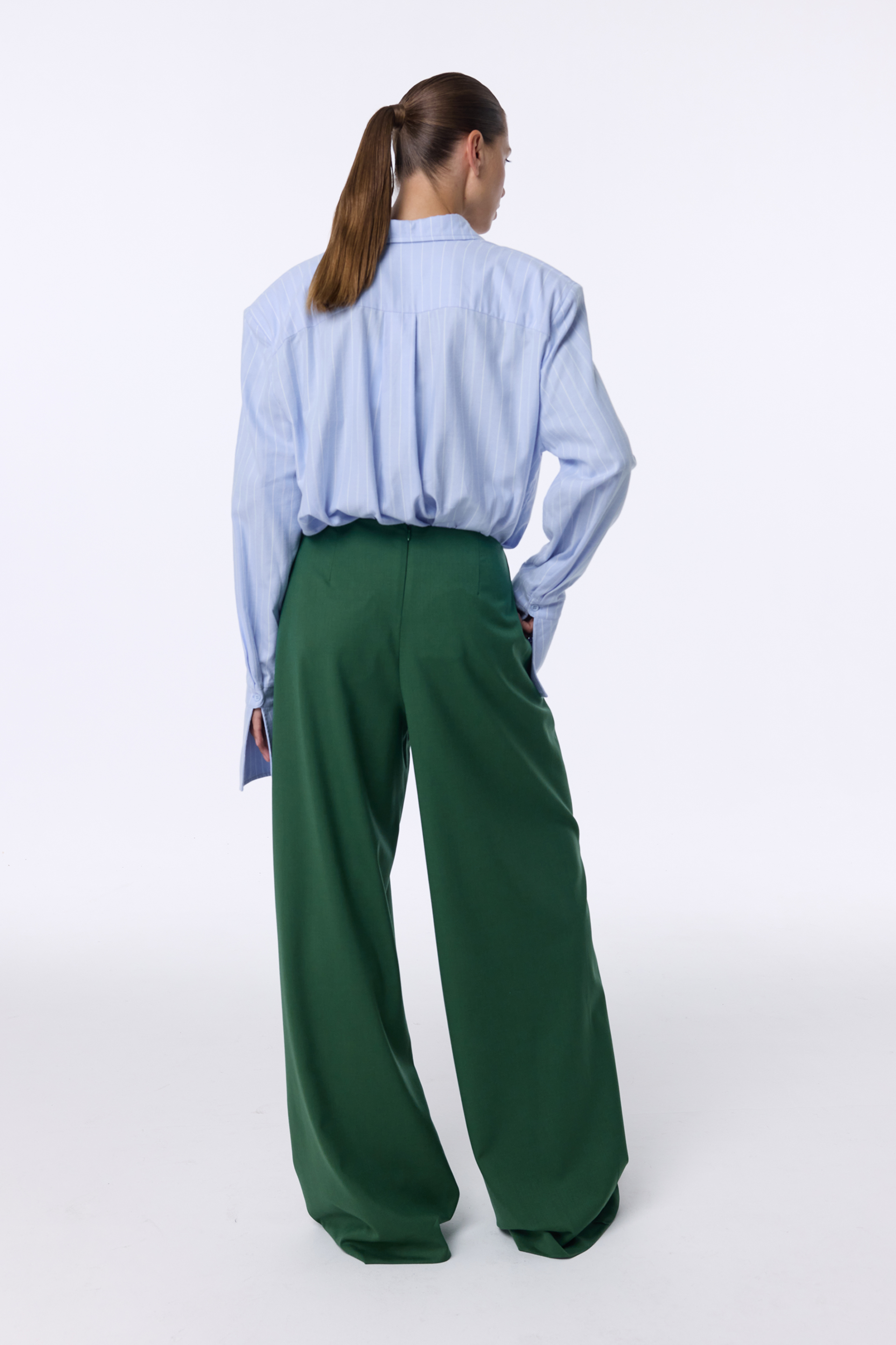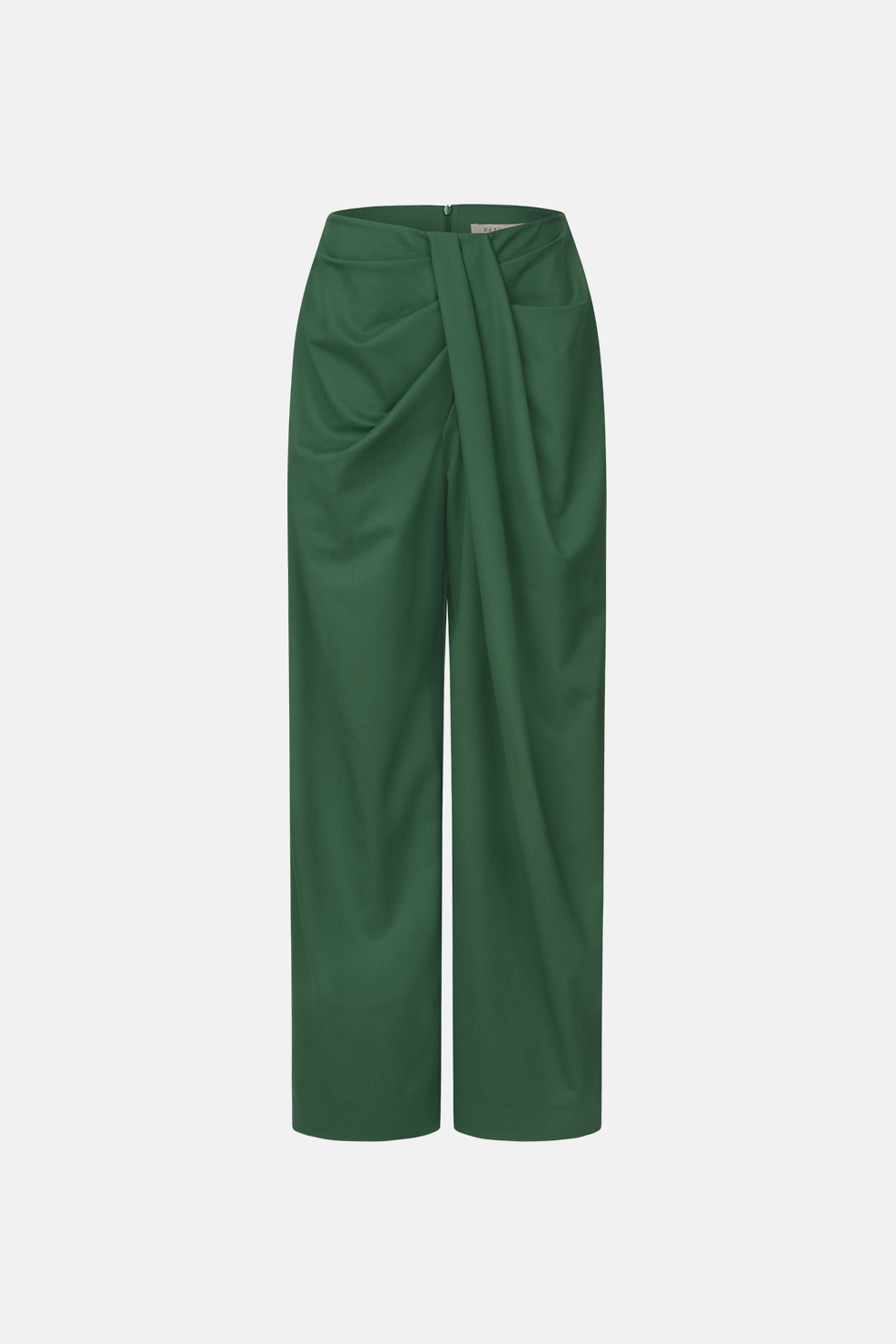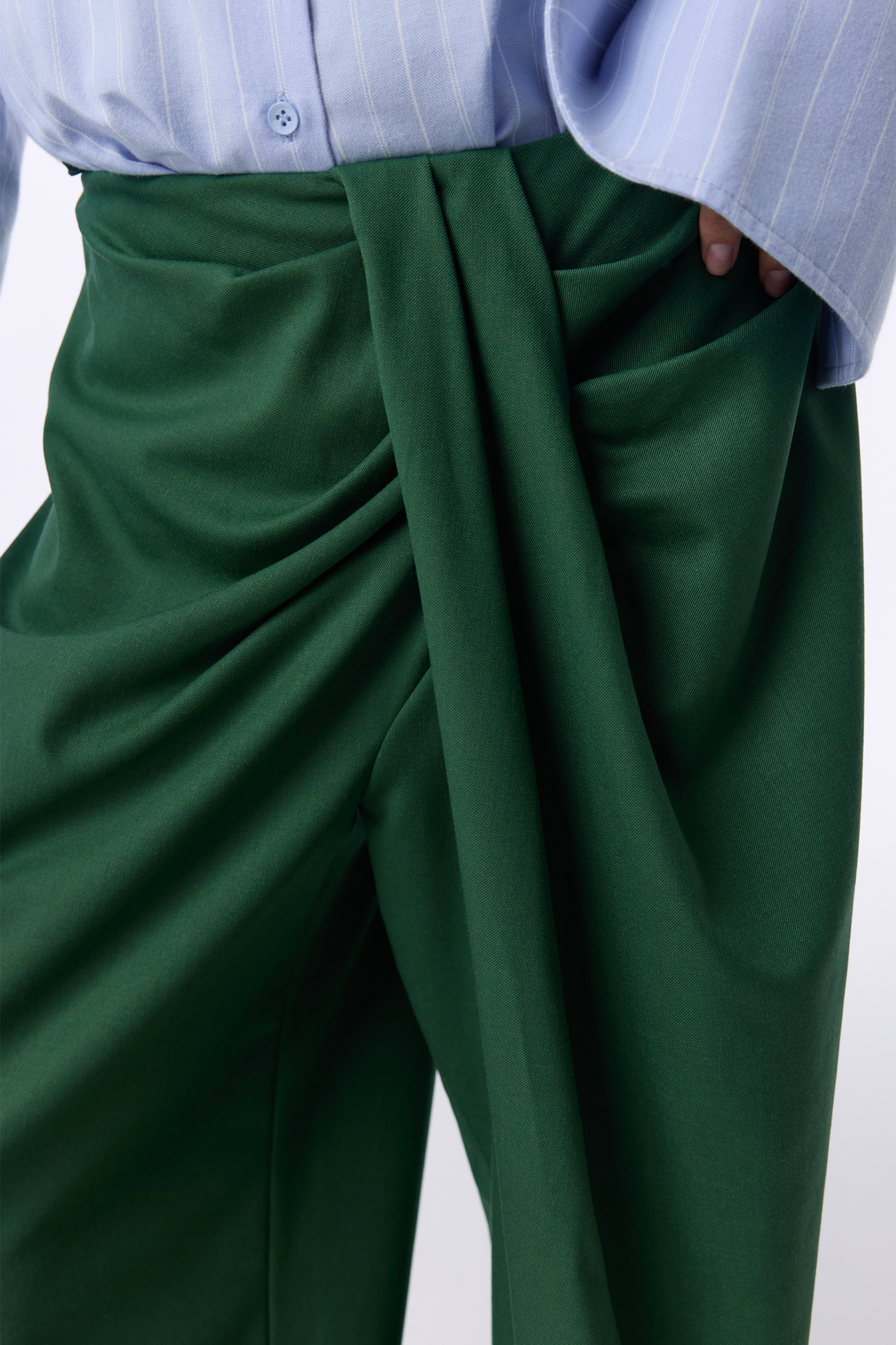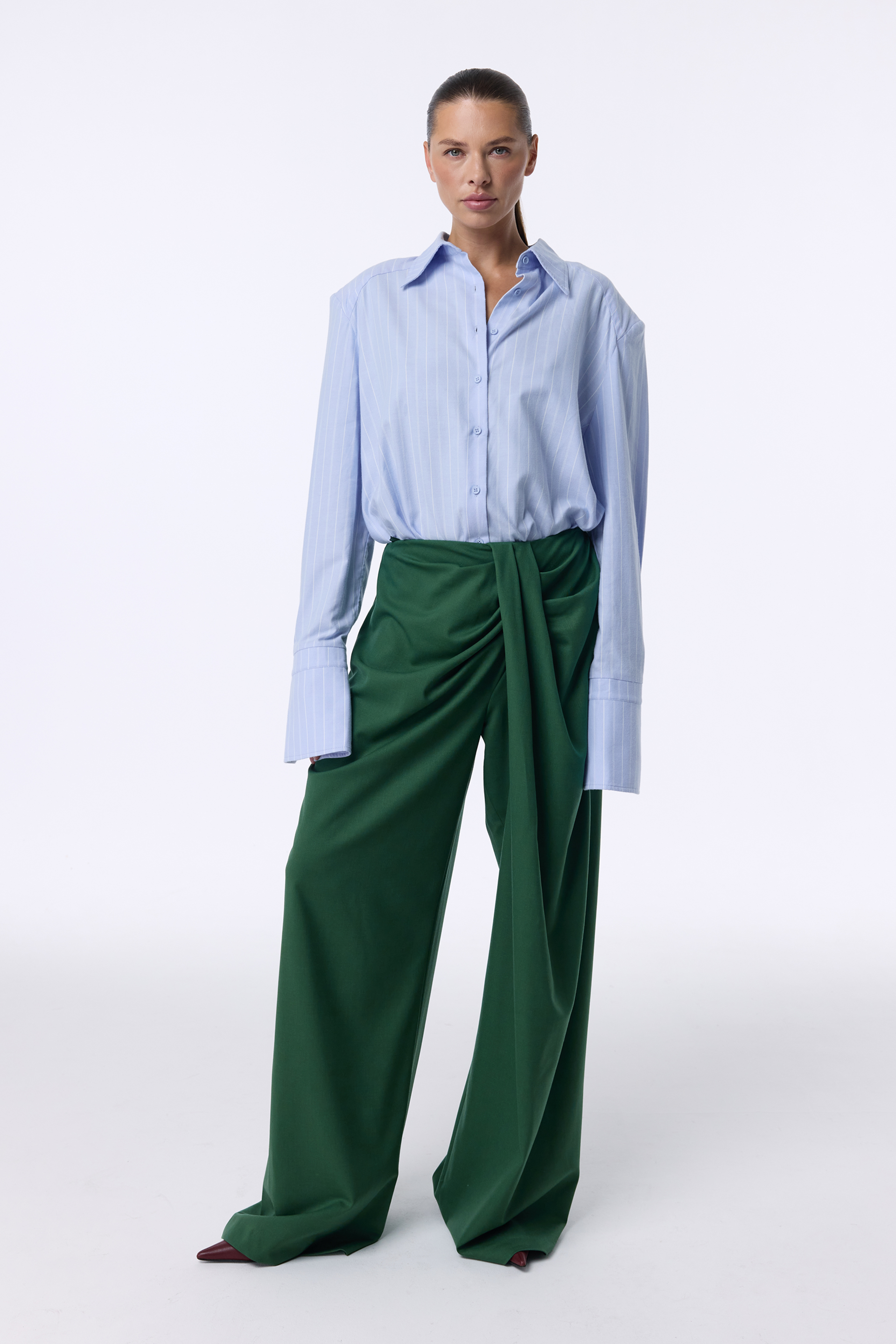 Брюки Cascade pants — поєднання скульптурної форми та легкої динаміки. Глибоке драпірування створює ефект каскаду, що ніби рухається разом із кроком. Широкий силует додає свободи, а тканина virginwool зберігає чіткість ліній і вишуканість у будь-якому поєднанні — від мінімалістичного топа до класичного жакета.