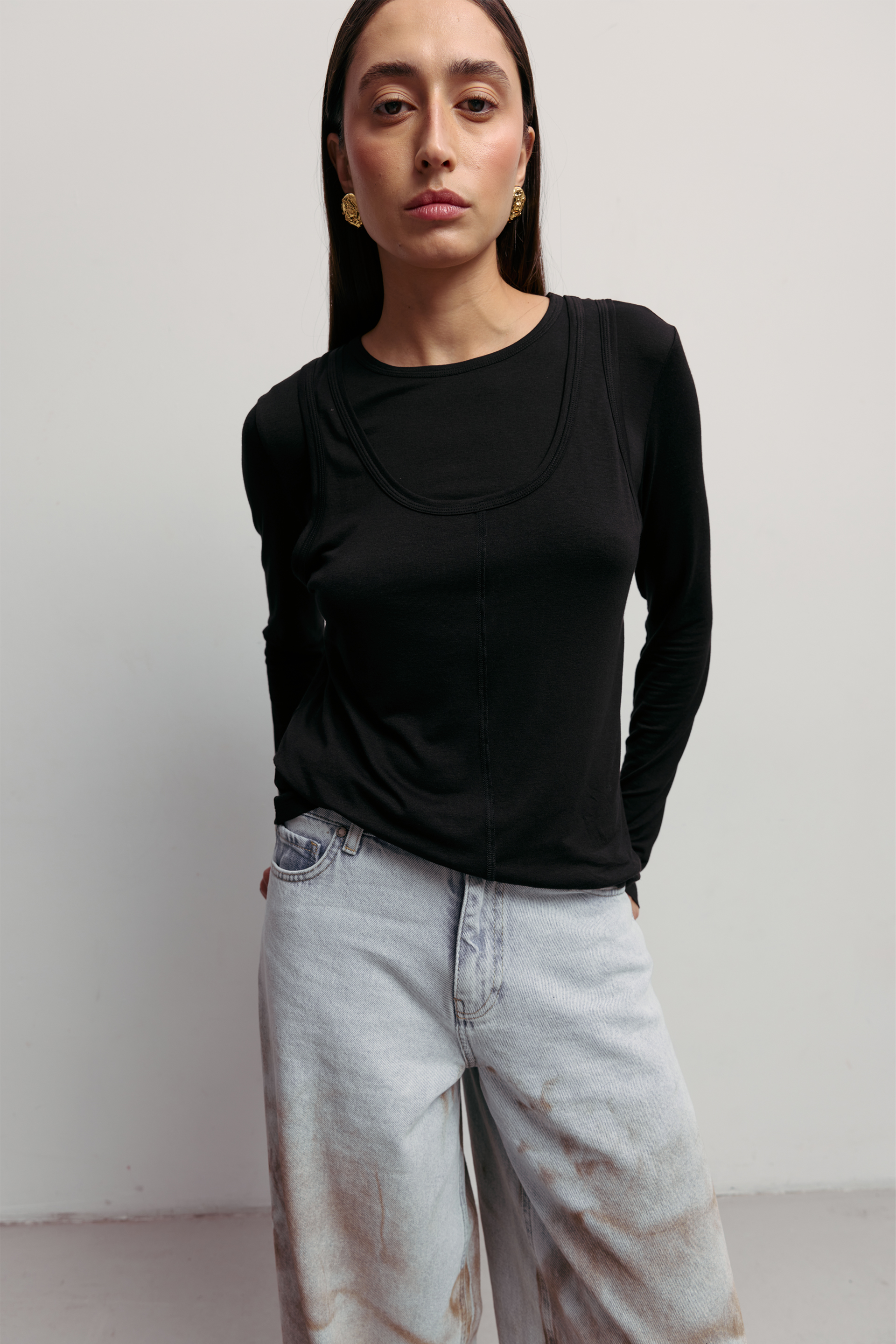 Лонгслів Double — це стильне та комфортне рішення для будь-якого сезону. Виконаний з міксу віскози, вовни та еластану, що дарує м’якість, легкість і гарну посадку по фігурі. Подвійний шар тканини, та силует майки додає об'єму та унікального вигляду, роблячи цю модель ідеальною для створення як повсякденних, так і більш вишуканих образів.