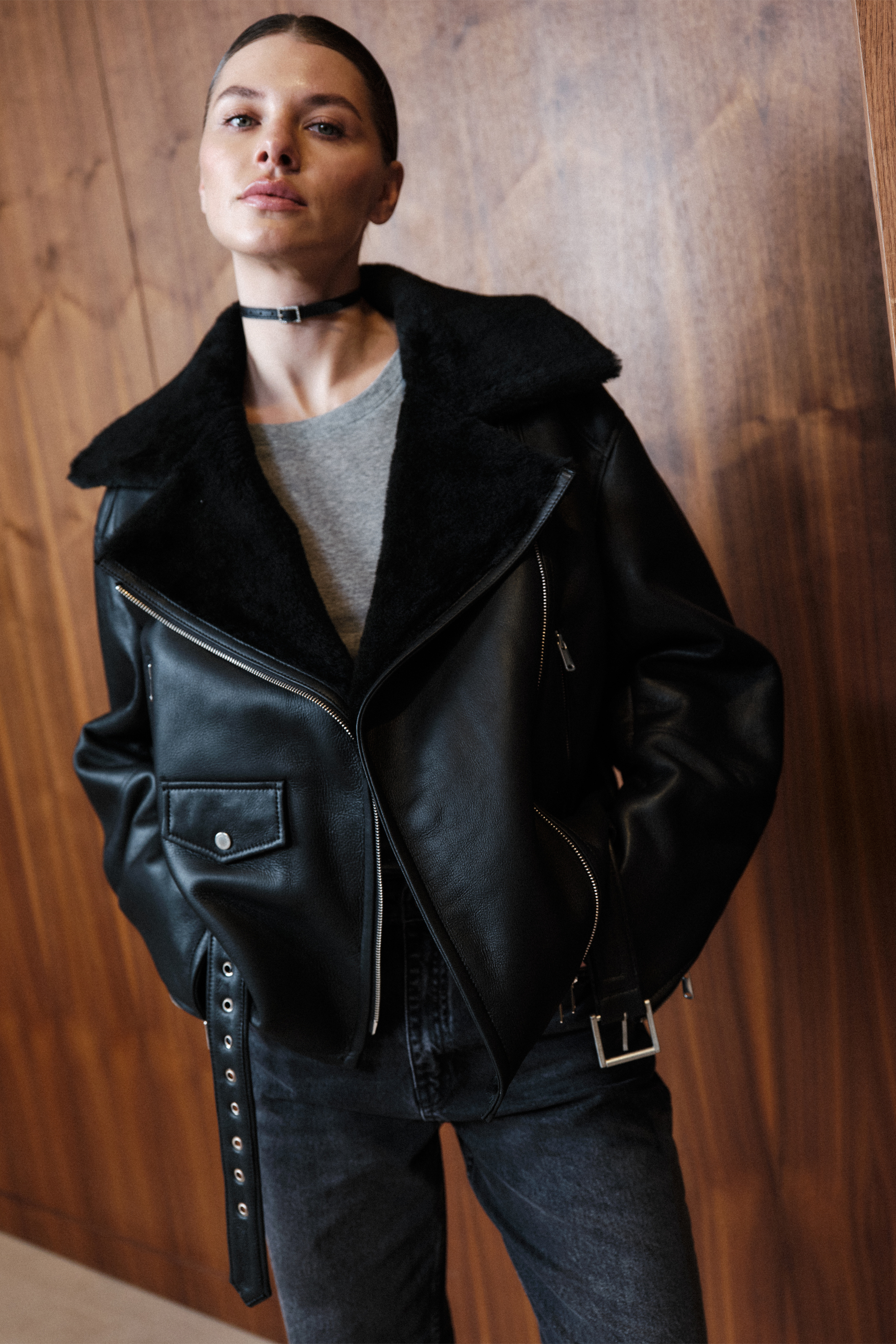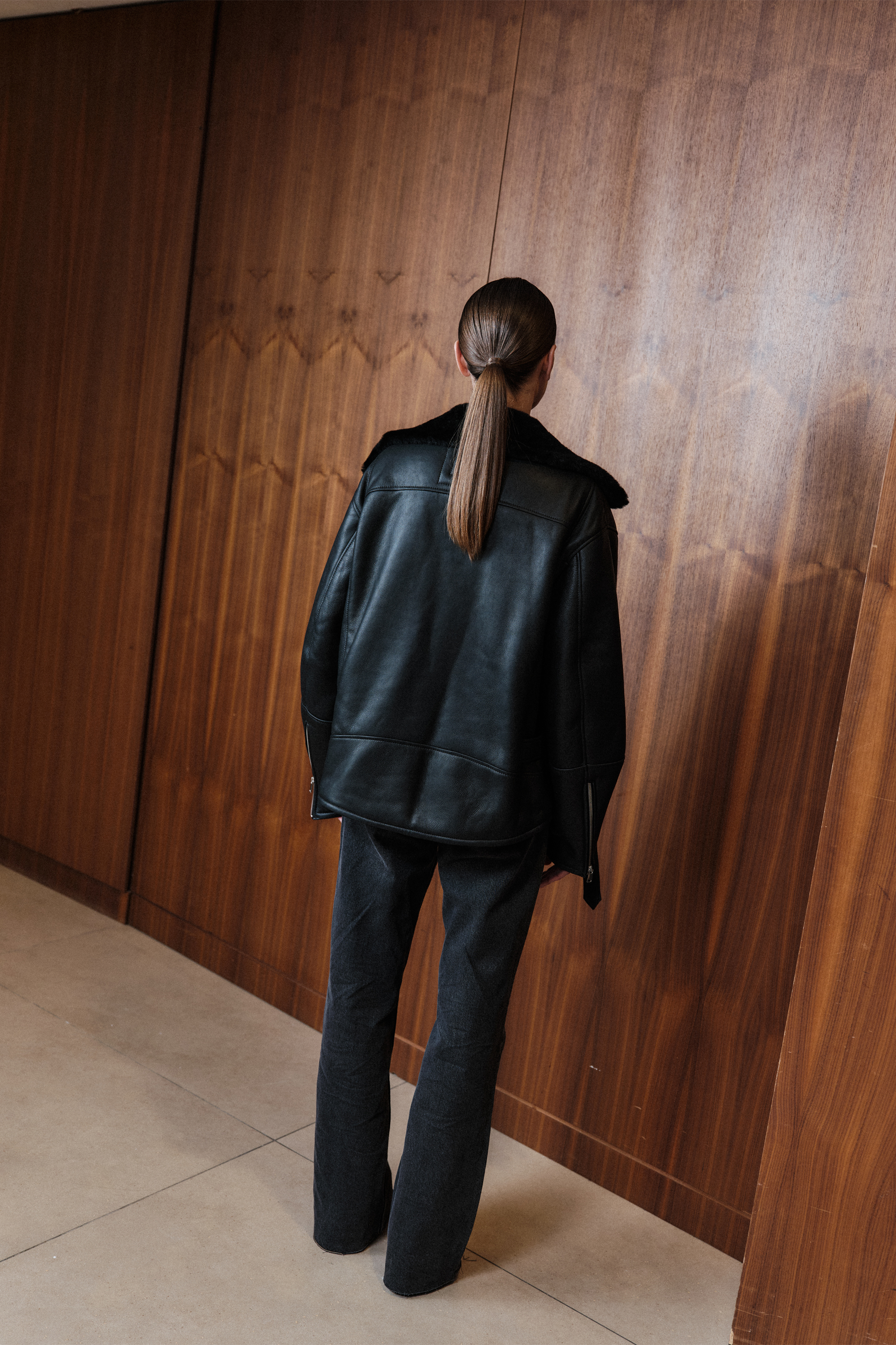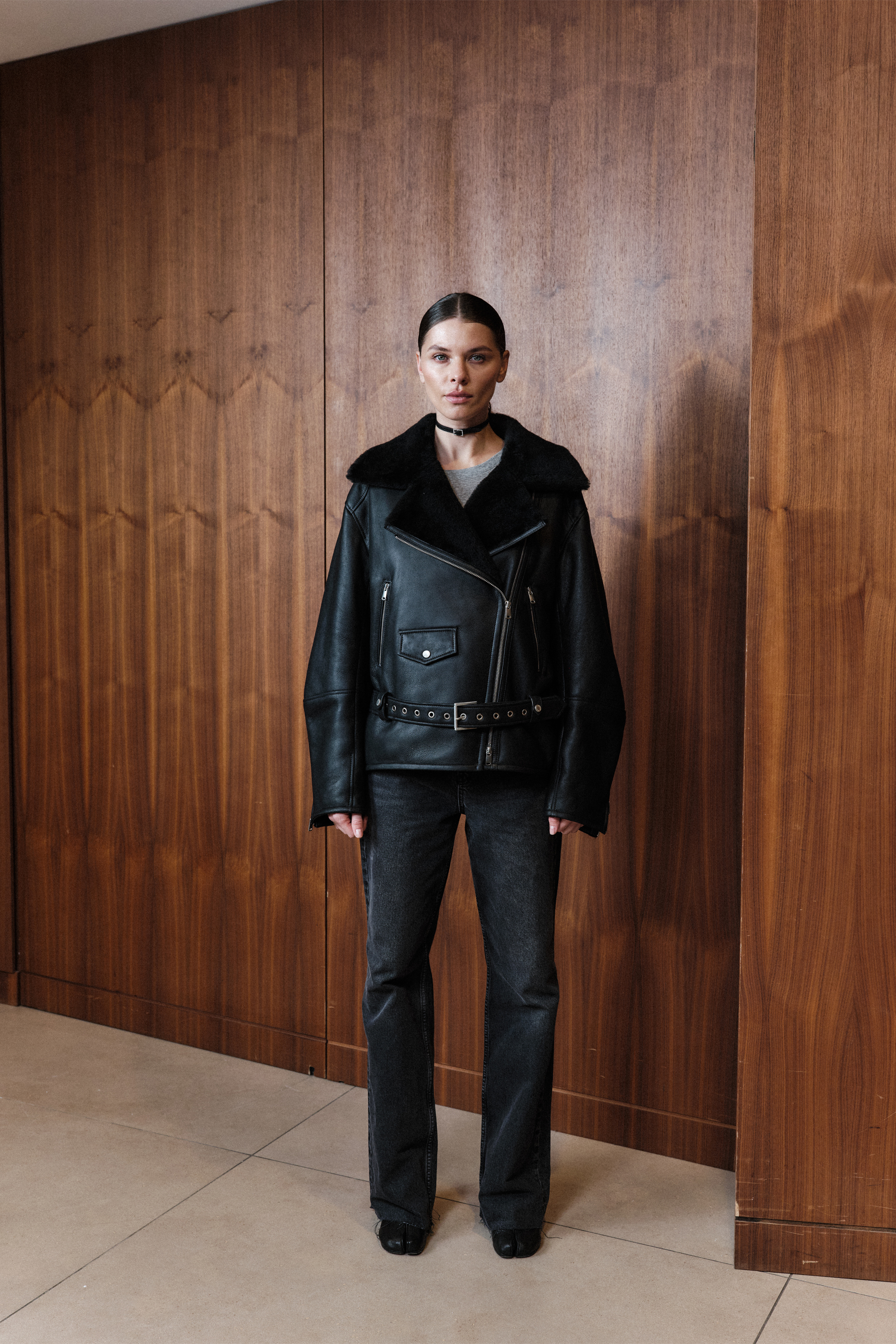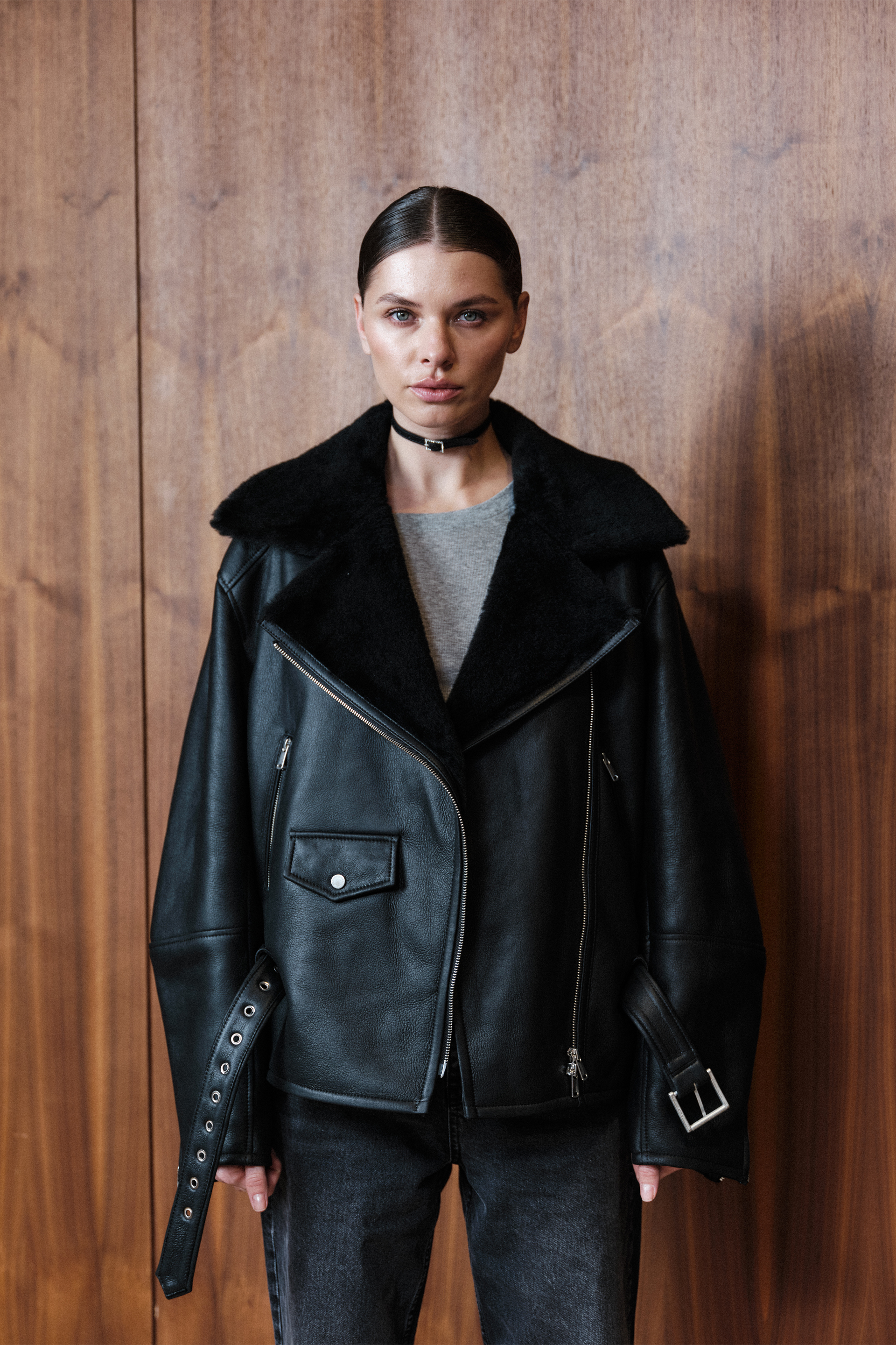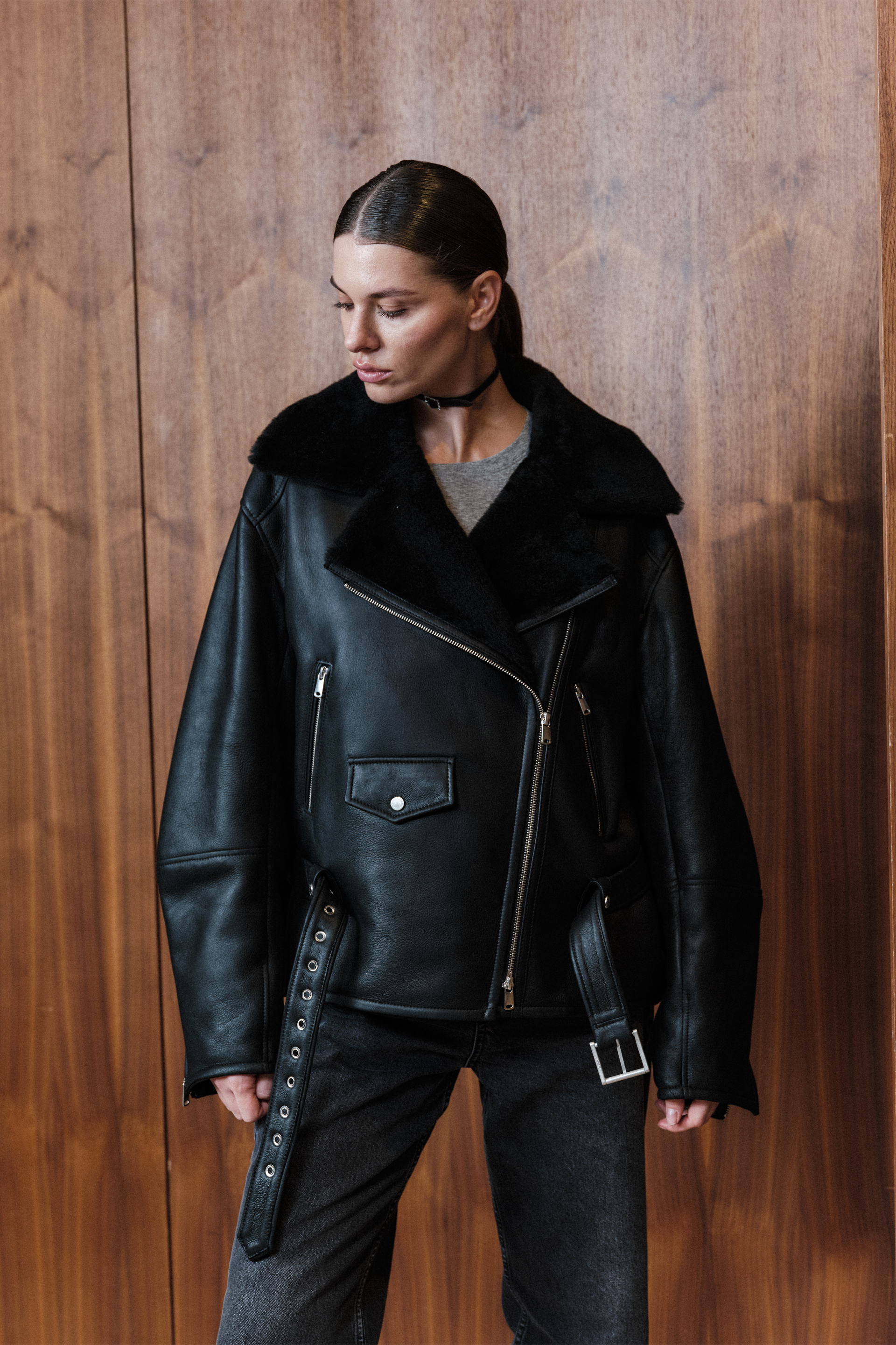 Дублянка оверсайз з ременем і накладними кишенями, виготовлена з натуральної шкіри з чорним хутром. Створює стильний та комфортний образ, додаючи тепла в холодну пору року. Ідеально підходить для елегантних зимових луків, легко поєднується з брюками, сукнями чи лонгслівами для завершеного вигляду.