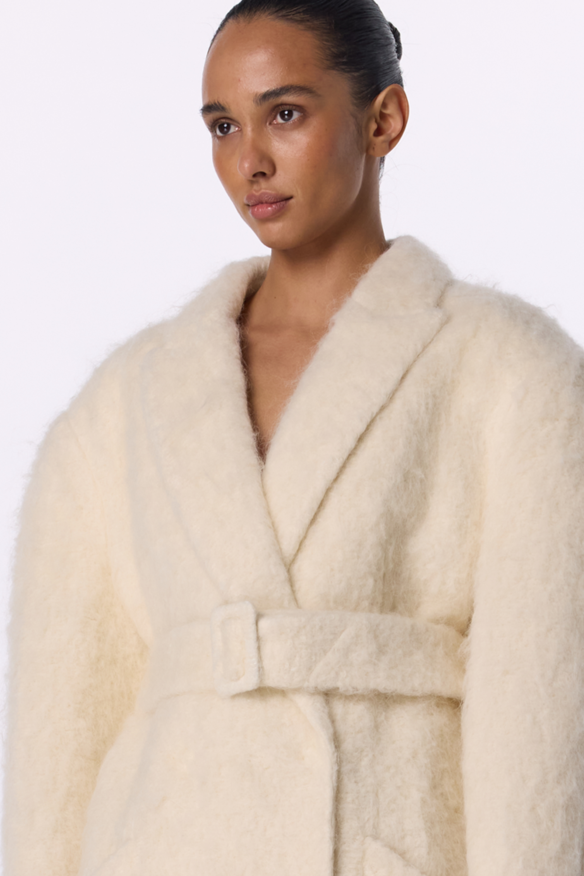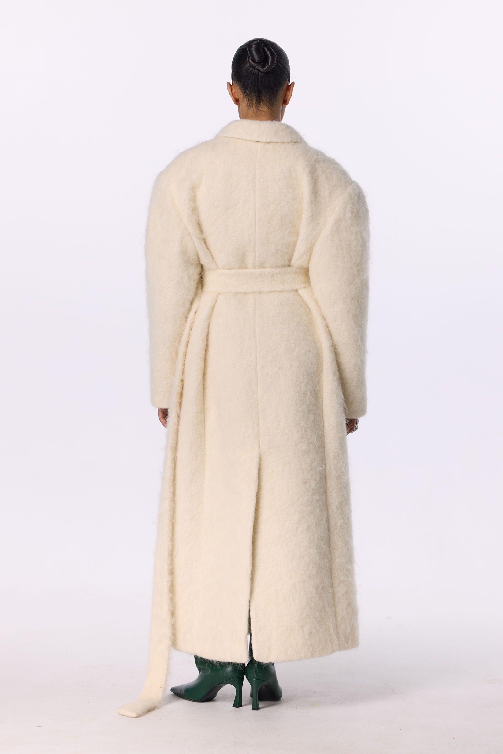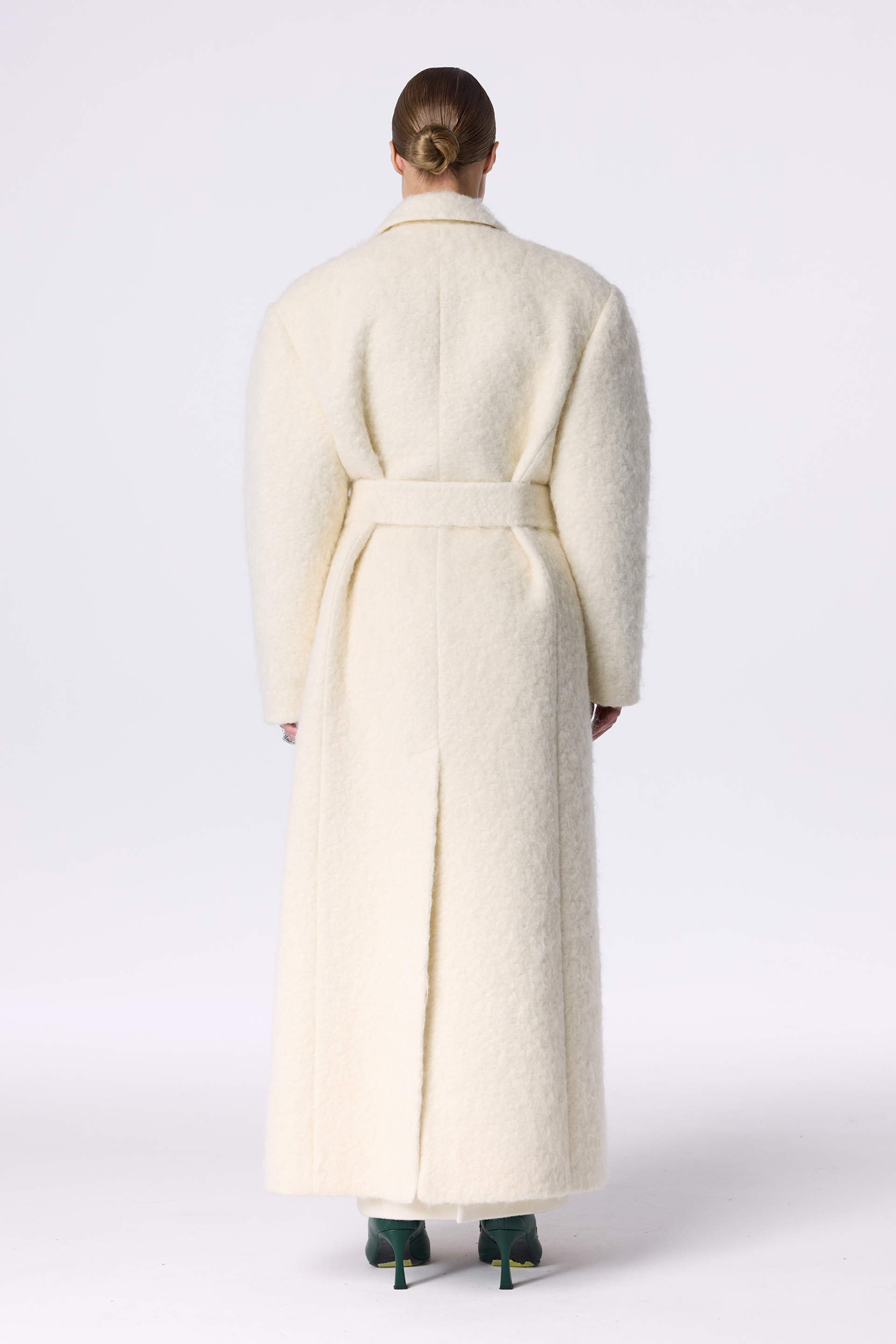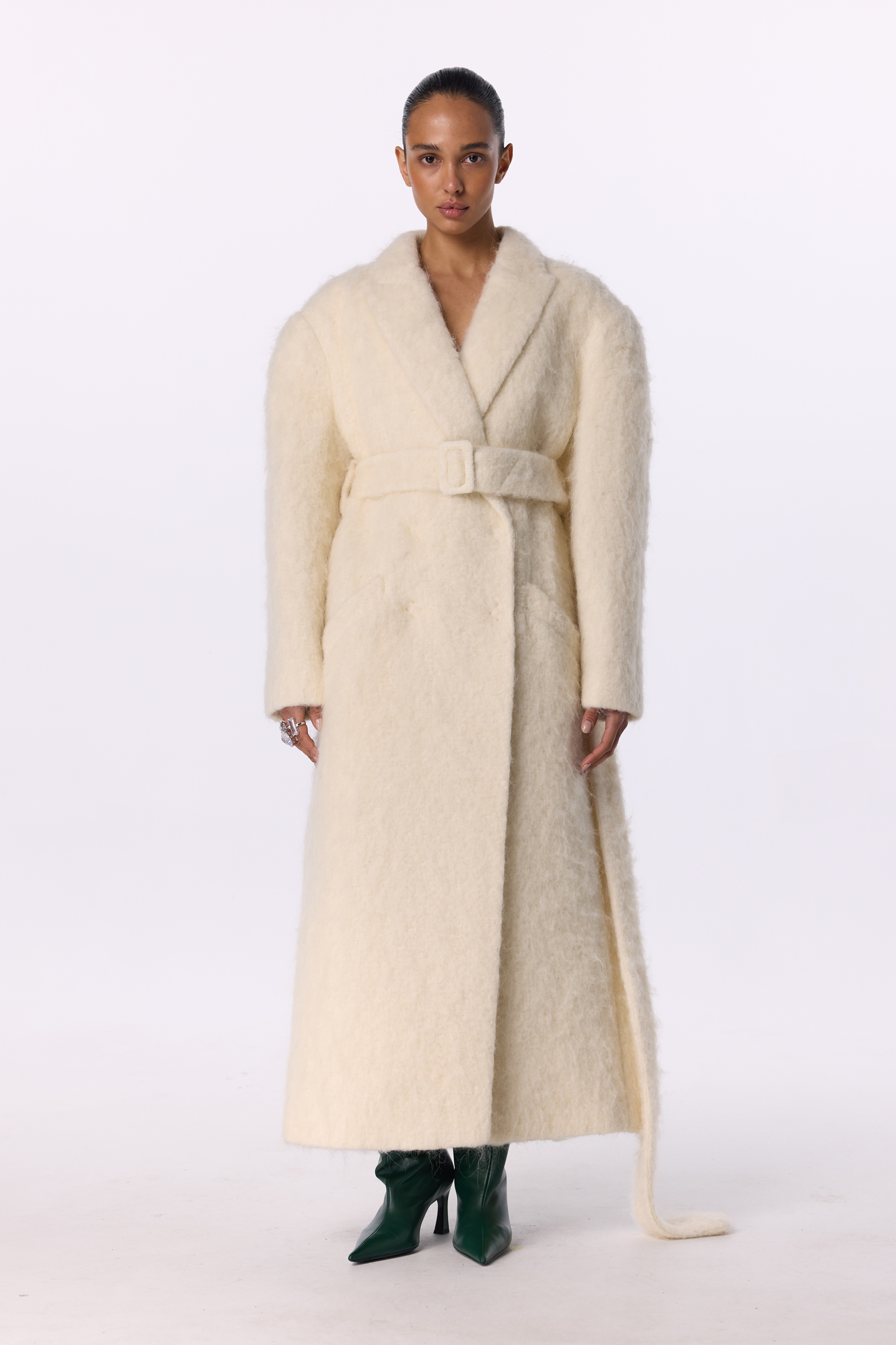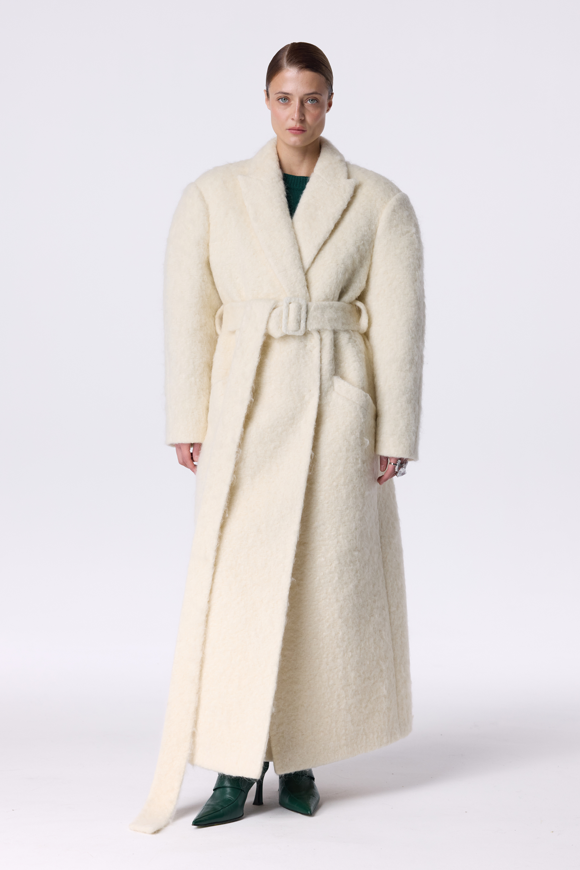 Пальто оверсайз прямого крою з акцентним плечем — вишукана двобортна модель, виготовлена з міксу virginwool, мохеру та альпаки. Подовжений фасон додає образу елегантності, а прямий крій формує сучасний вільний силует. Косі кишені та декоративний трикутничок виступають стильними акцентами. Пальто має комфортну помірну оверсайз посадку та розраховане на носіння при температурі до -10°C.