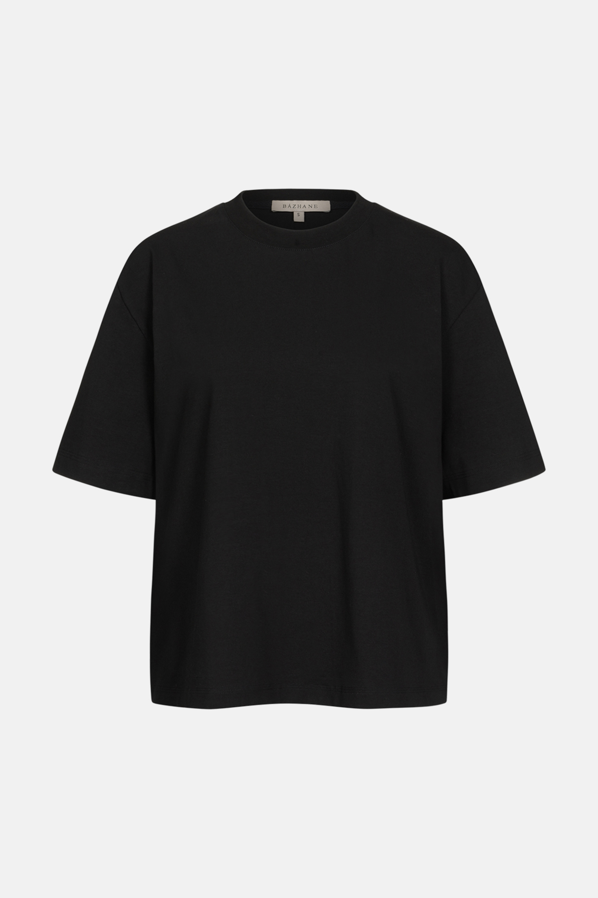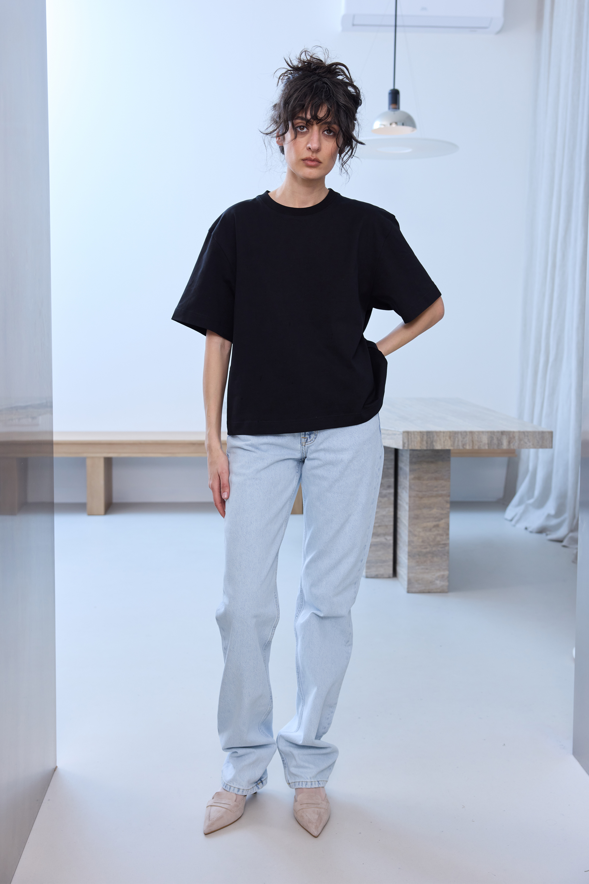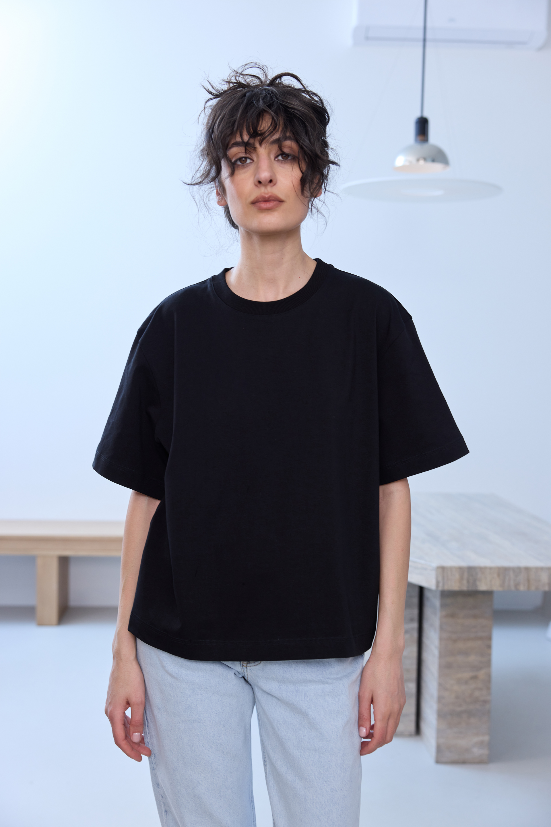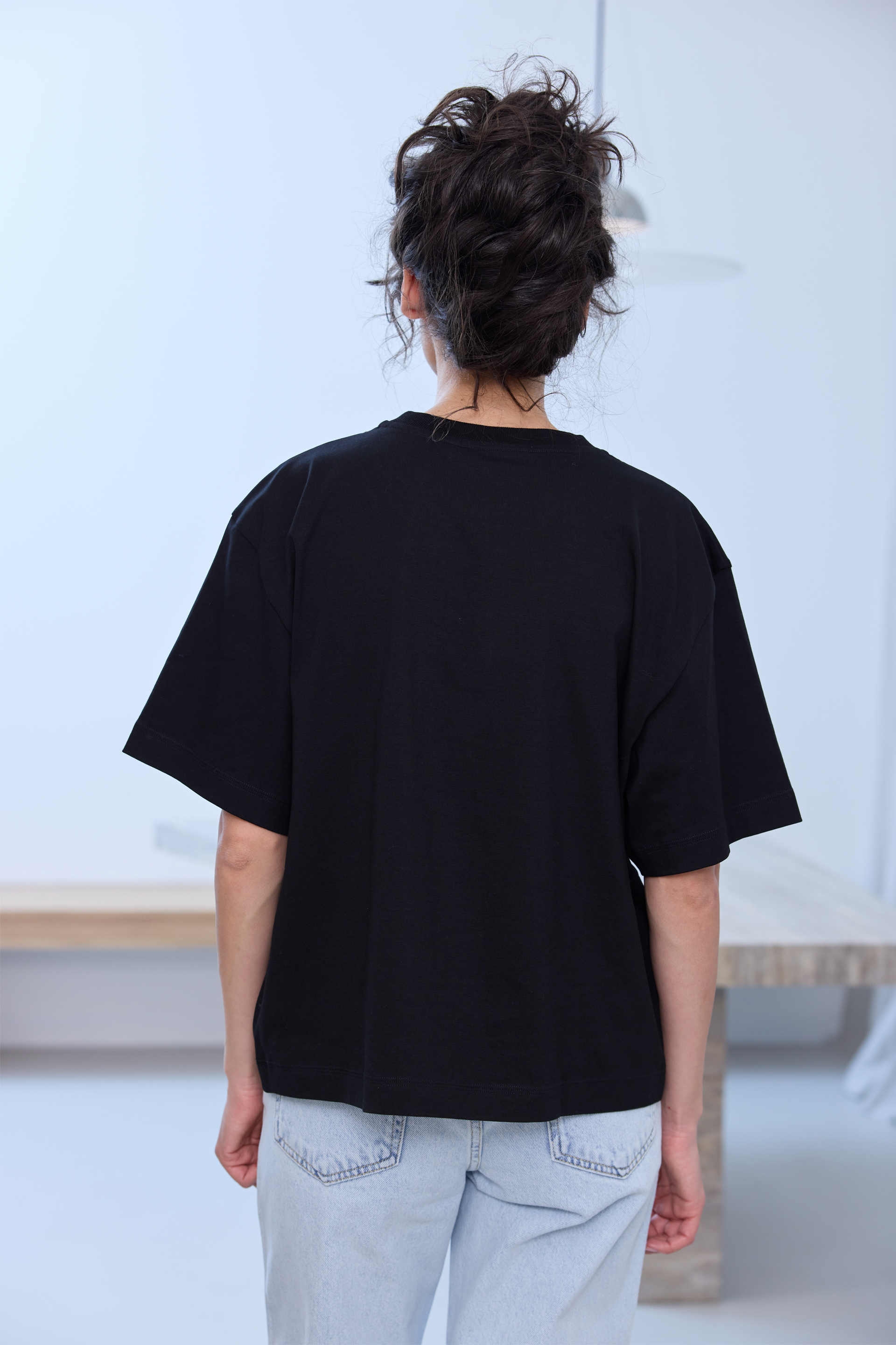 Укорочена футболка oversize — базова річ із модним акцентом. Виконана з бавовни з додаванням еластану, вона дарує м’якість, еластичність і комфорт у щоденному носінні. Вільний укорочений силует формує легкий, сучасний образ, що легко адаптується до різних стилів. Гармонійно поєднується з джинсами, брюками або шортами, створюючи завершені повсякденні луки.