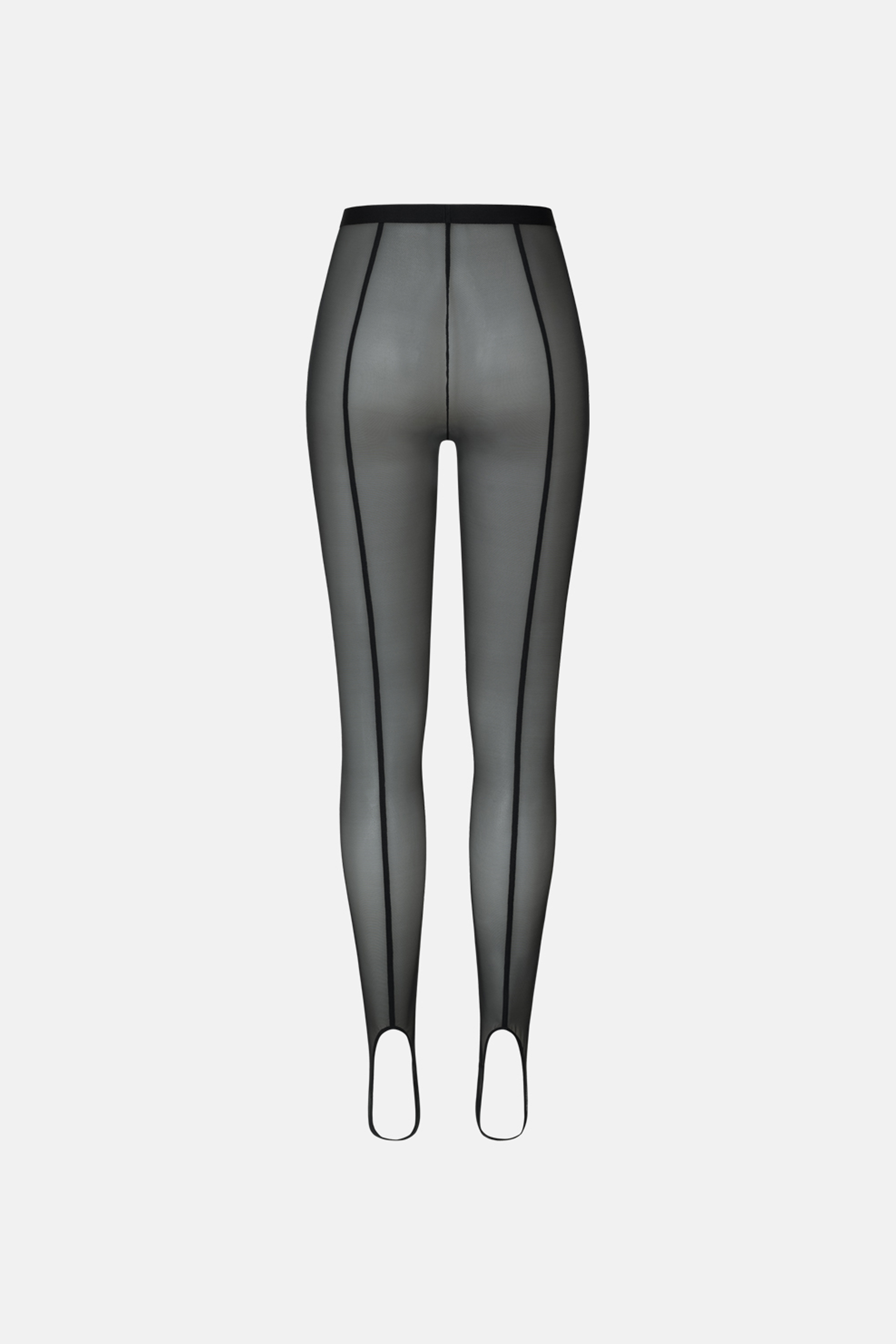 Легінси Gartered підкреслюють силует завдяки напівпрозорій еластичній тканині та витонченим вертикальним швам. Особливий акцент — фігурні вирізи з фіксацією під стопою, що відсилають до естетики підв’язок і додають образу сміливого характеру. Модель балансує між класичним мінімалізмом і сучасним акцентом.