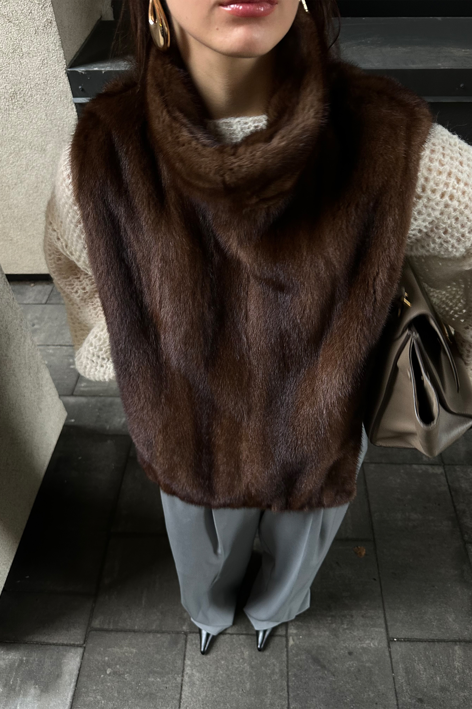 Вінтажна норкова манішка — розкішний аксесуар із натурального хутра норки, що поєднує тепло і елегантність. Коричневий відтінок і стоячий комір додають образу вишуканості та впевненого характеру. Параметри манішки дозволяють м’яко огортати шию та плечі, створюючи виразний і затишний акцент у холодний сезон. BAZHANE відроджує вінтажне хутро, переосмислюючи його через рух reuse та recycle — ця манішка створена, щоб продовжити життя унікальному матеріалу з минулого.