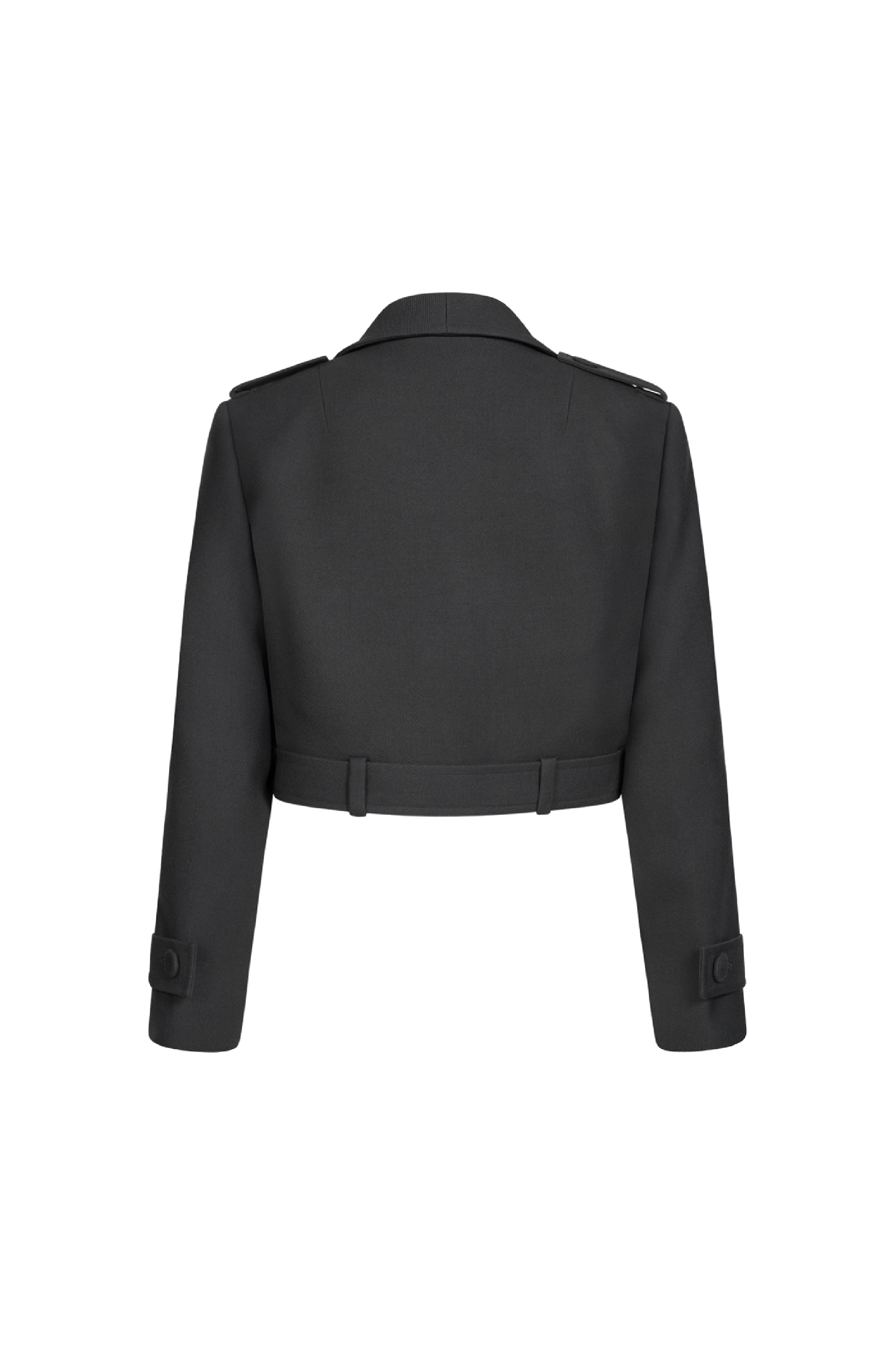 Пальто кроп з об'ємними плечами і пагонами, виготовлене з Virginwool та поліаміду, що надає виробу міцність і водночас зберігає комфортну теплоту. Тканина також має підвищену стійкість до зношування і сприяє збереженню форми виробу. Ідеально підходить для осінньо-зимових образів, коли важливий баланс між комфортом і виглядом. Гармонійно поєднується з брюками, спідницями або класичними аксесуарами.