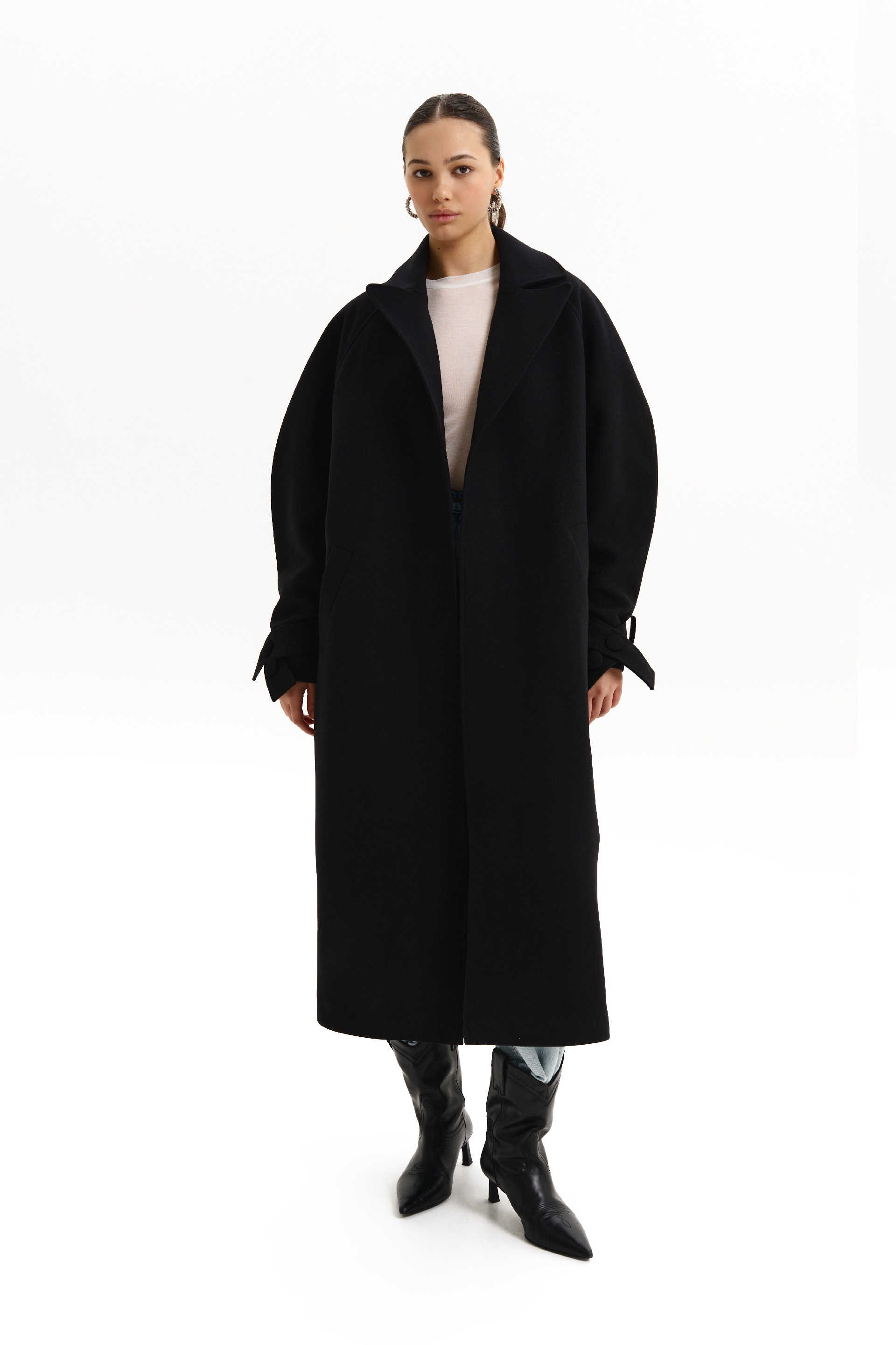 Пальто максі зі спущеним рукавом і поясом з пряжкою. Виготовлене з вовни, що забезпечує тепло та комфорт у прохолодну пору року. Лаконічний фасон із поясом акцентує талію, додаючи витонченості силуету. Ідеальний вибір для класичних і стильних образів. Гармонійно доповнюється шарфами, рукавицями чи витонченими аксесуарами.