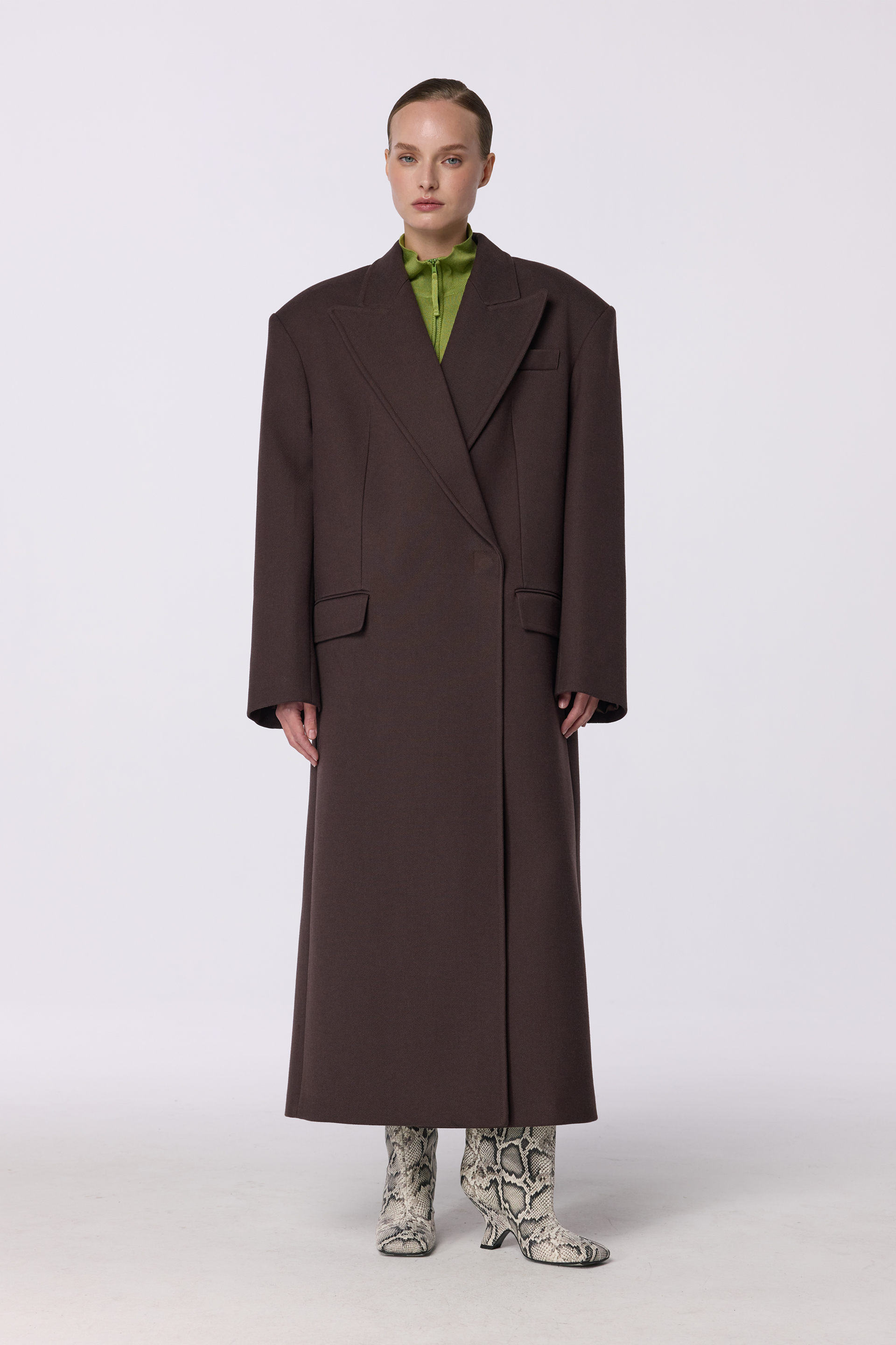 Пальто оверсайз прямого крою з акцентним плечем — довга елегантна модель, виготовлена з virginwool, що дарує тепло та комфорт у холодну пору року. Вільний силует та продуманий дизайн додають образу сучасності та стриманого шику. Ідеально поєднується з брюками, спідницями чи базовими речами для створення завершеного образу. Розраховане на комфортне носіння в температурному діапазоні від 0 до +5°C.