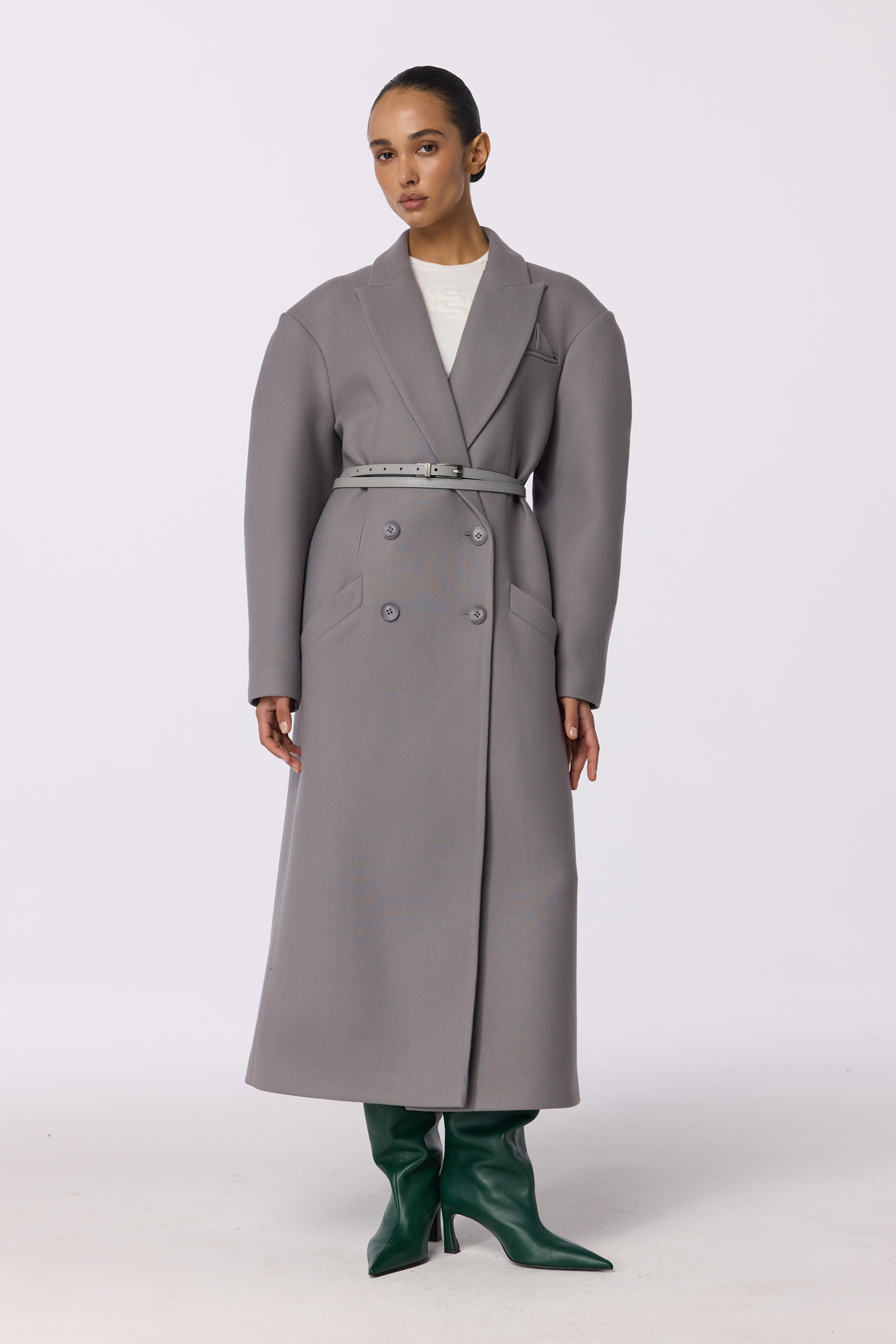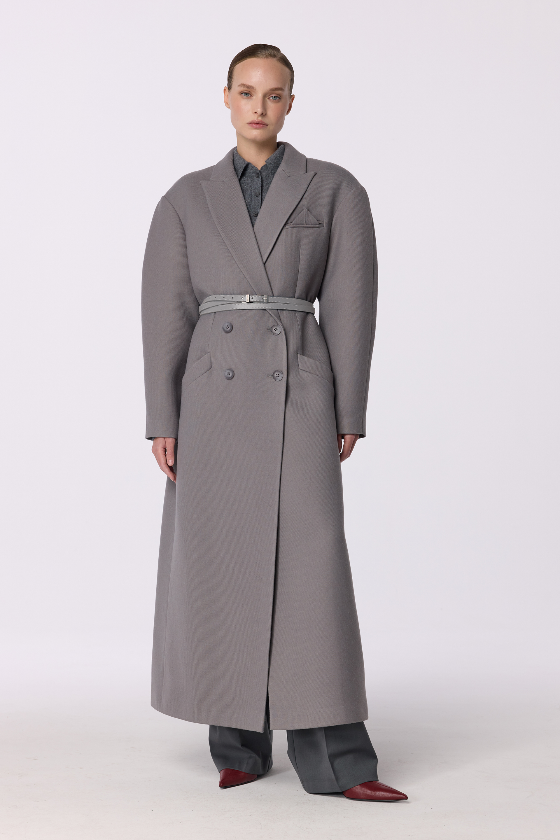 Пальто оверсайз прямого крою двобортне з акцентним плечем — вишукана модель, виконана з virginwool. Довжина додає елегантності, а прямий крій створює вільний та сучасний силует. Косі кишені та трикутний елемент додають цікаві деталі, підкреслюючи стиль. Пальто призначене для комфортного носіння при температурі від 0 до +5 °C.