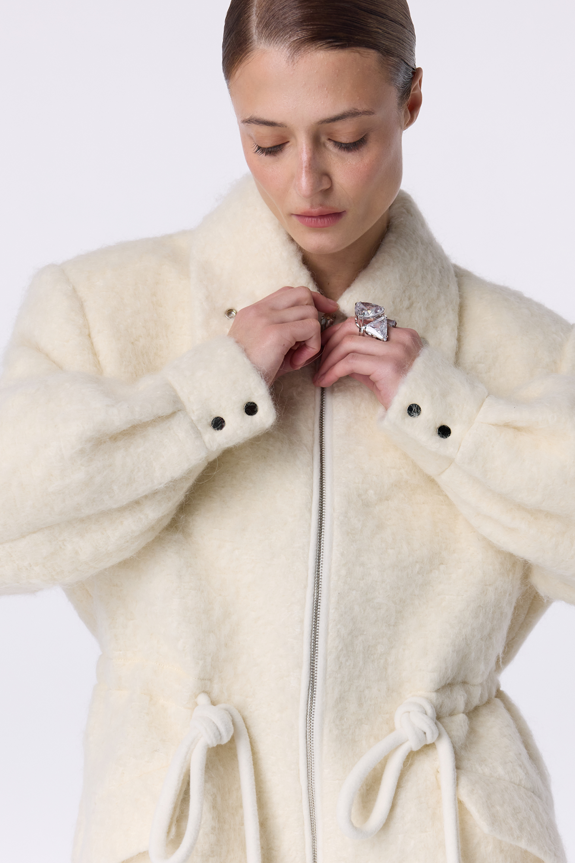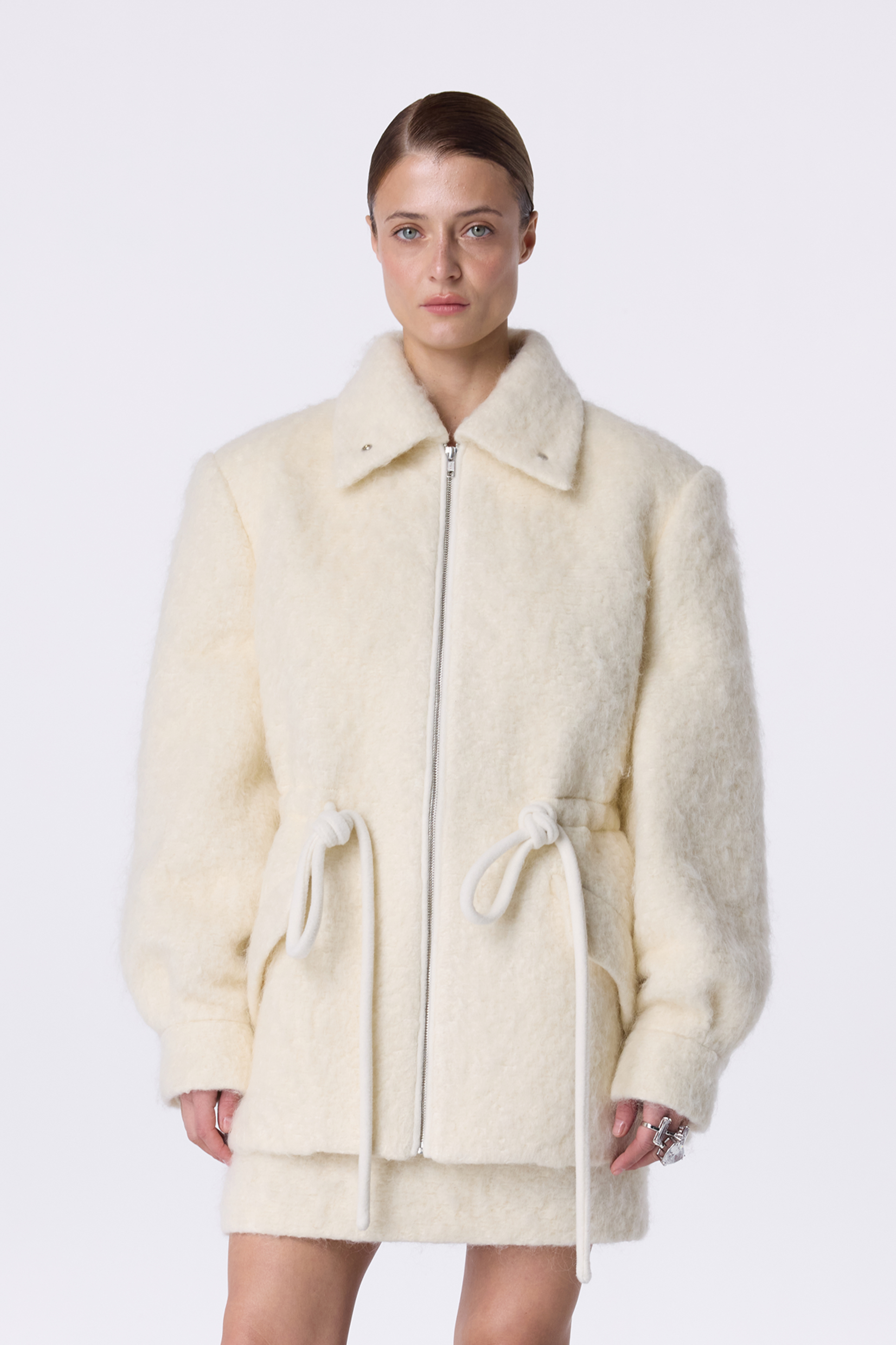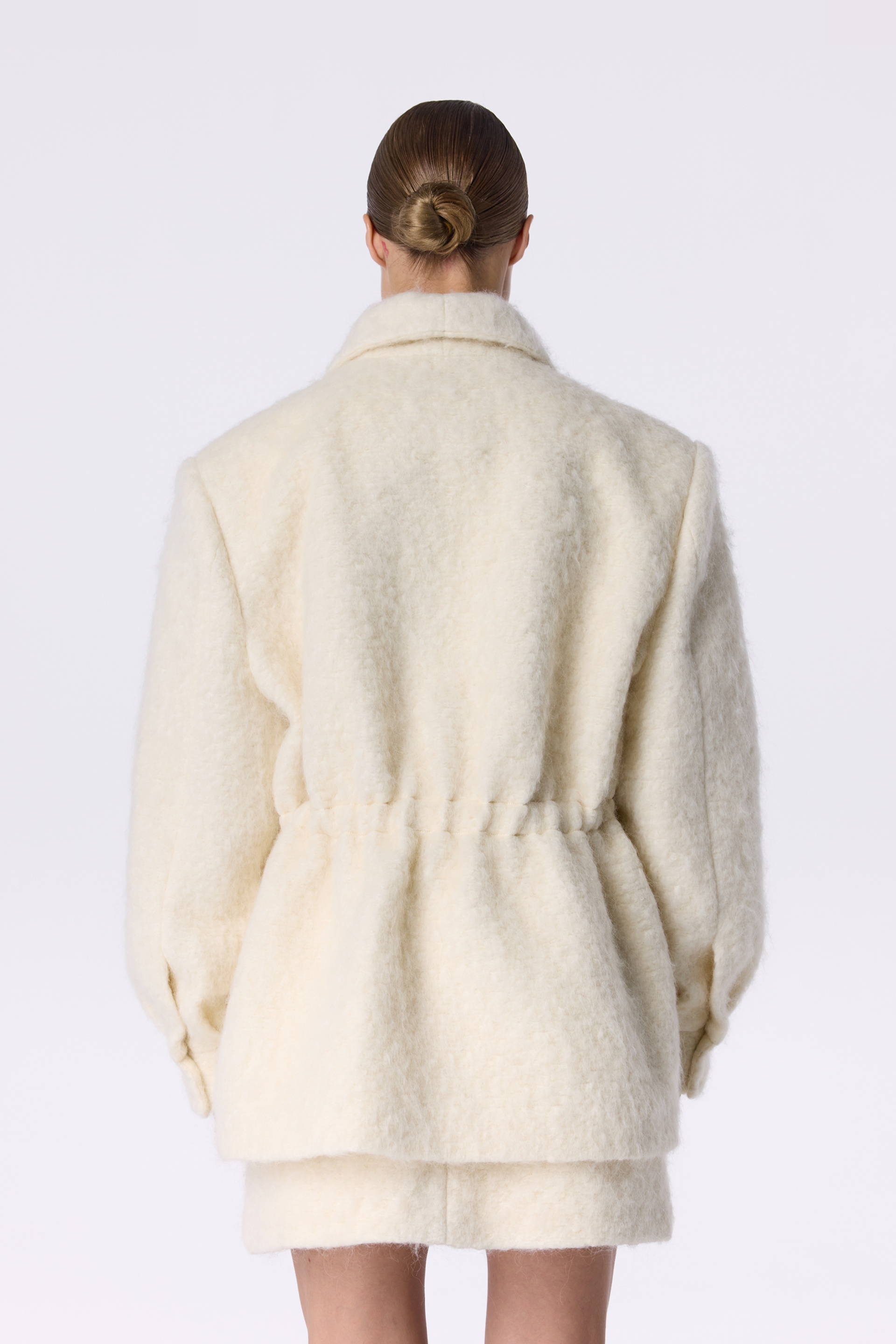 Пальто-парка Mackintosh — сучасна інтерпретація класичної парки з акцентом на лаконічність і комфорт. Вільний силует доповнений кулісками на талії, що дозволяють регулювати посадку та створювати різні варіанти носіння. Широкий відкладний комір і блискавка з контрастною фурнітурою додають моделі практичності. Виготовлена з міксу virginwool, мохеру та альпаки, парка поєднує тепло натуральної тканини з актуальним мінімалістичним дизайном. Пальто-парка забезпечує комфортне носіння за температури до -10°C