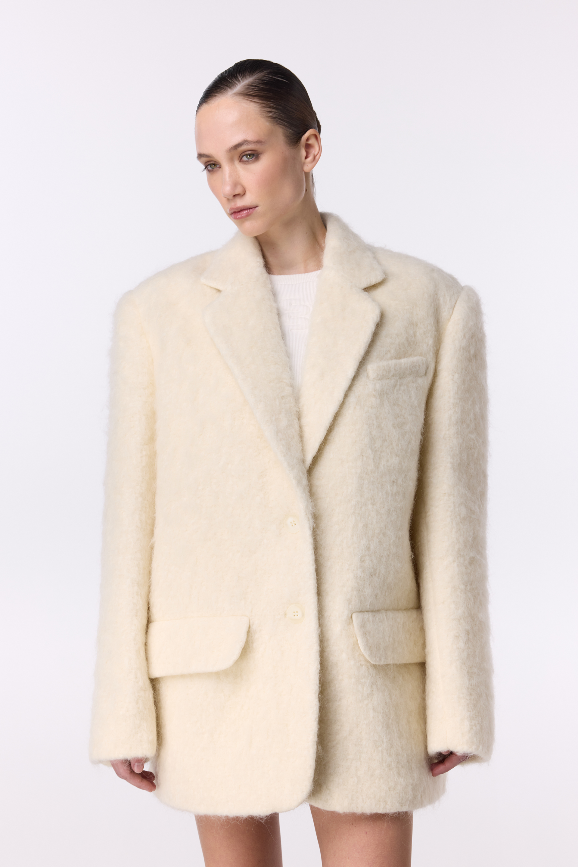 Пальто-жакет оверсайз з альпаки — поєднання затишку та витонченості для холодної пори року. Виготовлене з міксу virginwool, мохеру та альпаки, воно має легку, розкішну текстуру й дарує приємне тепло. Ідеально для створення елегантних міських образів — гармонійно виглядає з брюками, спідницями або лонгслівами.