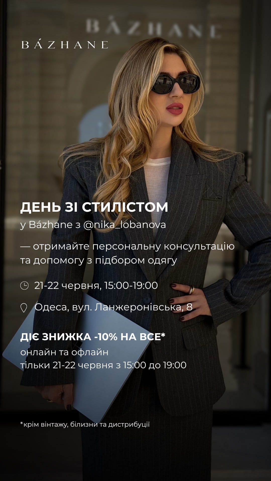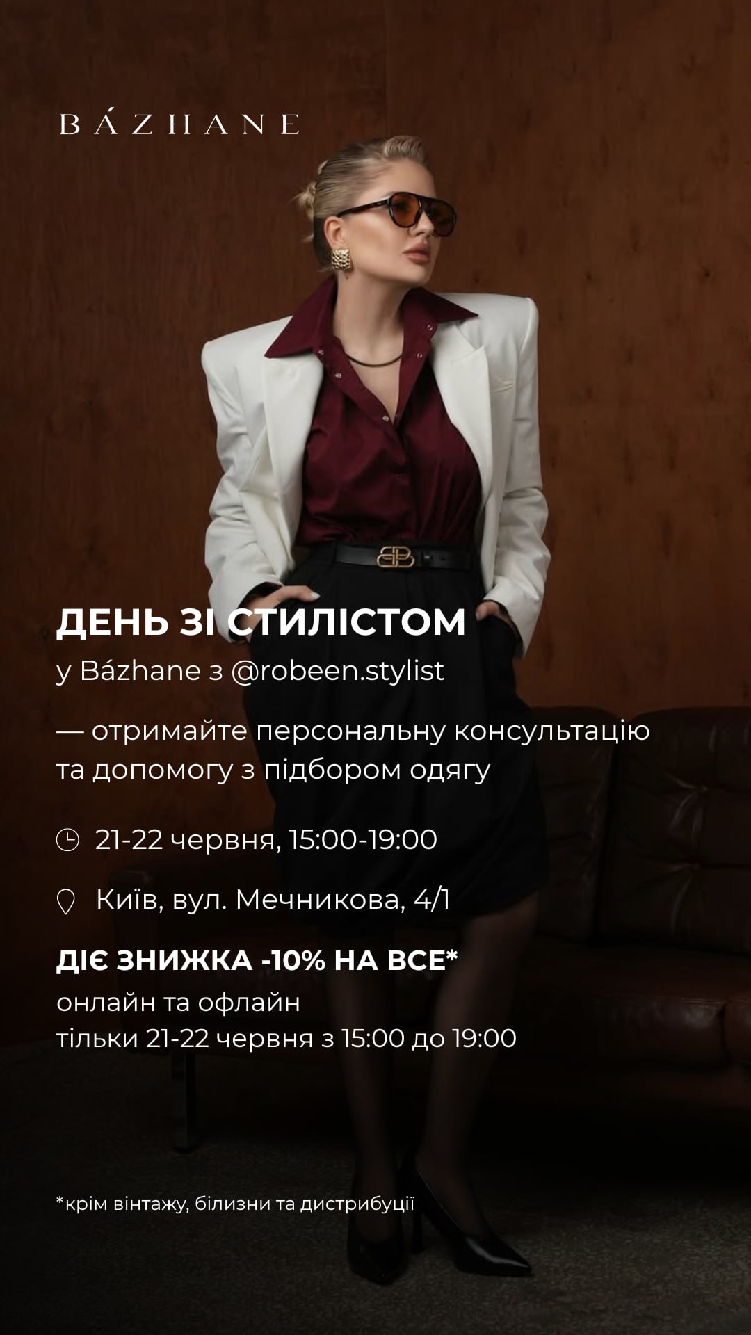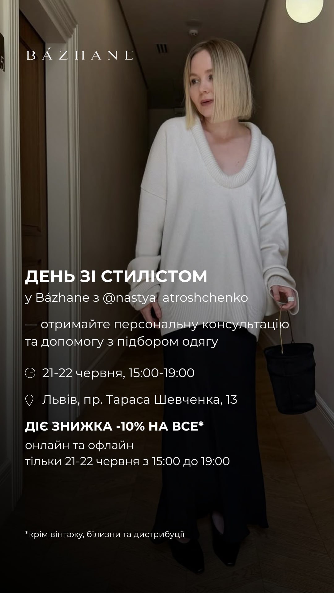 - з 15:00 до 19:00 консультація від запрошеного стиліста та знижка -10% на все (окрім Bazhane Vintage, білизни і товарів із розділу distribution)