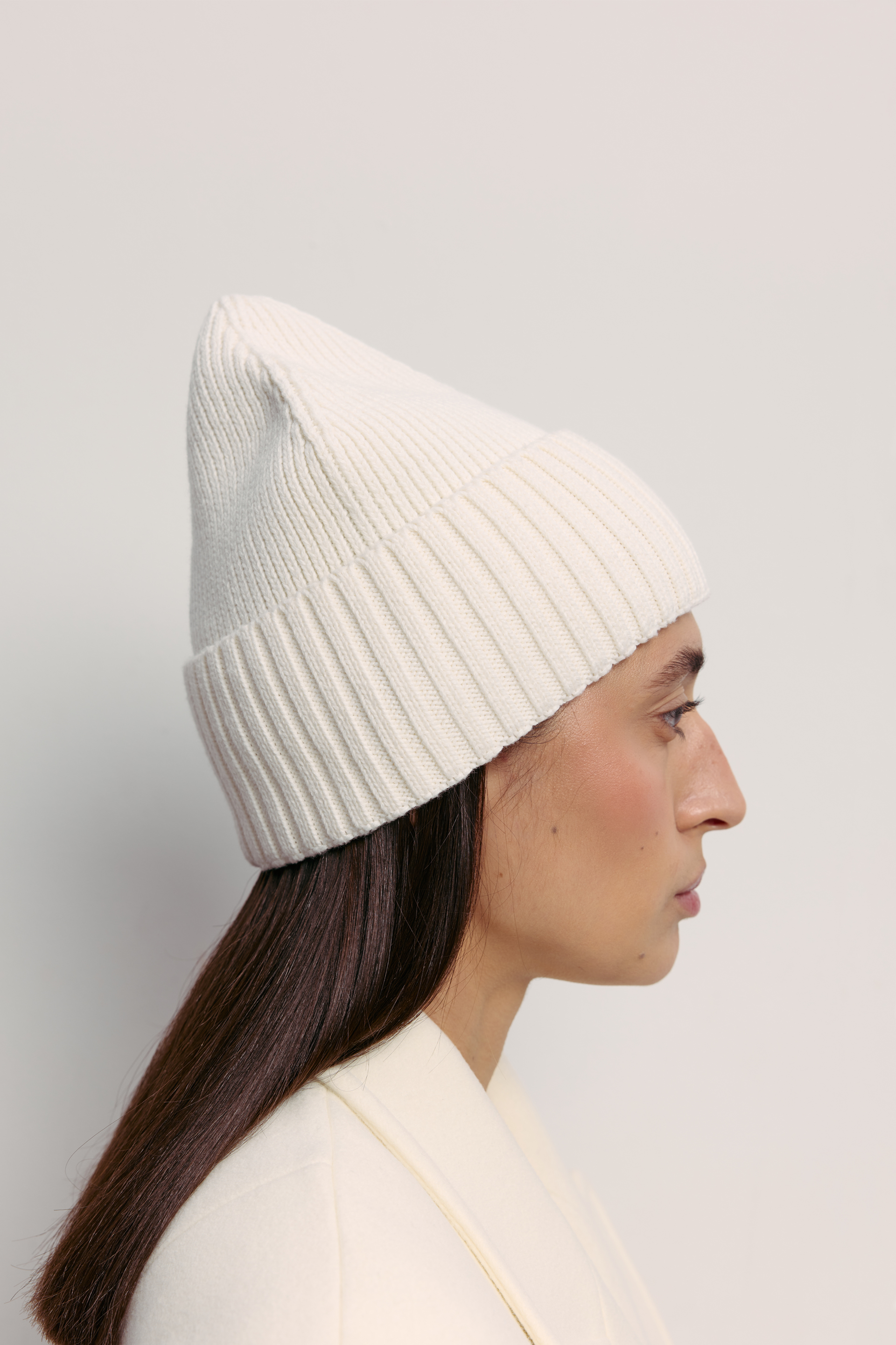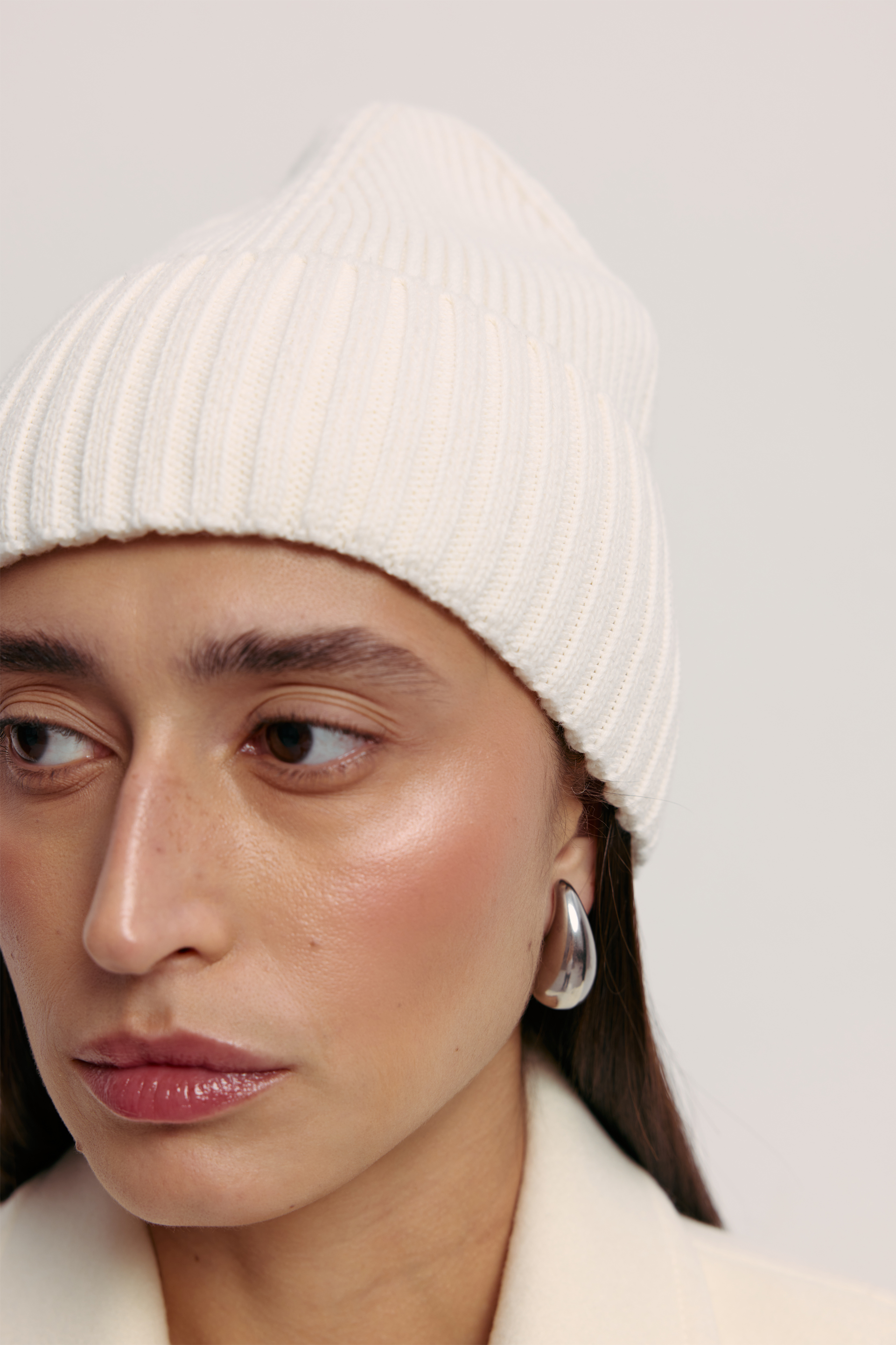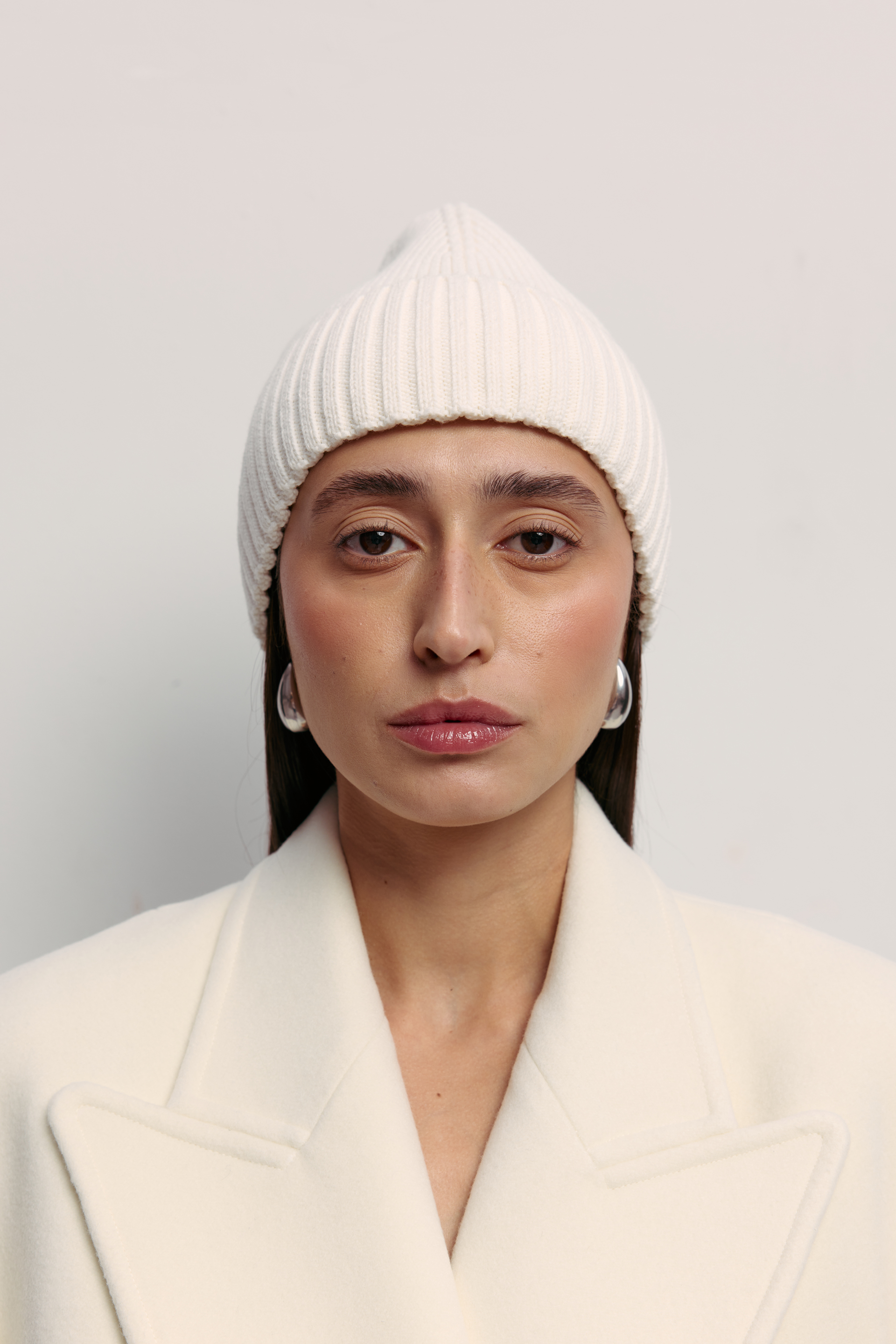 Шапка з м'яким покриттям і комфортною посадкою, виконана з міксу шерсті та кашеміру, що поєднує тепло, м’якість і благородну текстуру. Чітка геометрія та лаконічне ребристе плетіння формують виразний, сучасний образ без зайвих деталей. Аксесуар, який дода