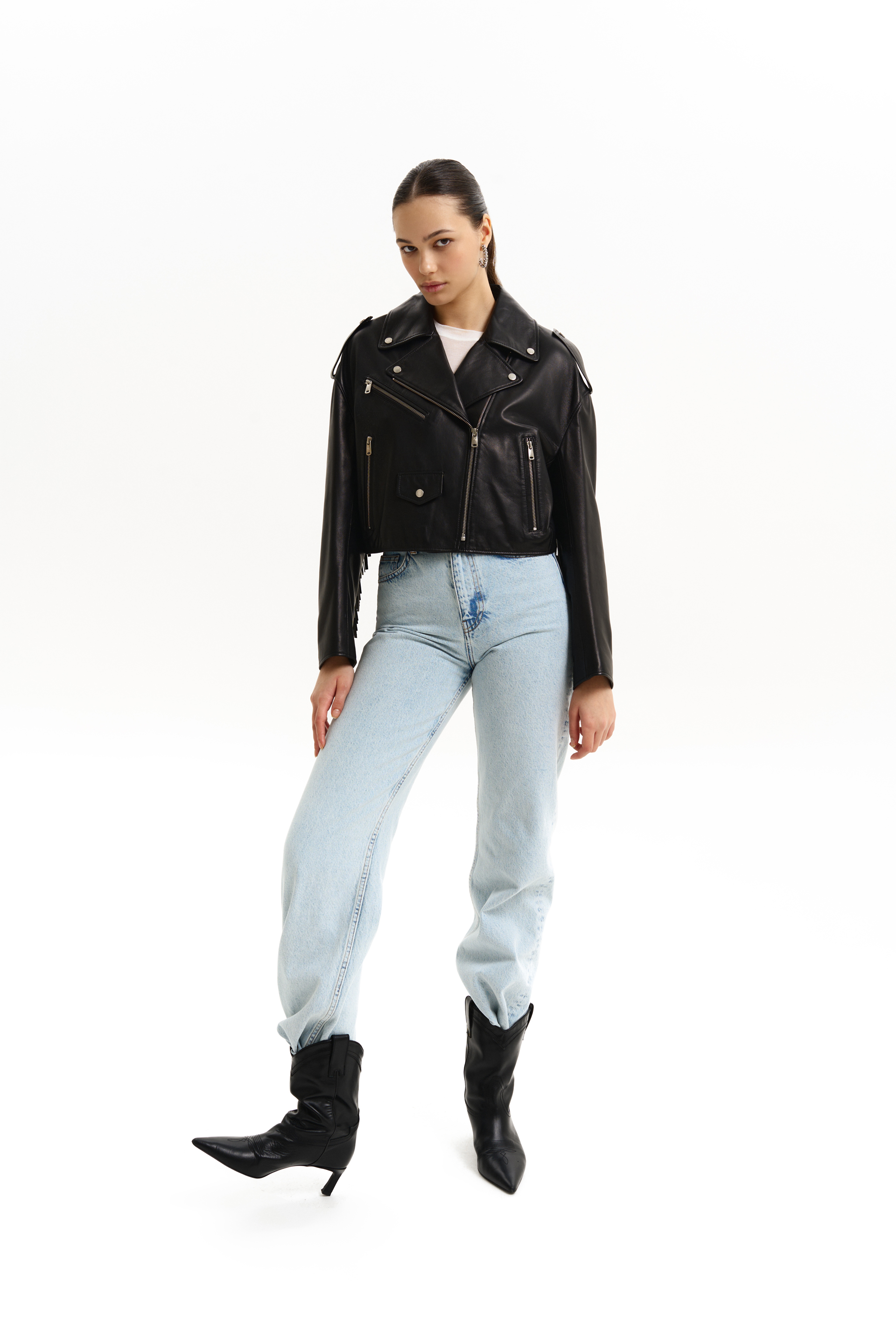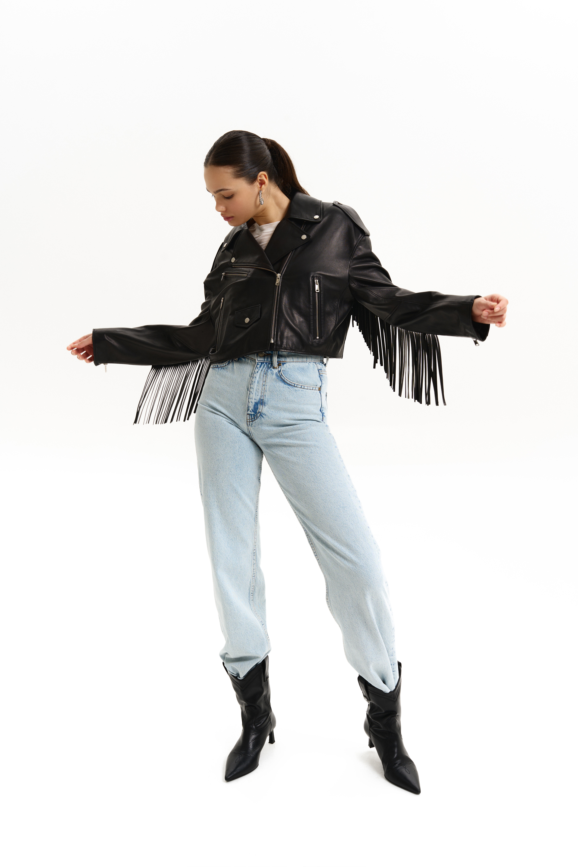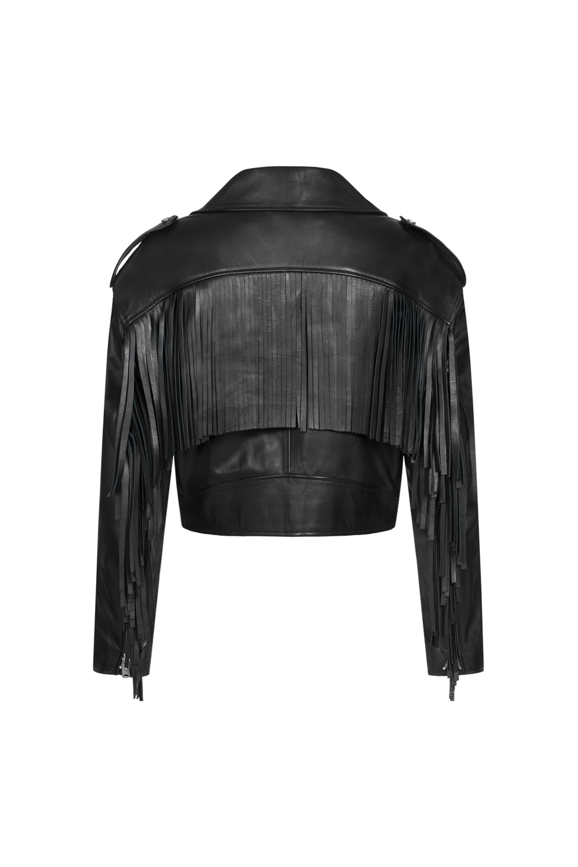 Куртка шкіряна зі спущеною лінією плеча та бахромою. Виготовлена з натуральної шкіри, що додає елегантності та стильного вигляду. Ідеальний вибір для створення яскравих і сміливих образів,