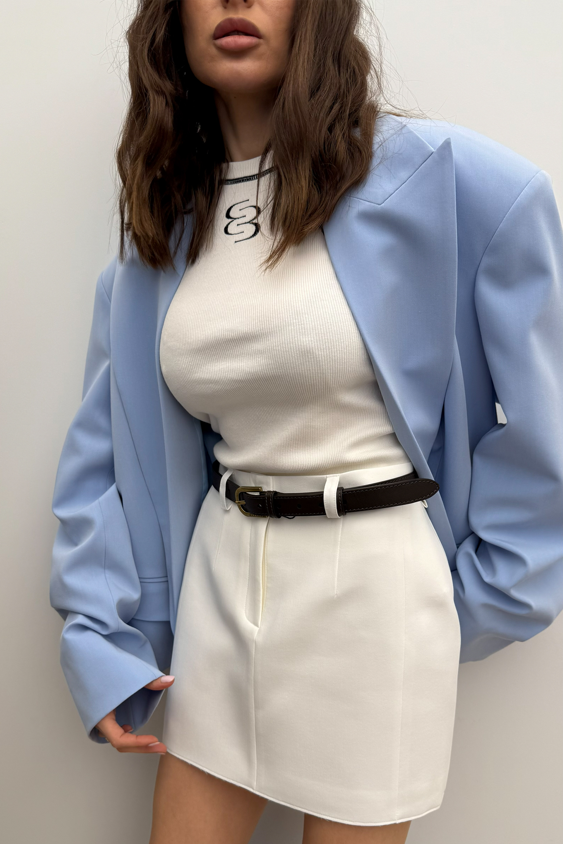 Спідниця Edge — лаконічна міні з прямим кроєм і акцентом на деталях. Дубльована конструкція додає щільності та структури, м’яко підкреслюючи лінію стегон і формуючи жіночний, зібраний силует. Пояс зі шльовками та легка текстура окреслюють талію, задаючи образу ритм і чіткість. Спідниця легко працює як база для ділового або повсякденного стилю — у поєднанні з жилетом, лонгслівом чи жакетом.