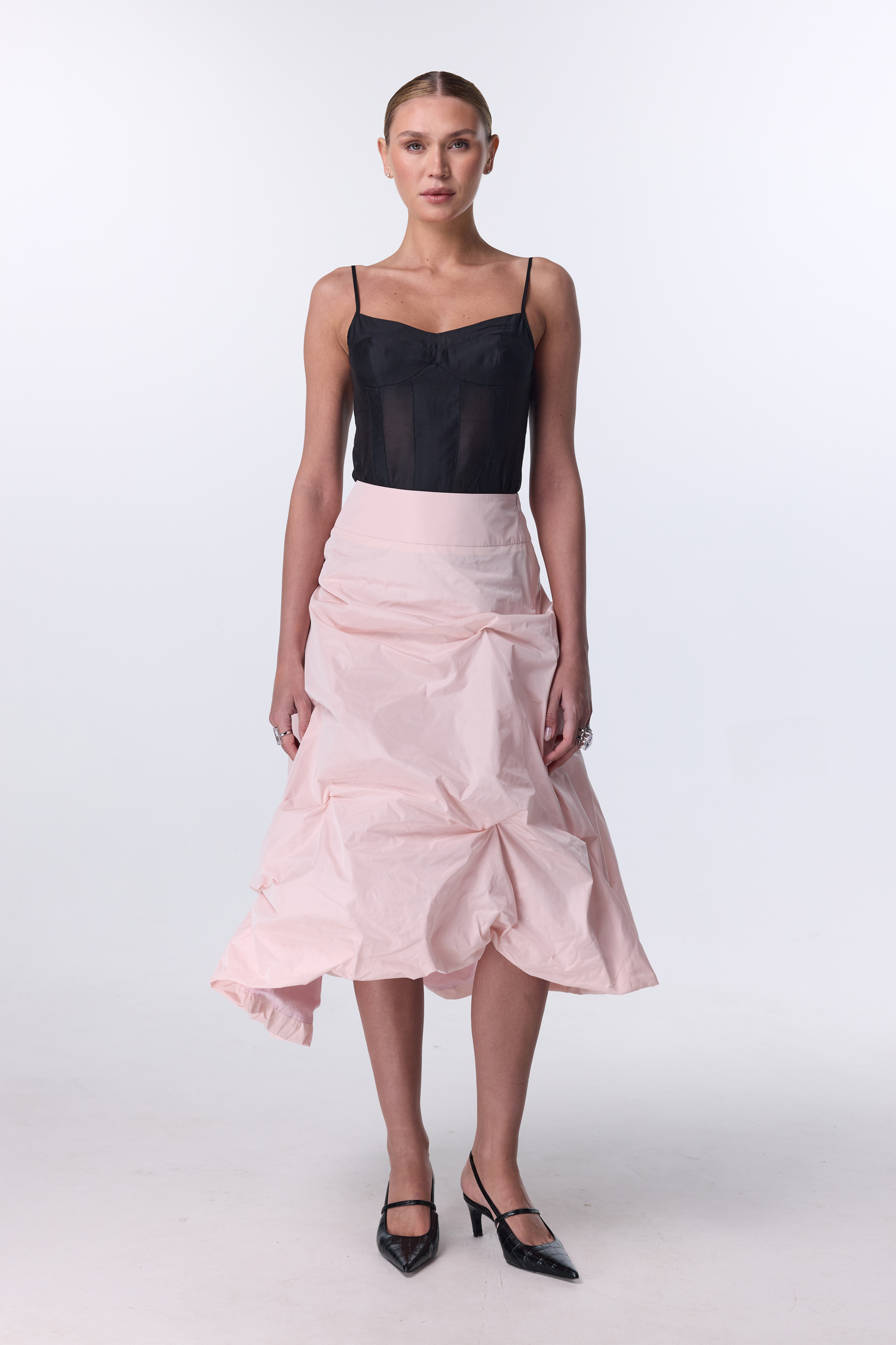 | Розмір | Об'єм талії (см) | Об'єм стегон (см) | Довжина виробу по лівому боковому шву (см) |