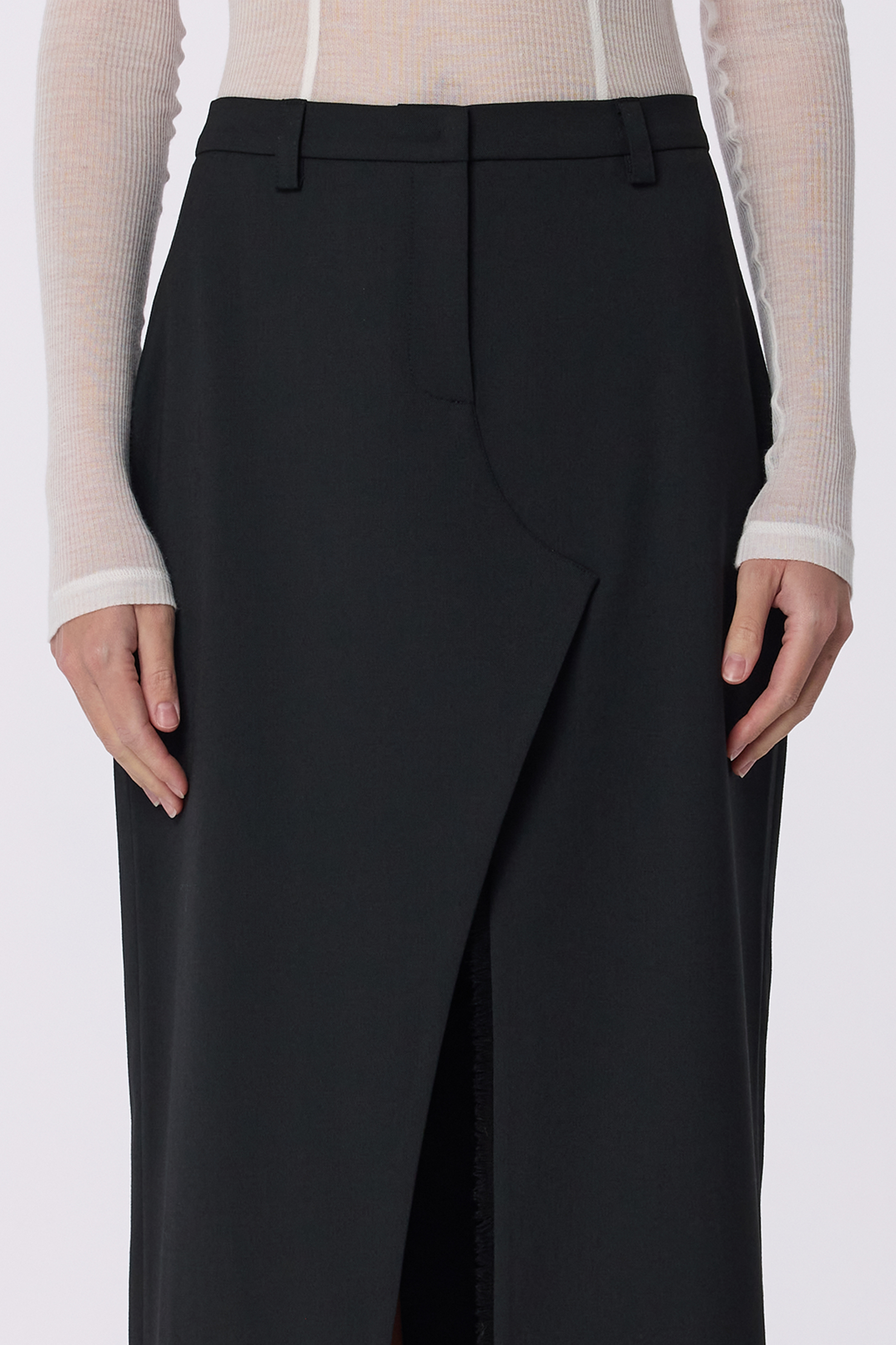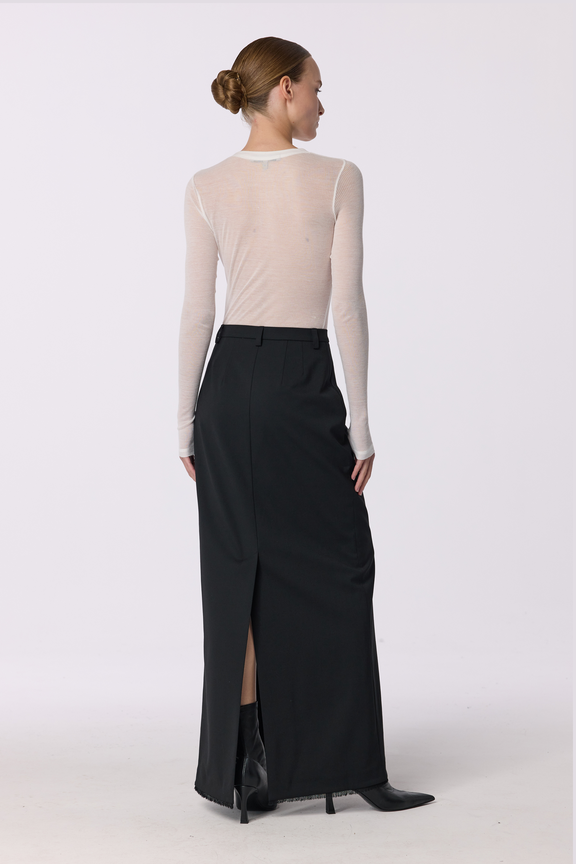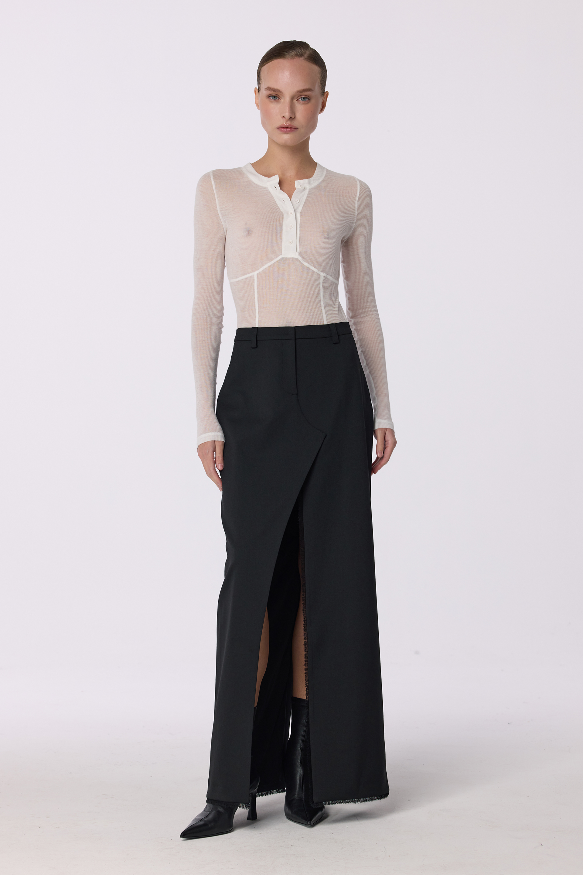 Спідниця максі з симетричним розрізом попереду — про стриману чуттєвість і впевнену лінію силуету. Virginwool м’яко тримає форму й дарує відчуття тепла та благородної структури на тілі. Вона створює витончений баланс між строгою класикою та жіночою спокусливістю, ідеально доповнюючи образи для холодного сезону. Легко поєднується з жакетами й блузами, формуючи образ із характером і настроєм.