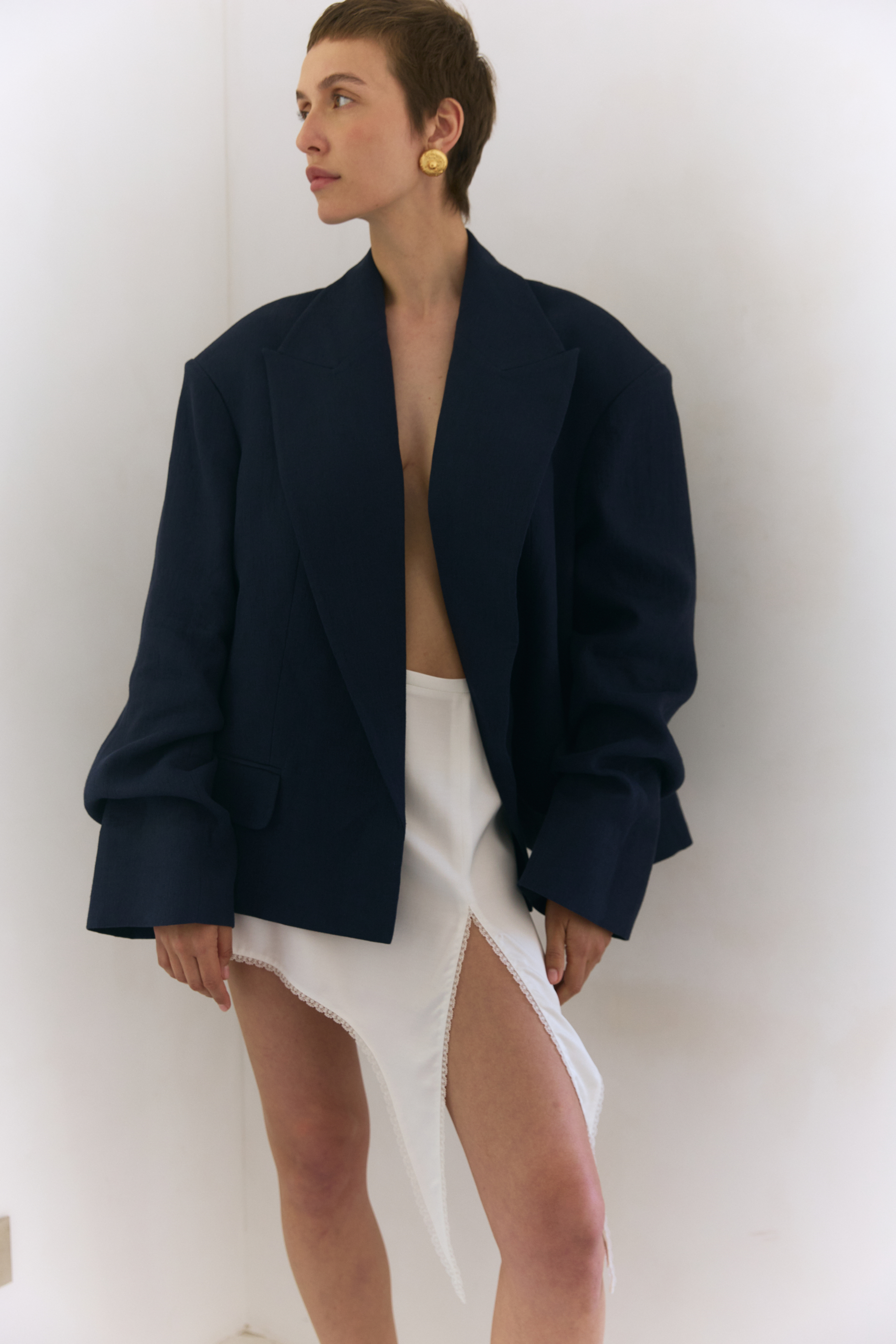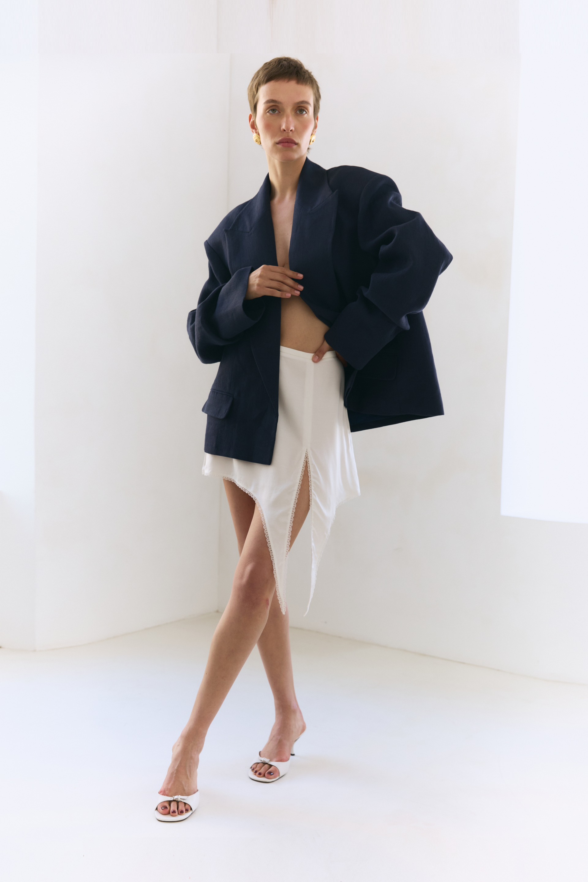 Спідниця міні з середньою посадкою та асиметричним розрізом — чуттєва гра ліній і руху, що м’яко відкриває ногу та притягує погляд. Поєднання віскози та шовку дарує відчуття невагомості й комфорту на шкірі. Створена для вечорів, коли хочеться відчувати себе впевненою, спокусливою й бездоганно стильною. Виразний акцент, що легко задає настрій усьому образу.
