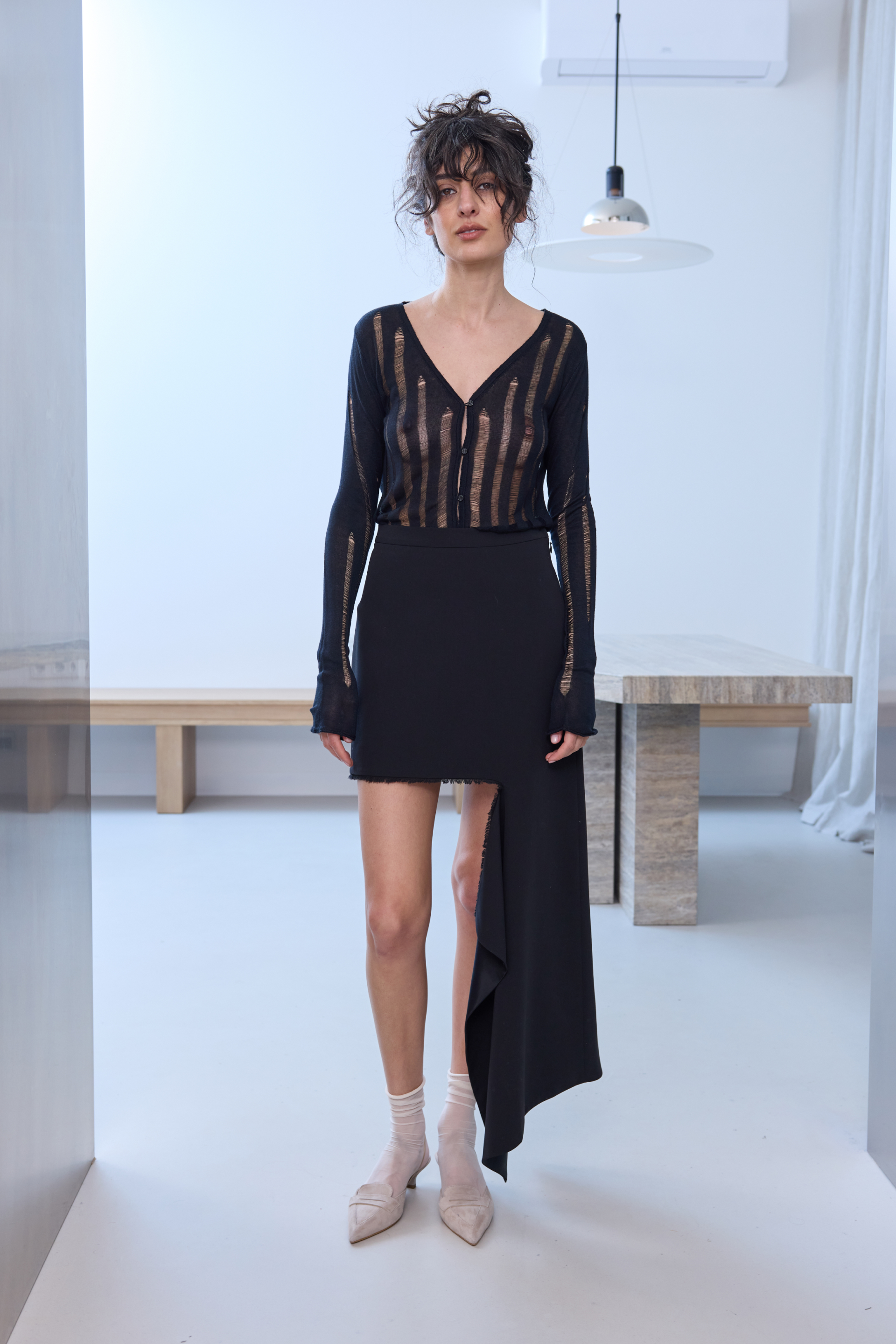 Спідниця міні з відрізною деталлю — гра геометрії та руху, що формує виразний і сміливий силует. М’який мікс віскози та бавовни ніжно огортає тіло, даруючи відчуття комфорту й стриманої елегантності. Асиметричний акцент додає образу динаміки та легкої зухвалості, підкреслюючи ноги й талію. Модель створена для образів, у яких поєднуються впевненість, чуттєвість і холодна естетика міста.