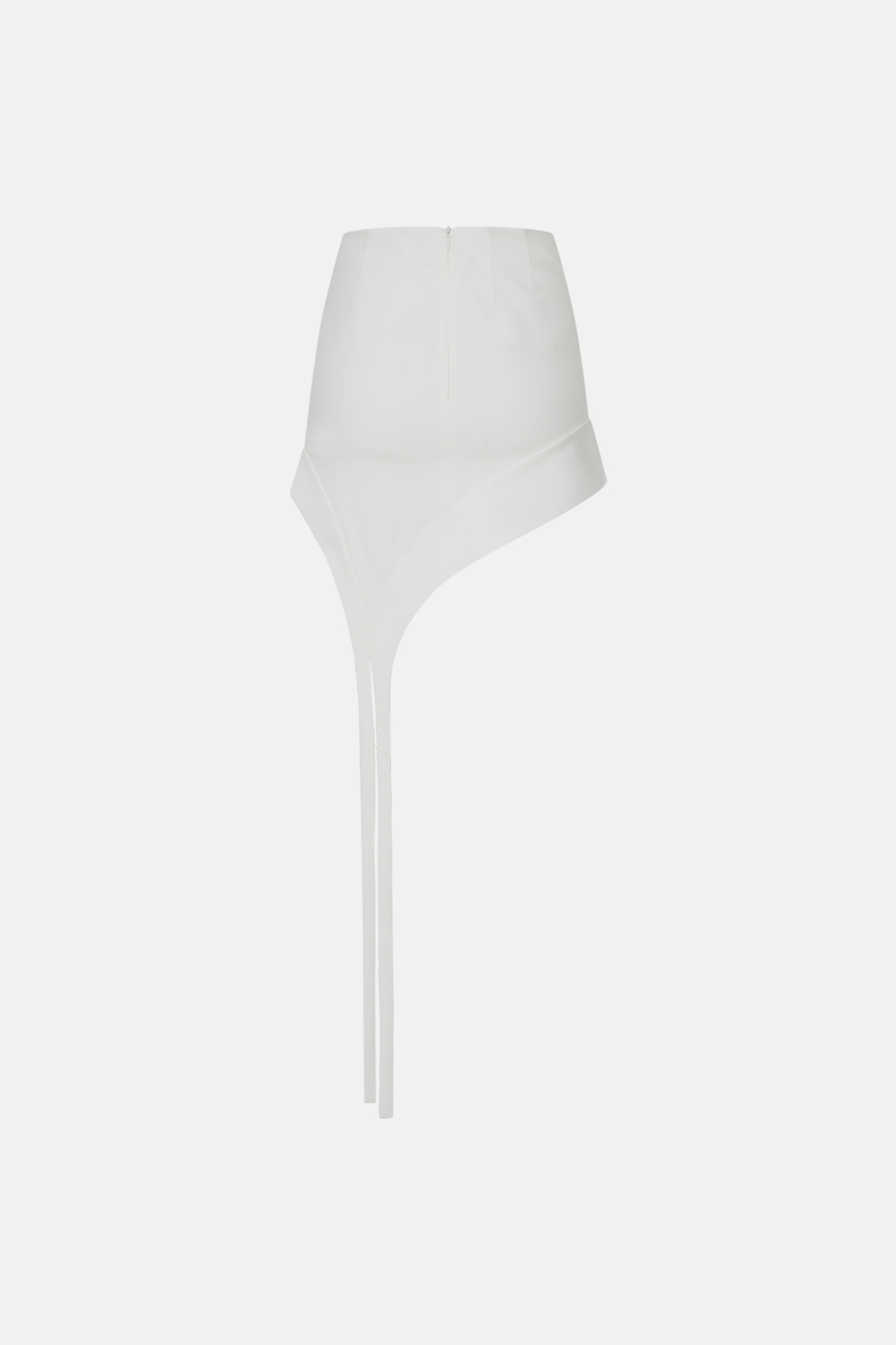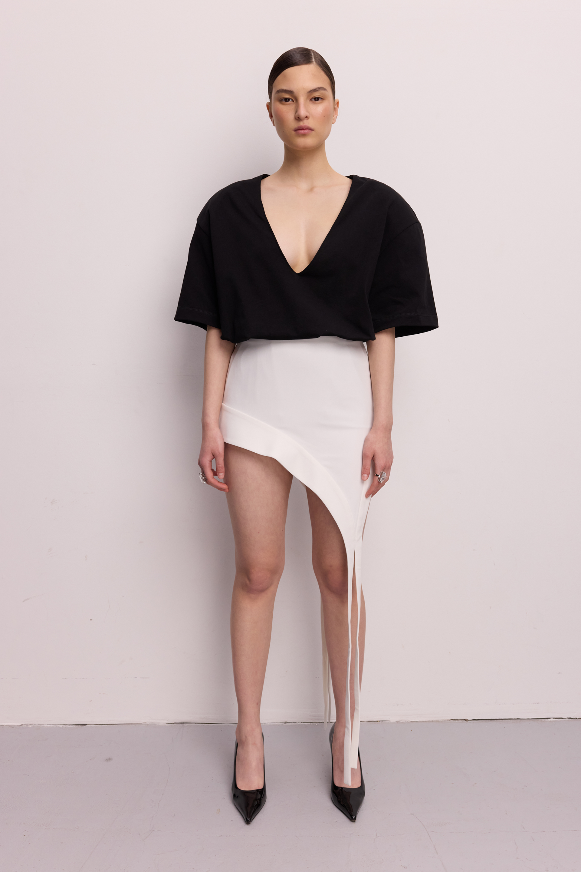 Спідниця Siren — гра мінімалізму та візуального акценту. Лаконічна міні-довжина доповнена видовженим асиметричним елементом збоку, що створює динаміку образу. М’яка, пластична тканина огортає фігуру, підкреслюючи силует і додаючи ритму кожному кроку. Ідеальний вибір для тих, хто носить спокусу з упевненістю.