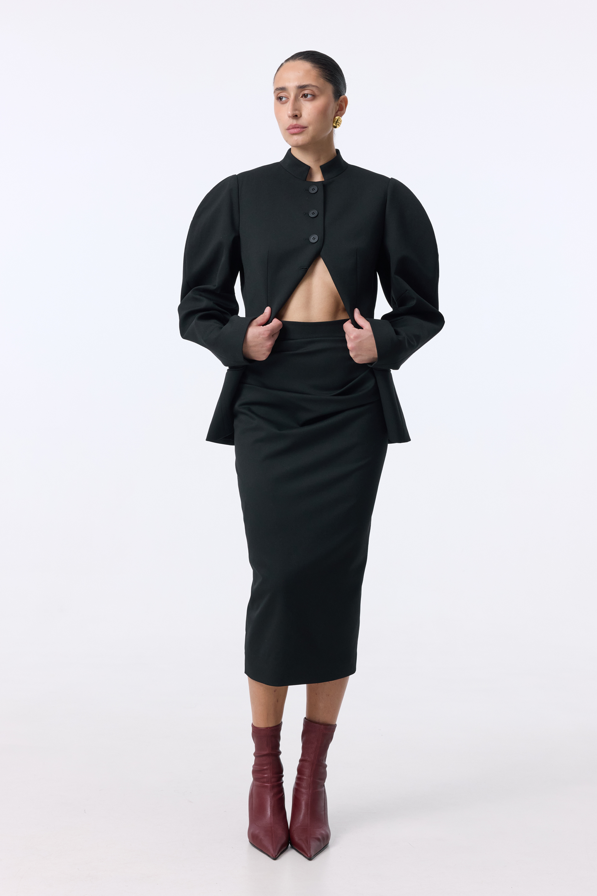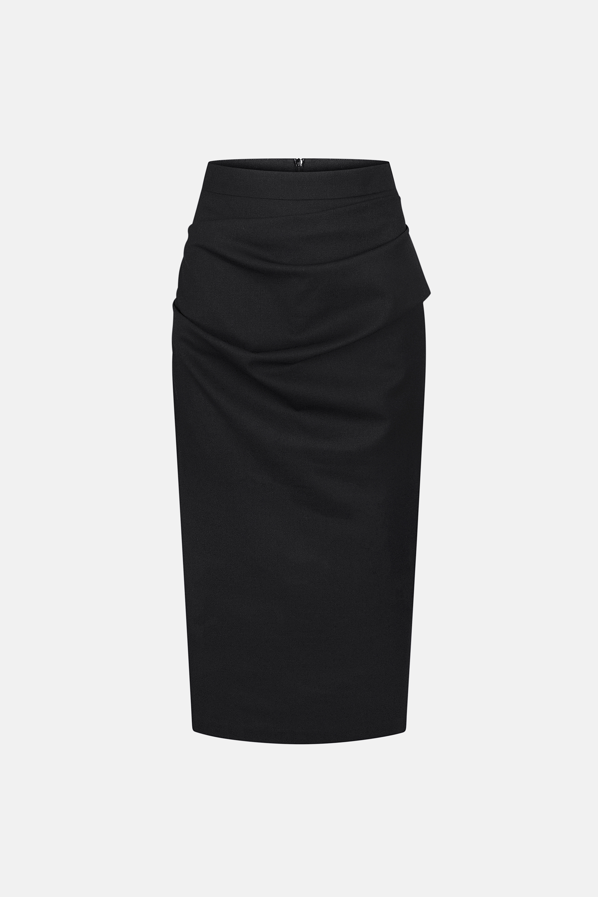 Спідниця Tuck — витончена модель міді з акцентом на драпірування в зоні талії. Лаконічний крій підкреслює силует, а м’які складки створюють делікатний об’єм і додають образу пластичності. Виконана з virginwool, спідниця поєднує елегантність, комфорт і пре