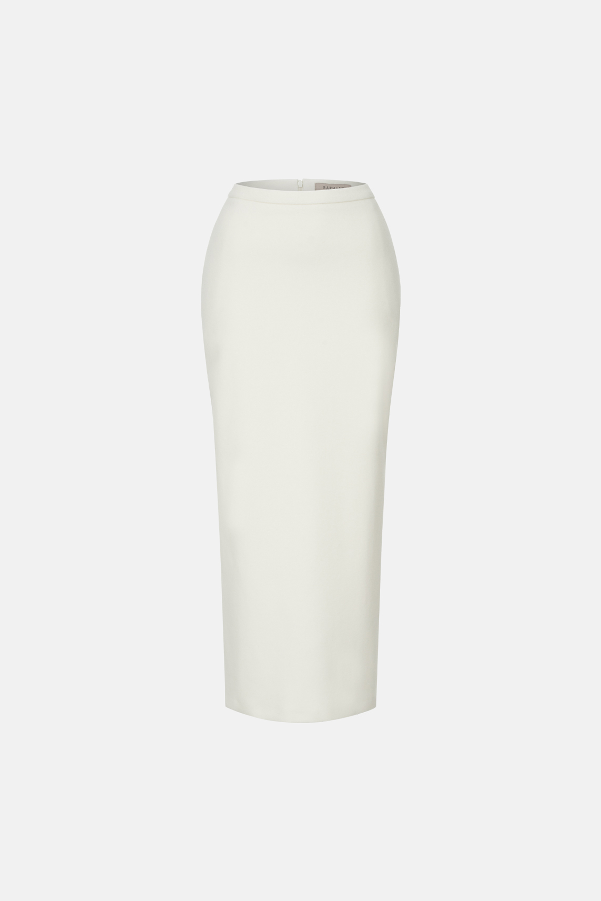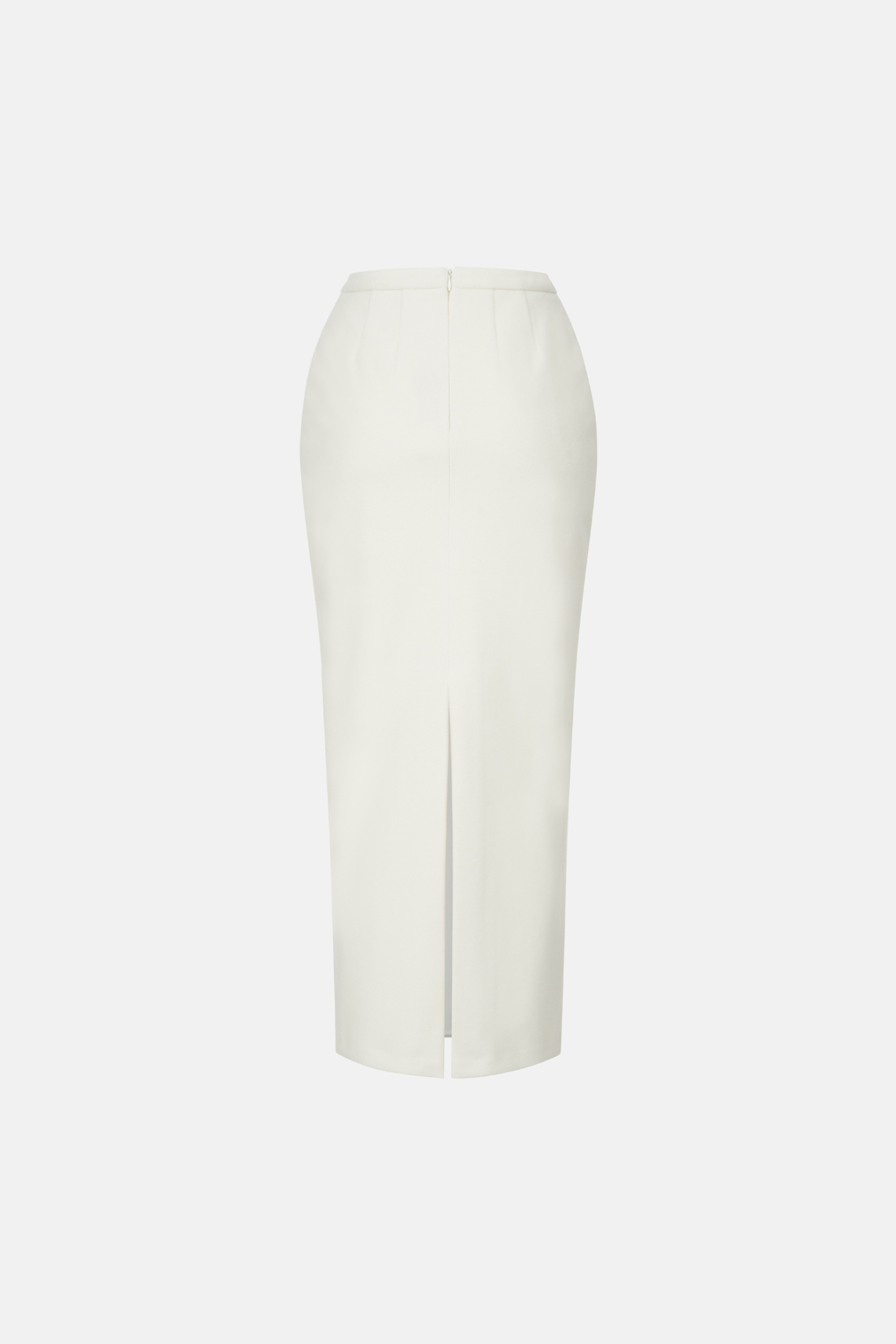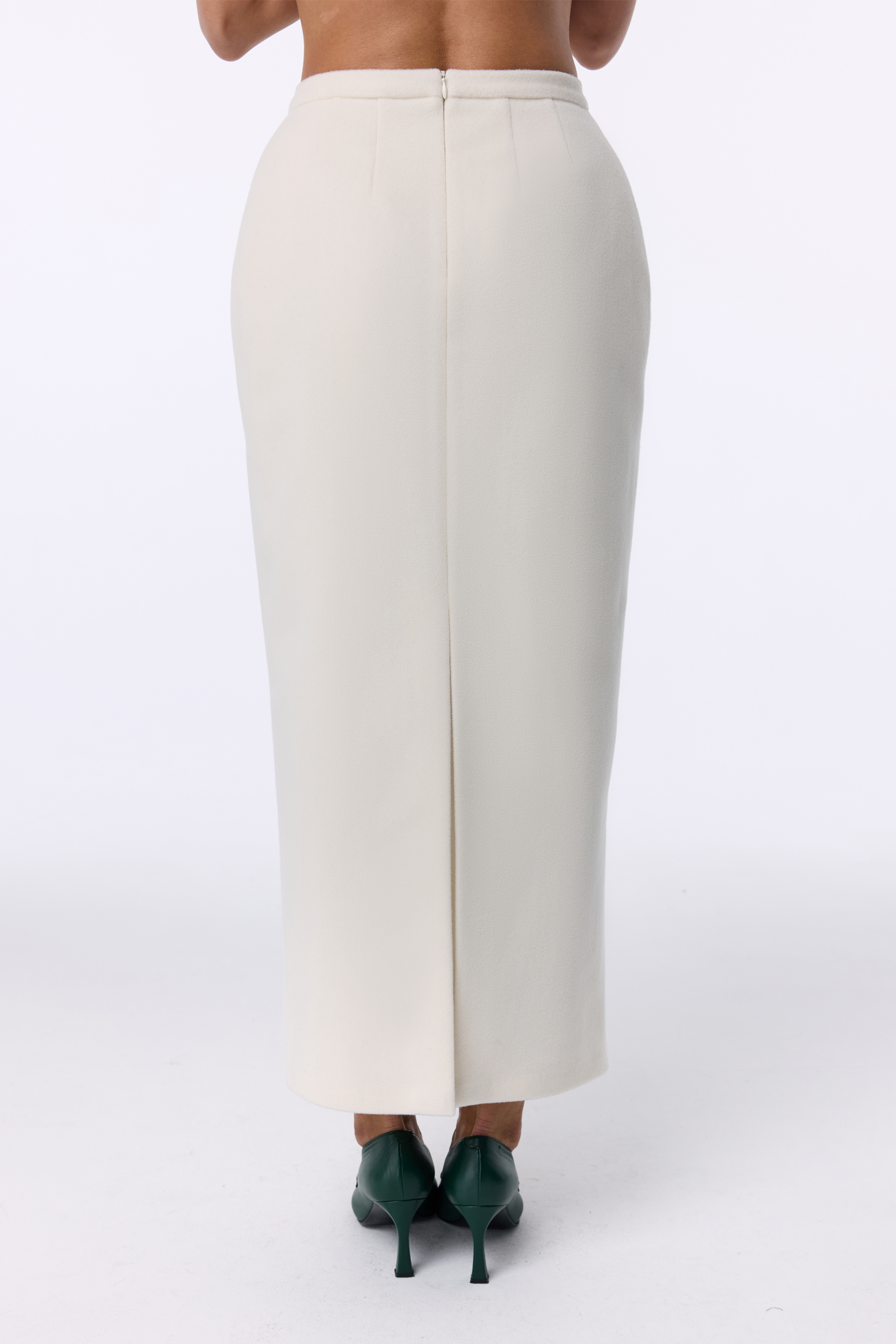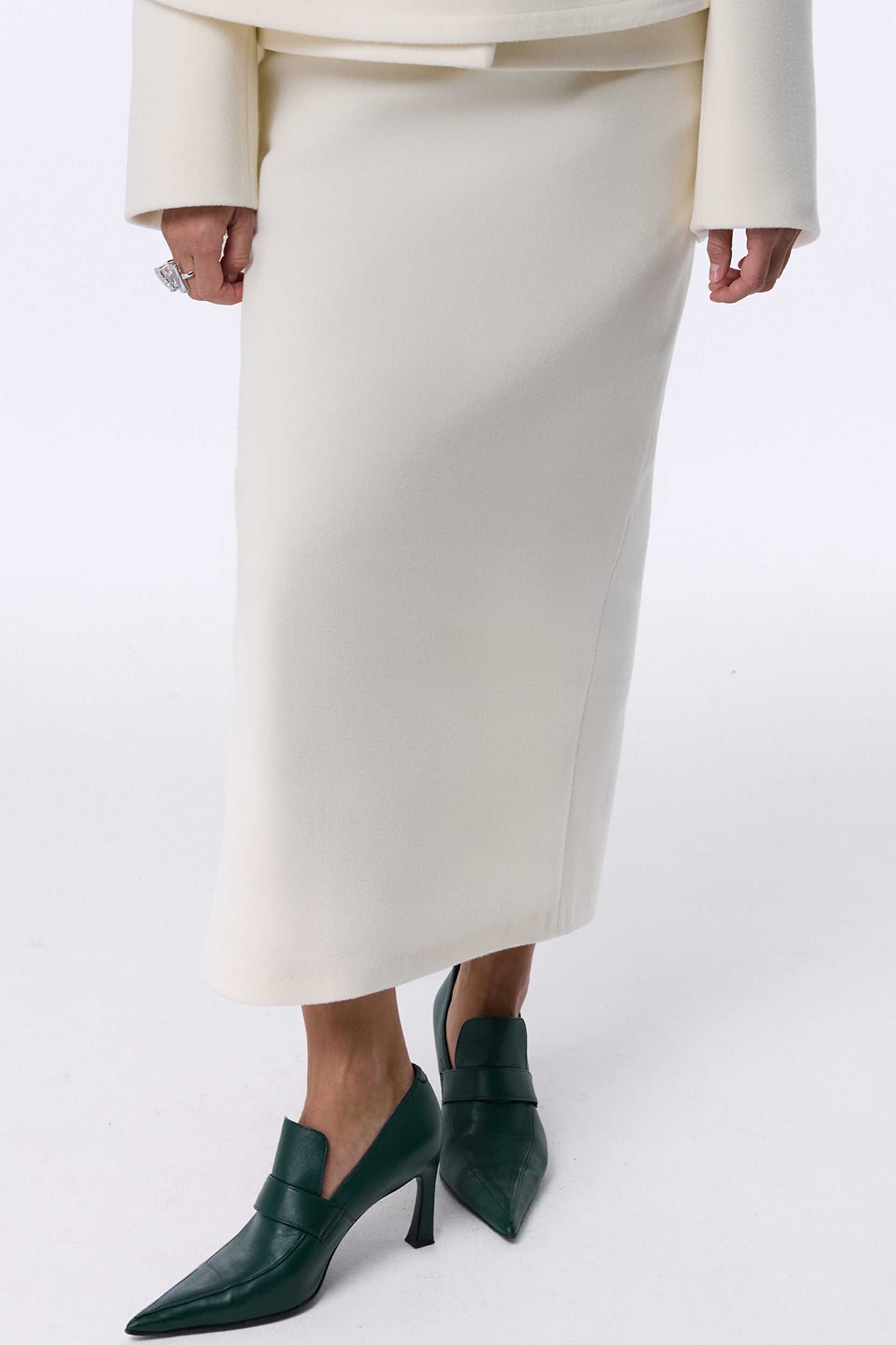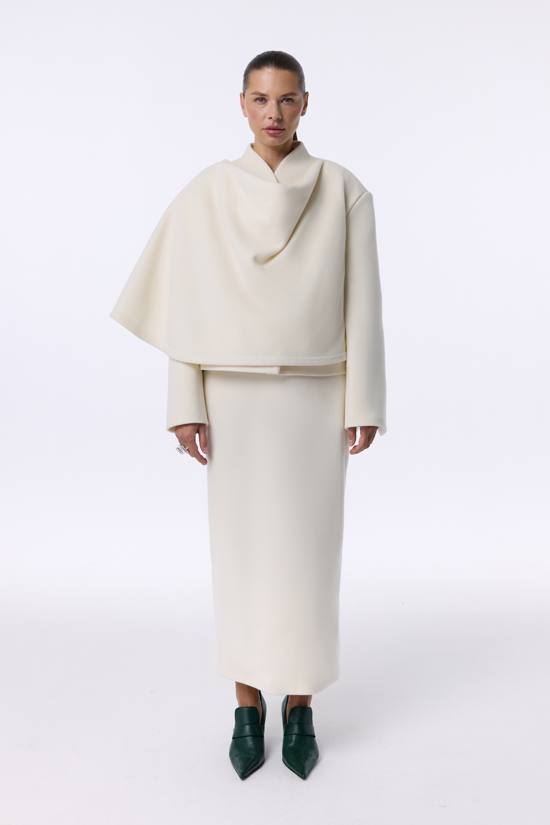 Спідниця Courtesy — класична форма з акцентом на пластику силуету та чистоту ліній. Пальтова тканина із virginwool м’яко тримає конструкцію, має делікатний ворс і забезпечує комфорт у прохолодну погоду. Накладки на стегнах формують виразний об’єм і підкреслюють талію, а акуратна шліца ззаду зберігає свободу руху та відчуття зібраної елегантності.