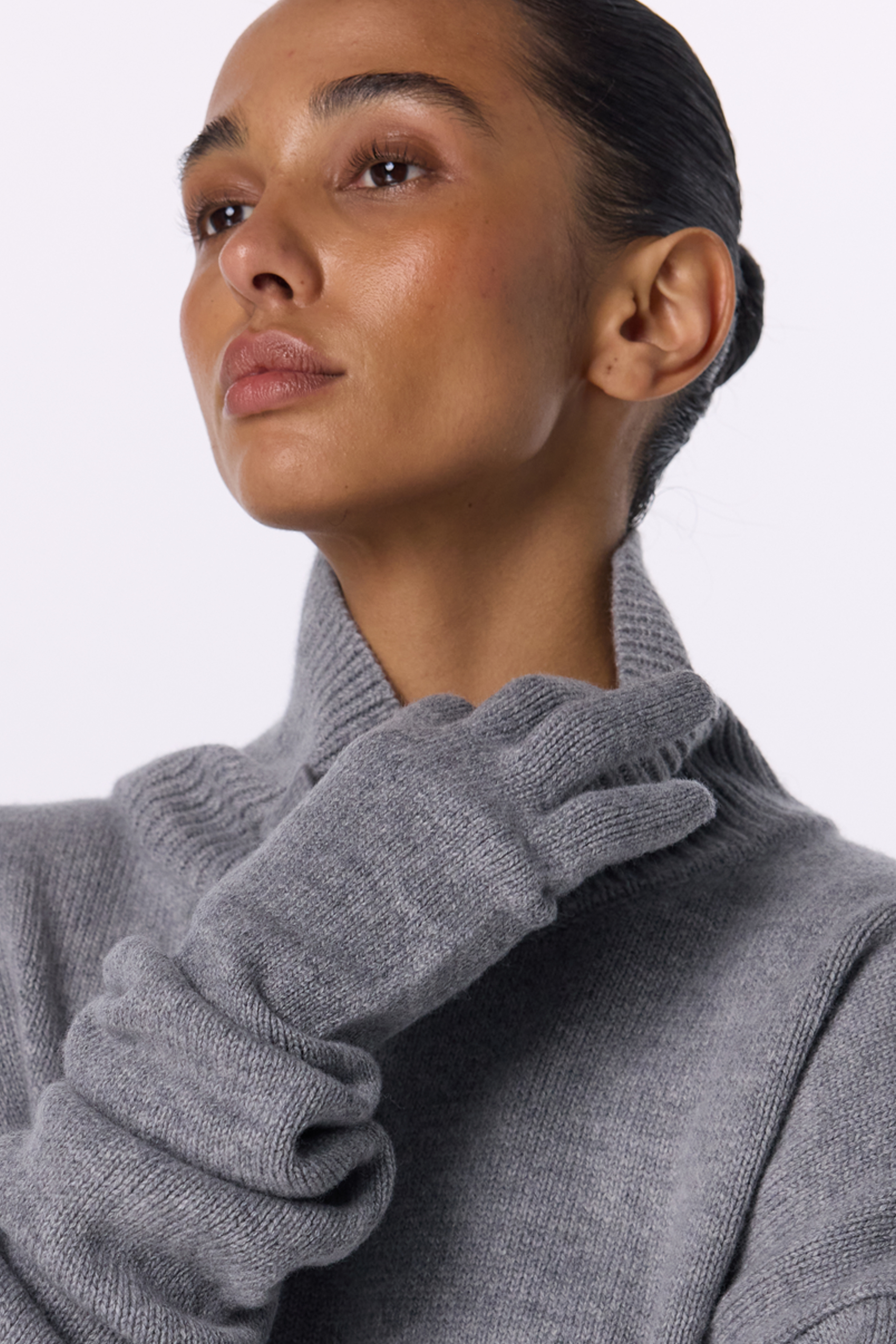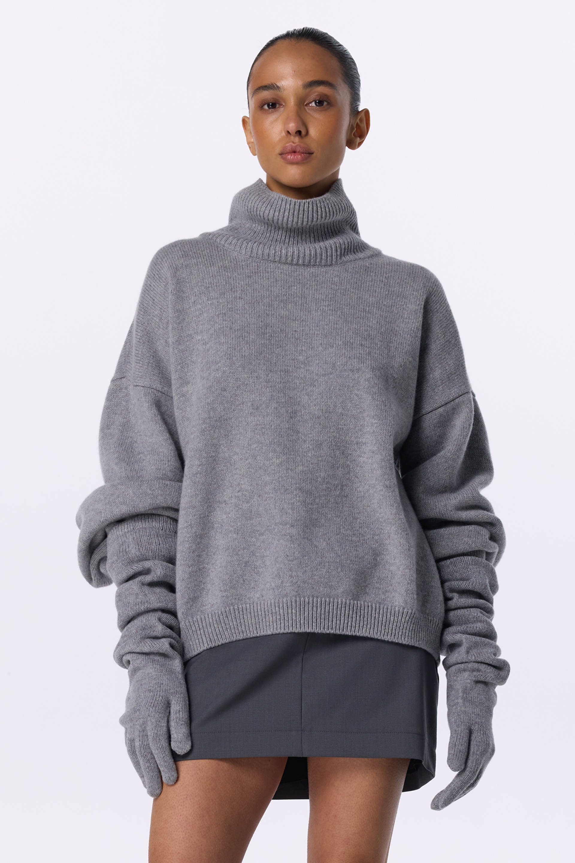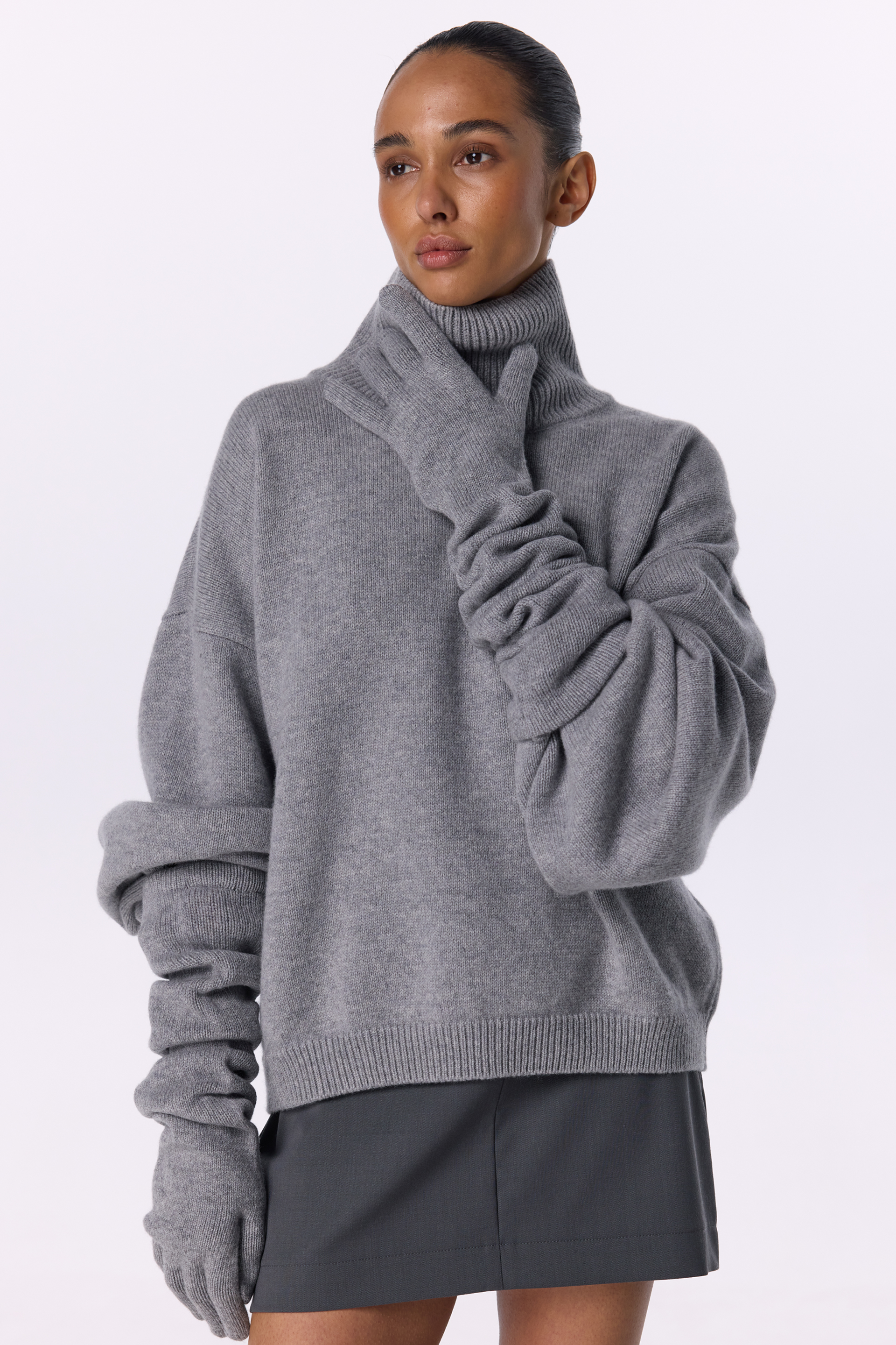 Укорочений оверсайз светр із високим коміром, виконаний з міксу вовни та кашеміру — про сучасний силует і тактильну розкіш. М’яка текстура огортає тіло теплом, а подовжені рукави додають образу розслабленої елегантності. Ідеальний акцент для мінімалістичних луків у холодний сезон, де комфорт зустрічається зі стилем.