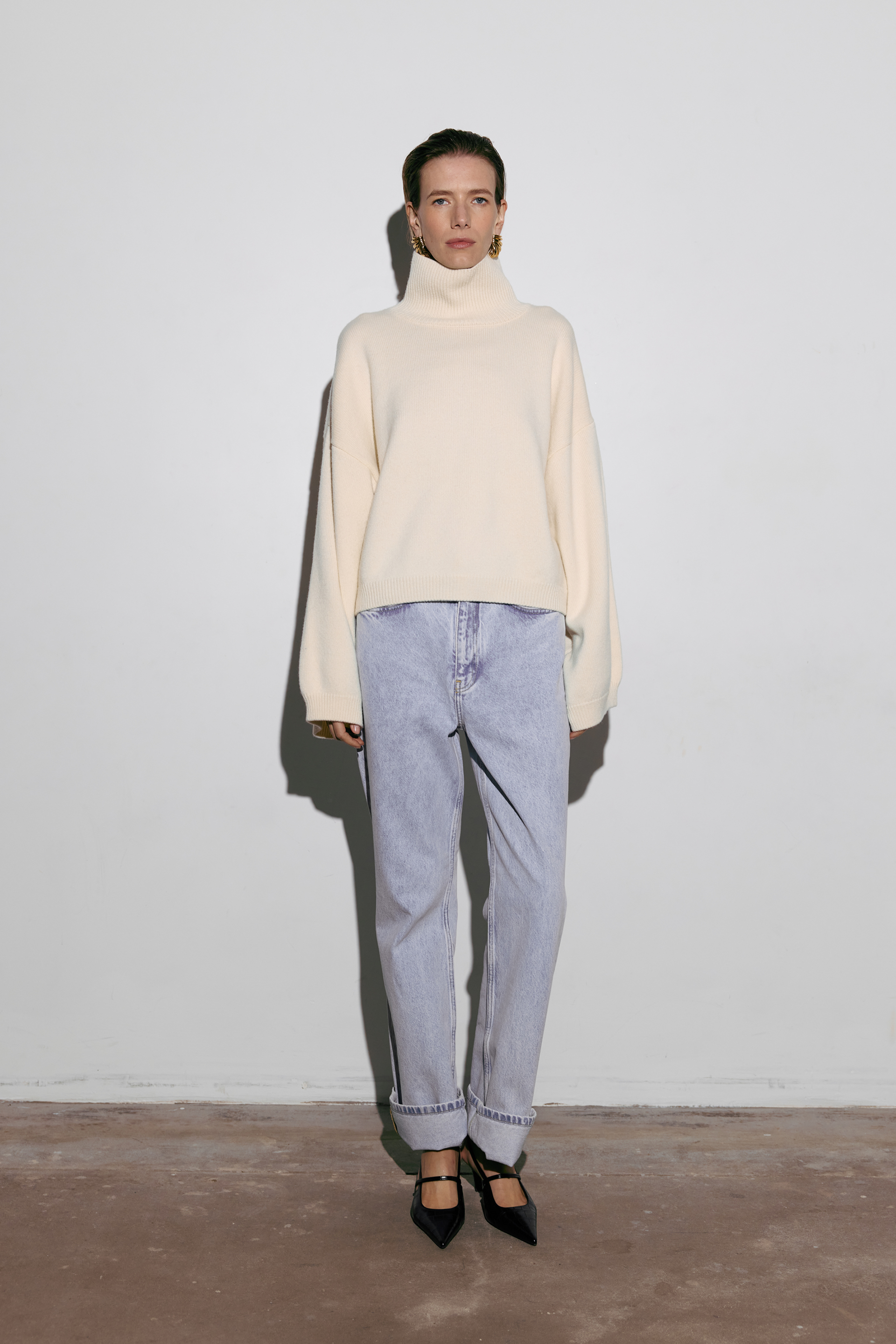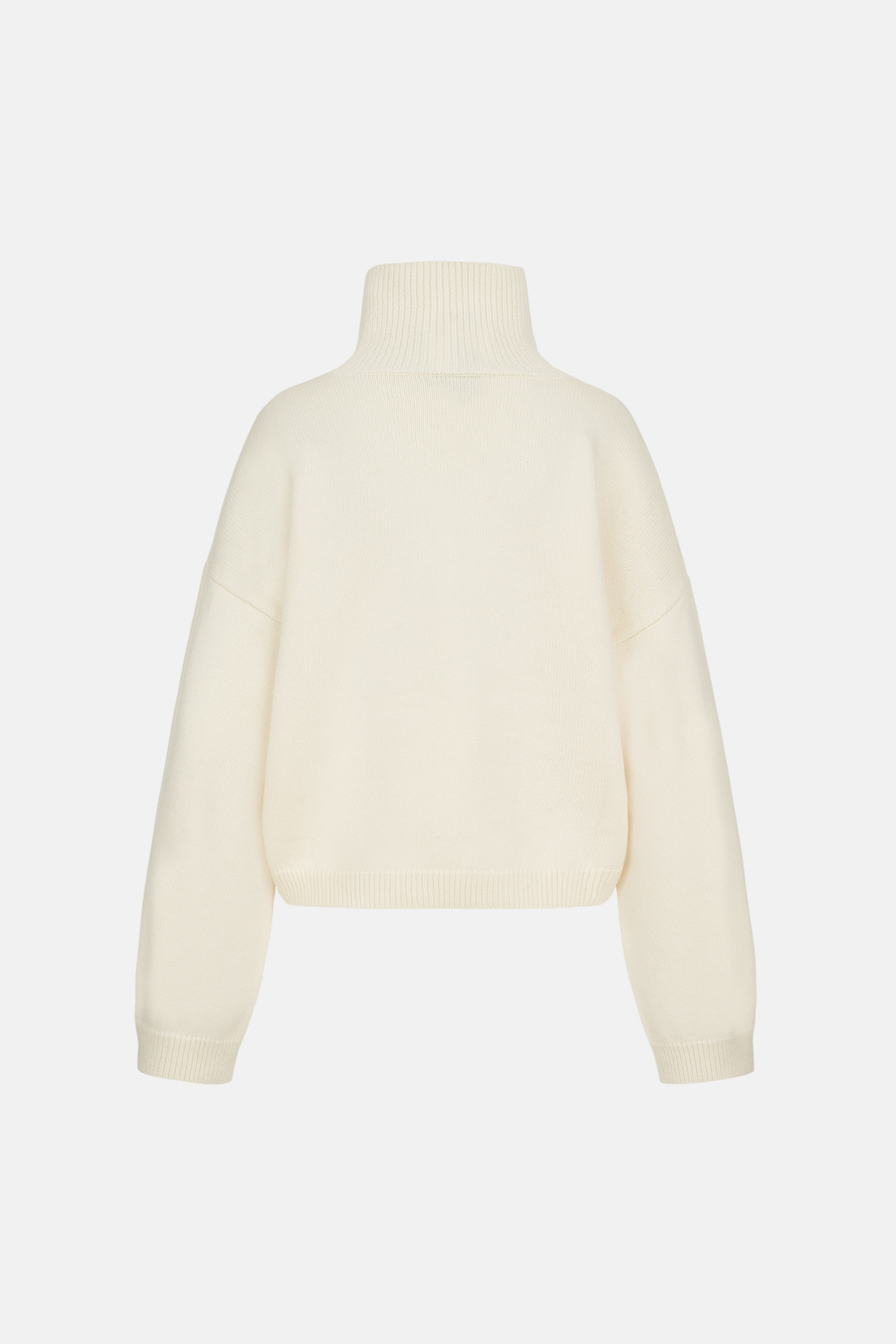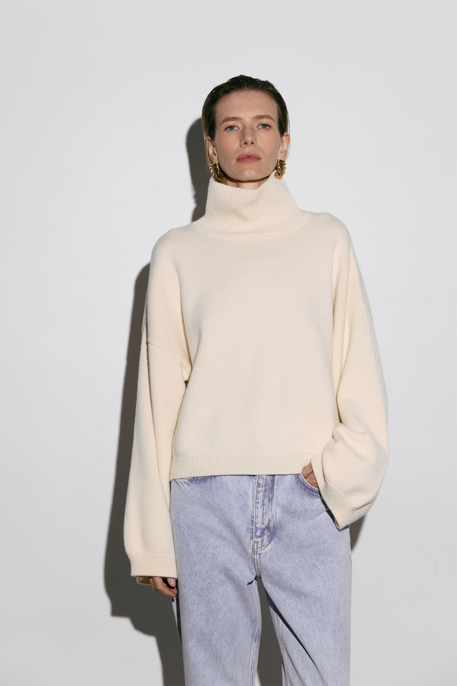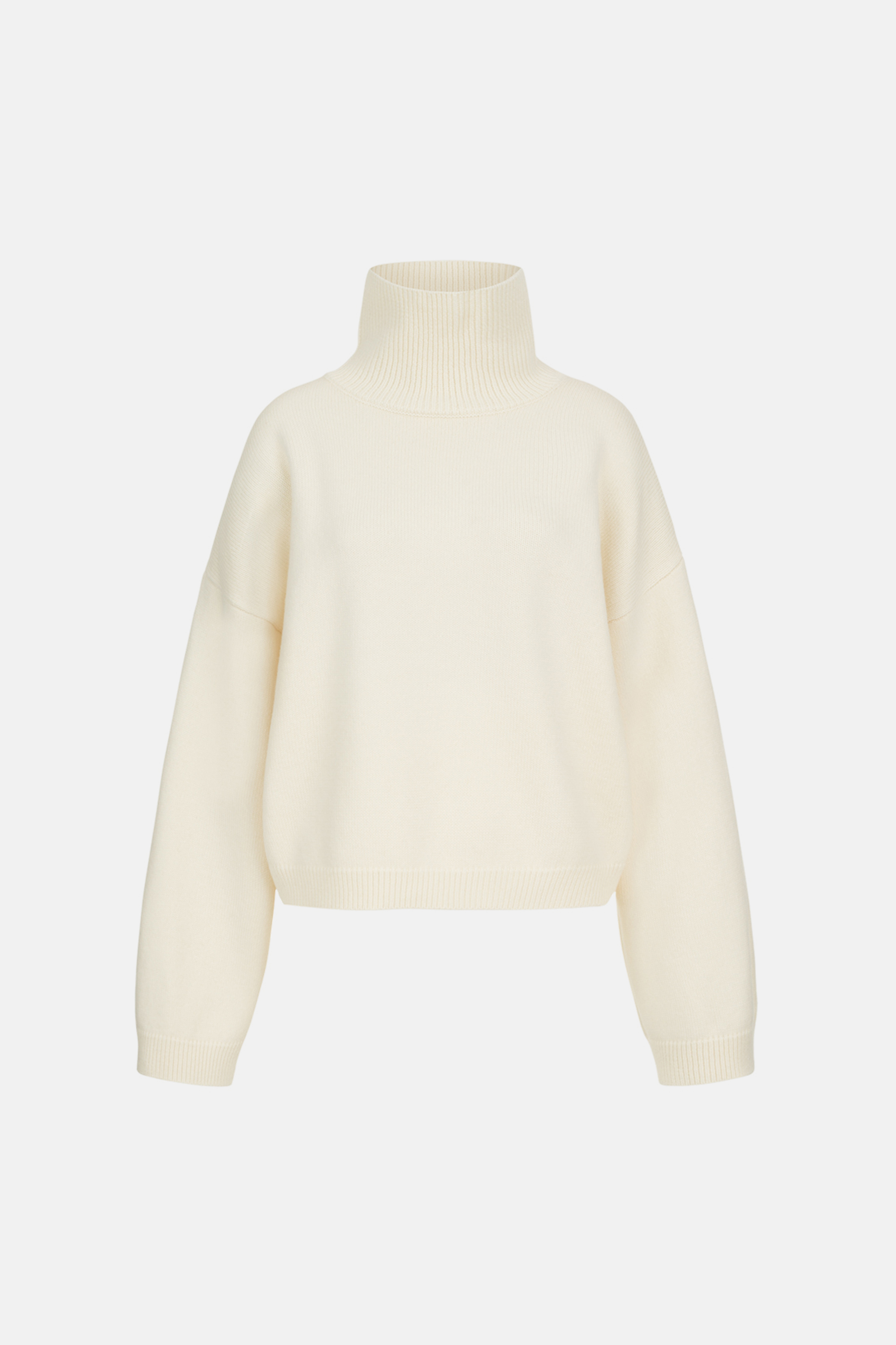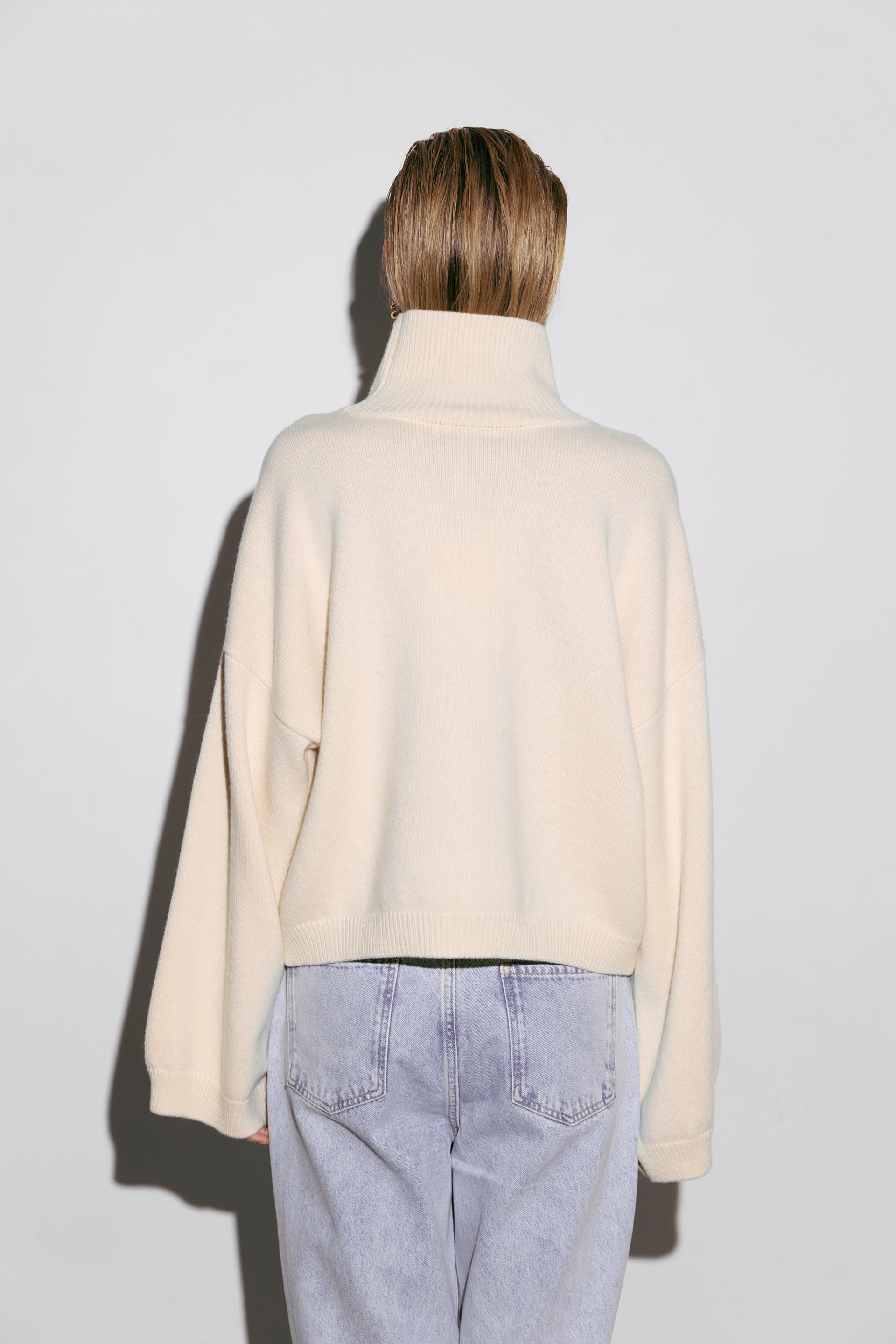 Укорочений оверсайз светр із високим коміром, виконаний з міксу вовни та кашеміру — про сучасний силует і тактильну розкіш. М’яка текстура огортає тіло теплом, а подовжені рукави додають образу розслабленої елегантності. Ідеальний акцент для мінімалістичних луків у холодний сезон, де комфорт зустрічається зі стилем.