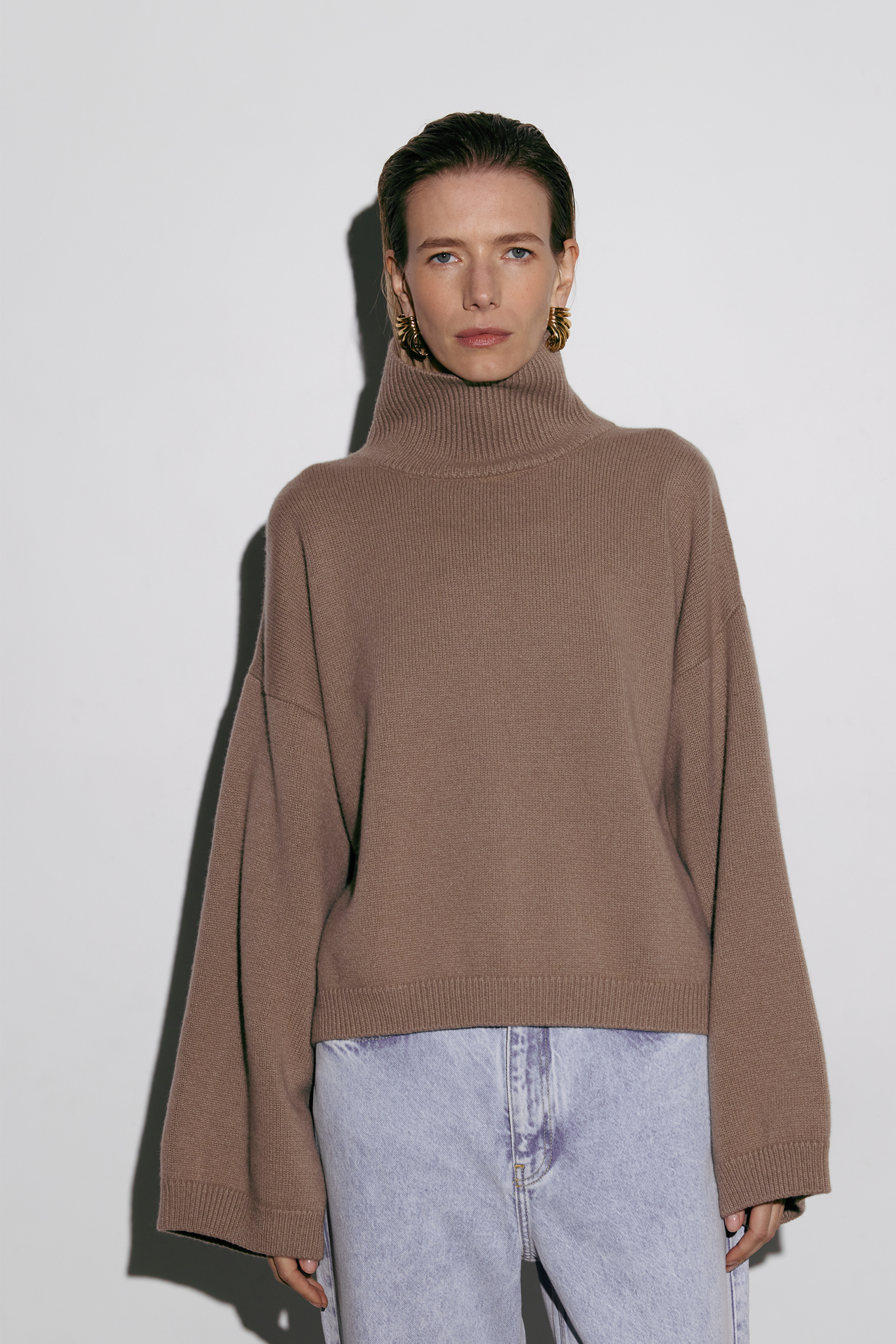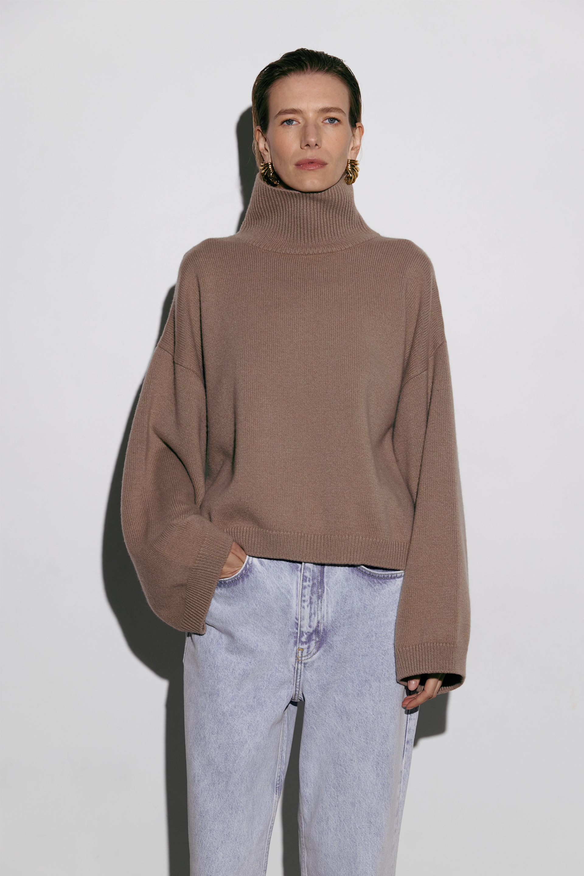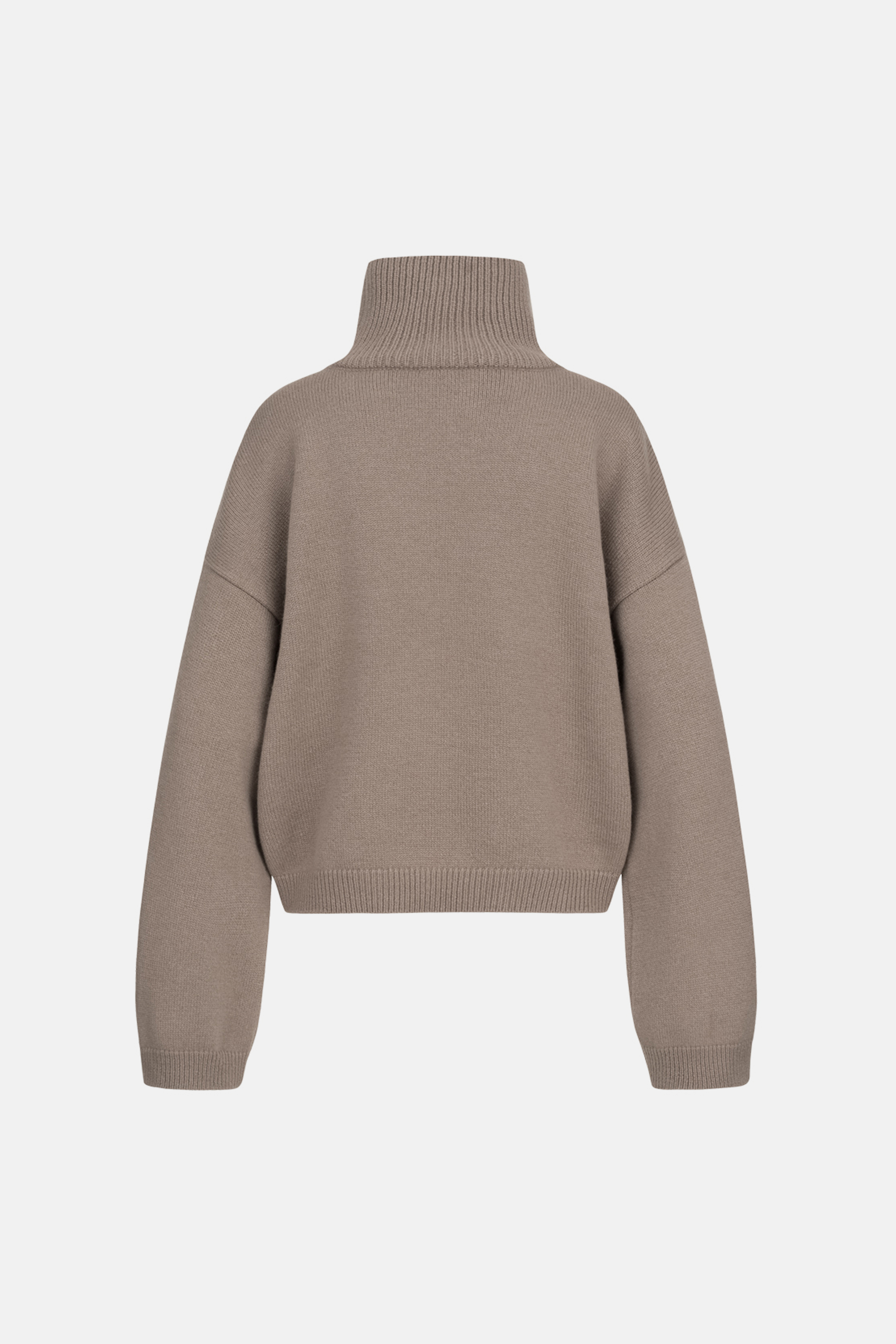 Укорочений оверсайз светр із високим коміром, виконаний з міксу вовни та кашеміру — про сучасний силует і тактильну розкіш. М’яка текстура огортає тіло теплом, а подовжені рукави додають образу розслабленої елегантності. Ідеальний акцент для мінімалістичн