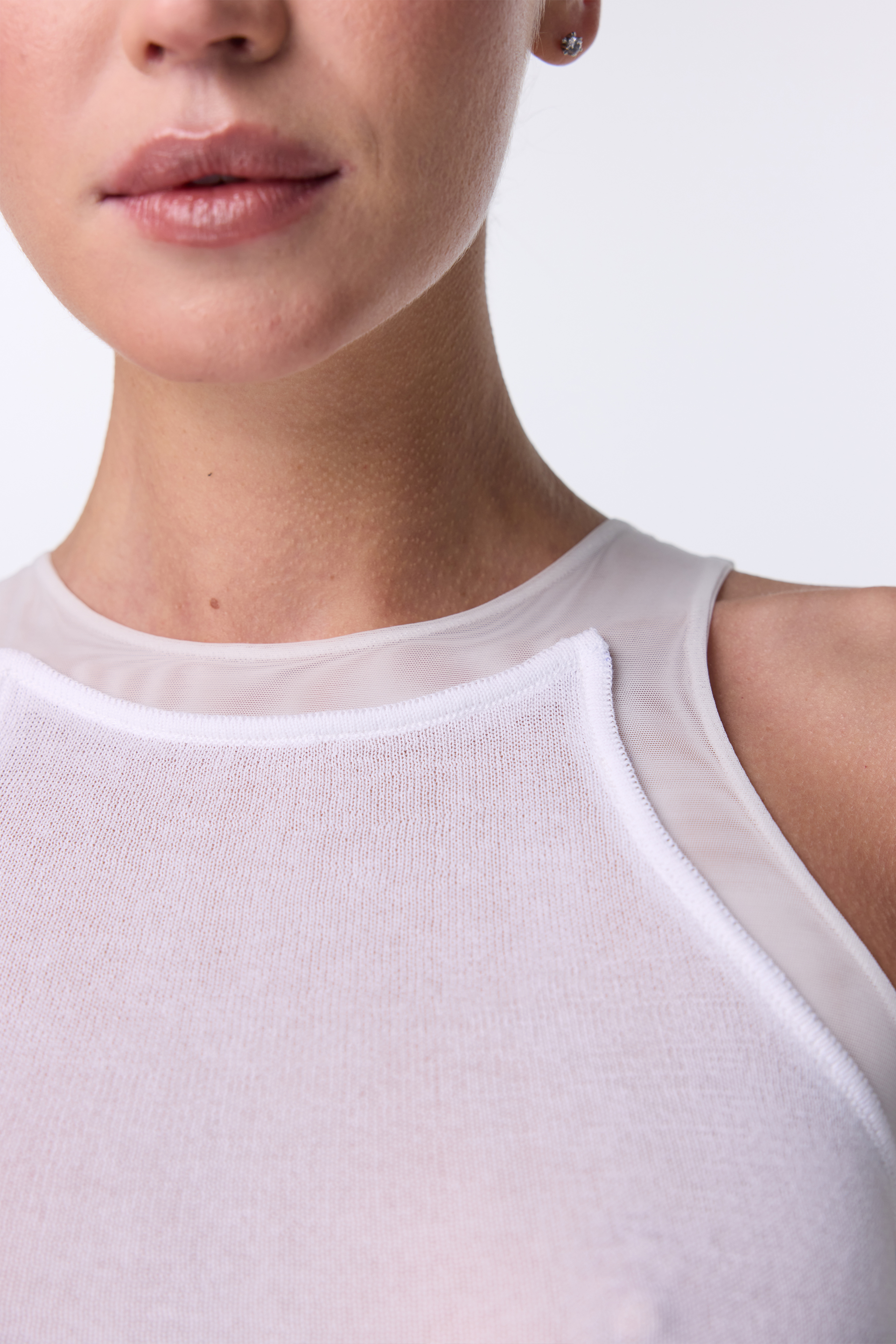 Топ Contour — тонкий і майже прозорий, із чітко вибудуваними лініями, що повторюють анатомію тіла. Легка тканина м’яко прилягає до шкіри, створюючи ефект другої оболонки без відчуття обмеження. Топ працює як делікатна основа для багатошарових образів або самостійний акцент із відчуттям інтимної стриманості.