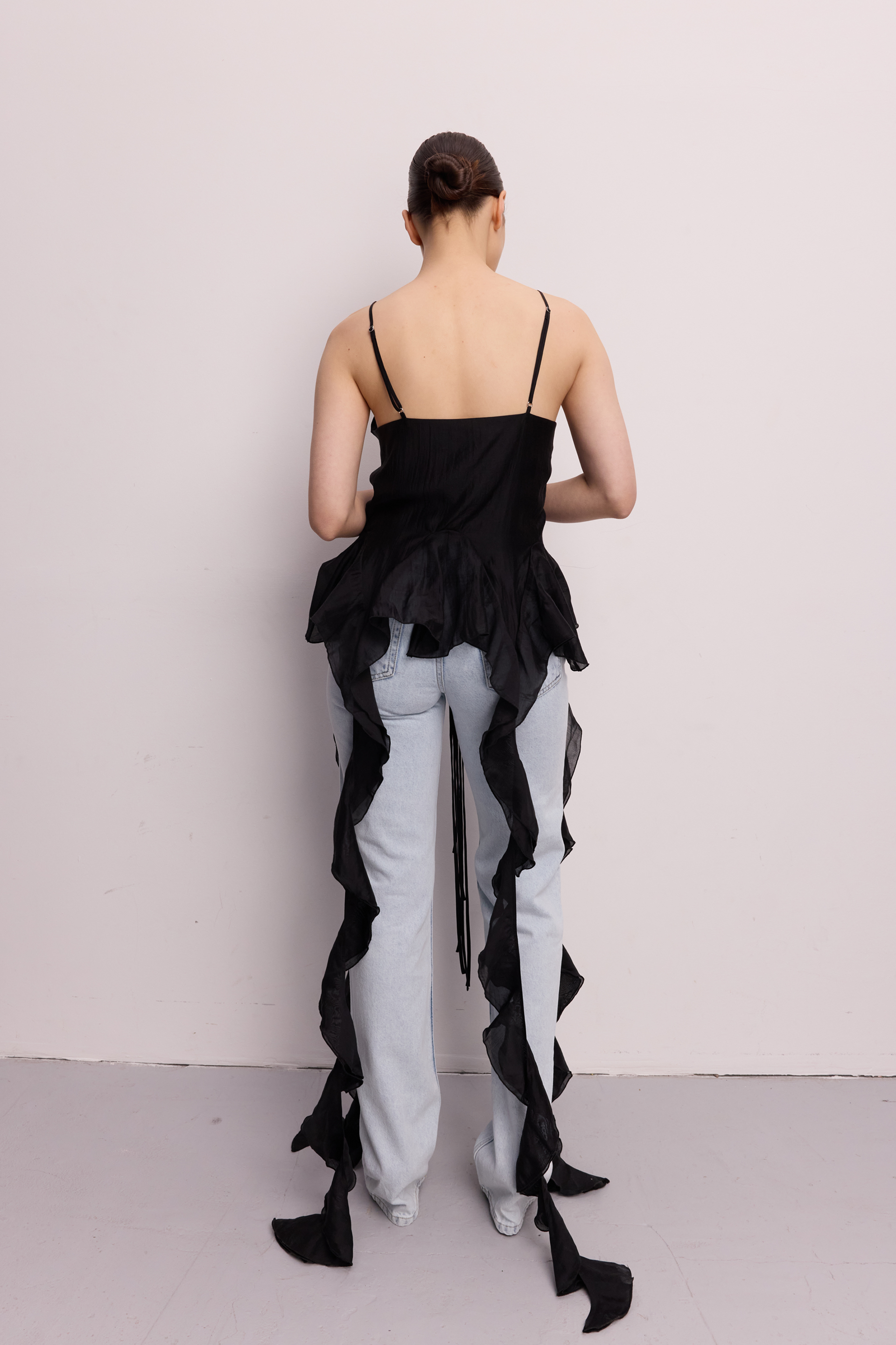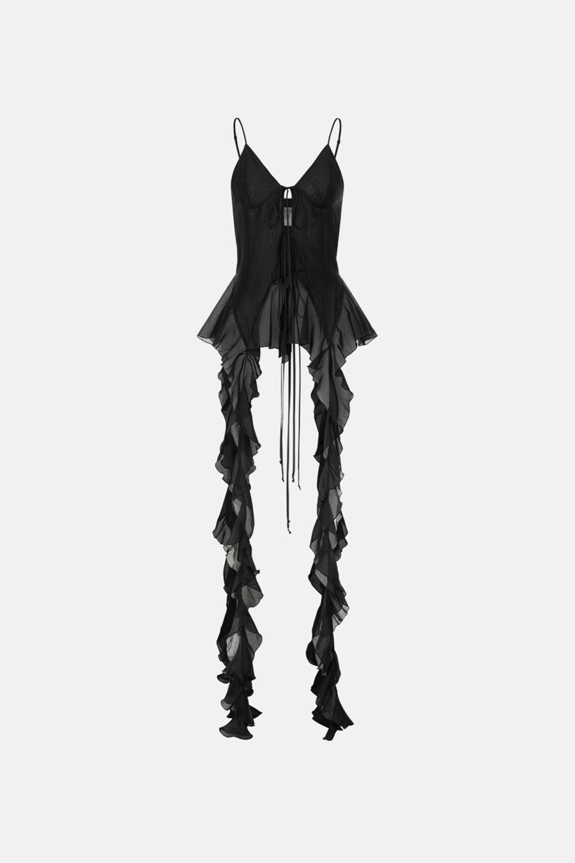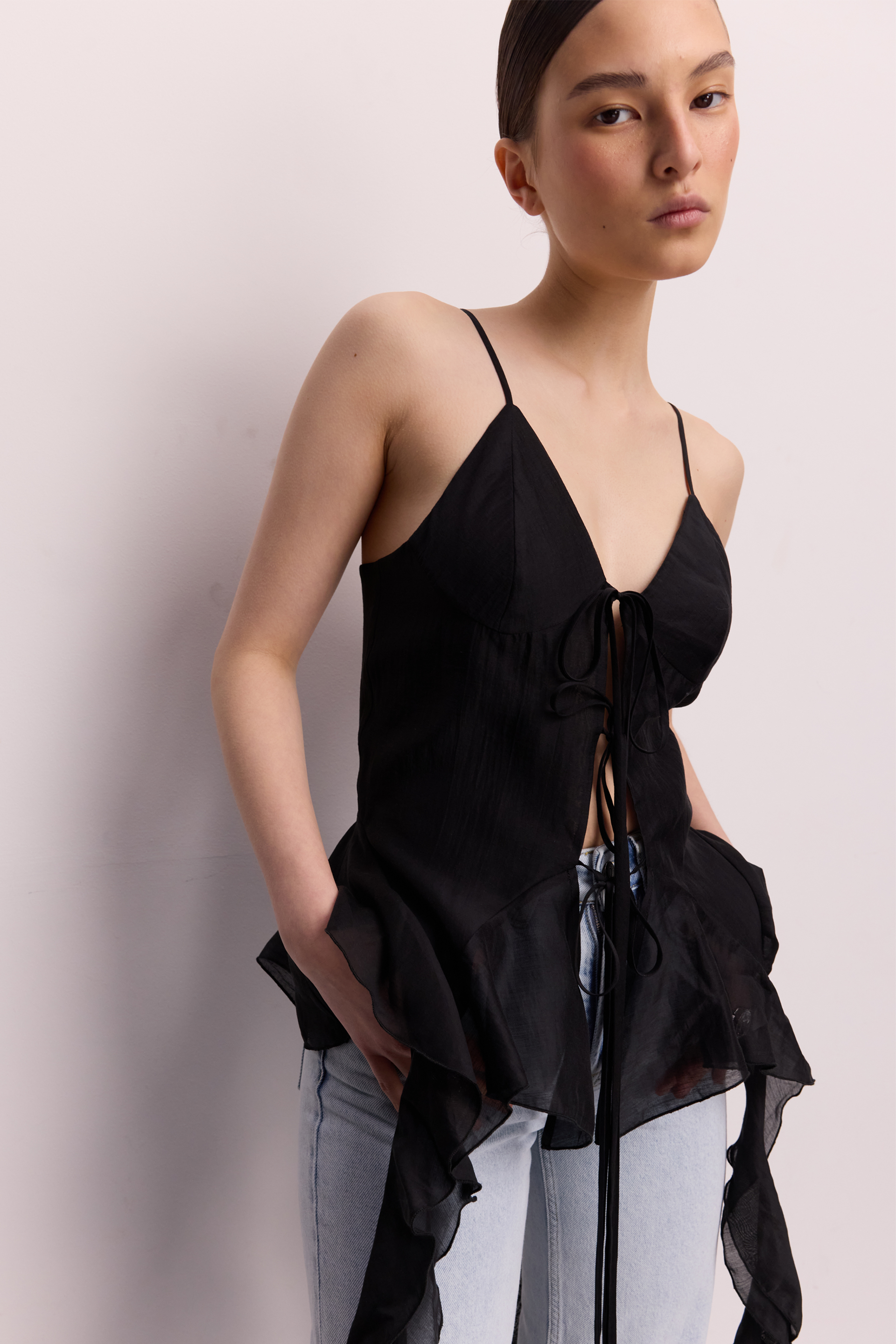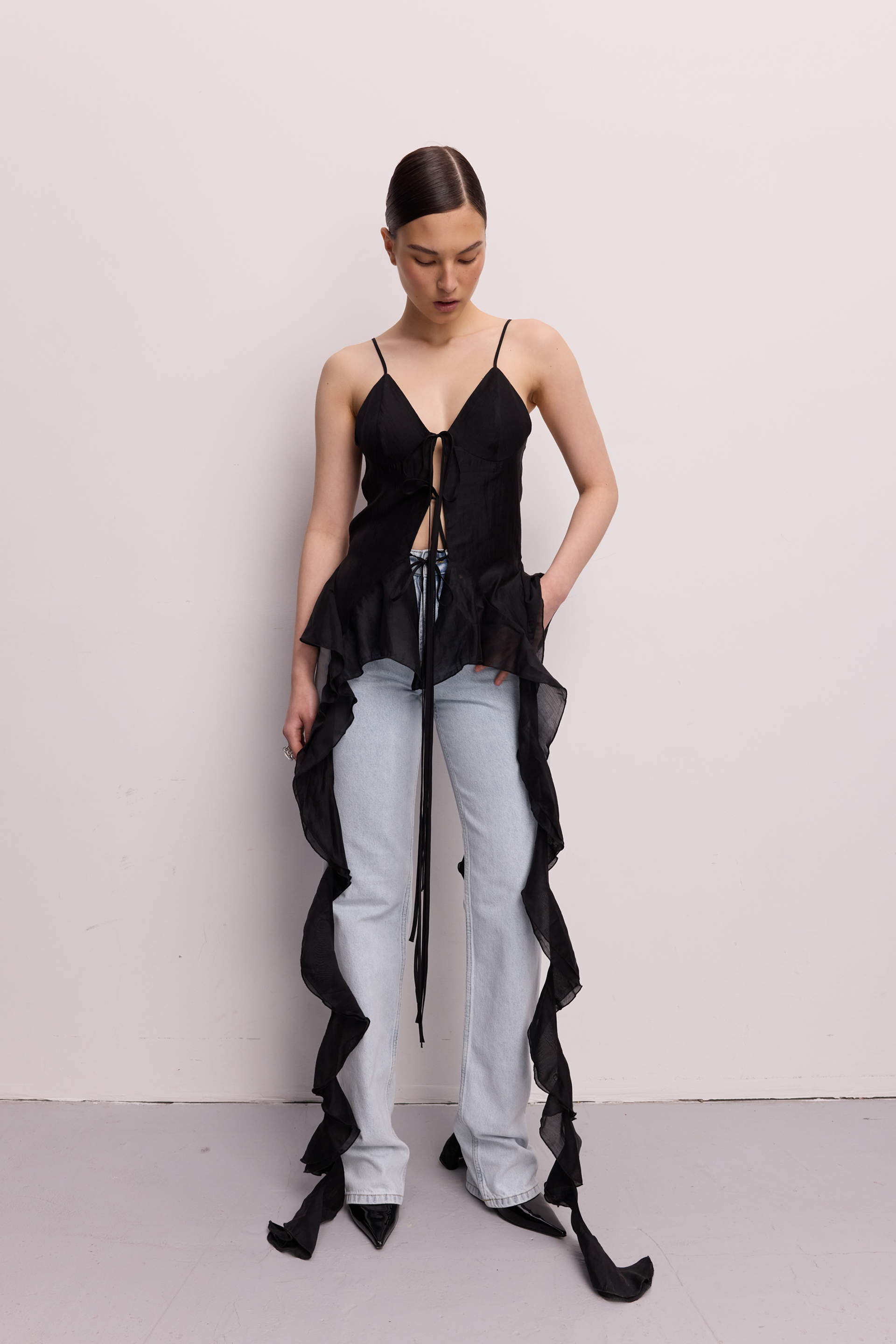 Ефектний силует із шепітом провокації — Murmur top зачаровує з першого погляду. Виготовлений із м’якого тенселу, він огортає тіло струмливою легкістю, а фігурні волани, що спадають донизу, створюють драматичну динаміку у русі. Зав’язки спереду додають грайливості, роблячи цей топ не просто елементом гардеробу, а візуальним акцентом з настроєм. Ідеальний для вечірніх виходів.