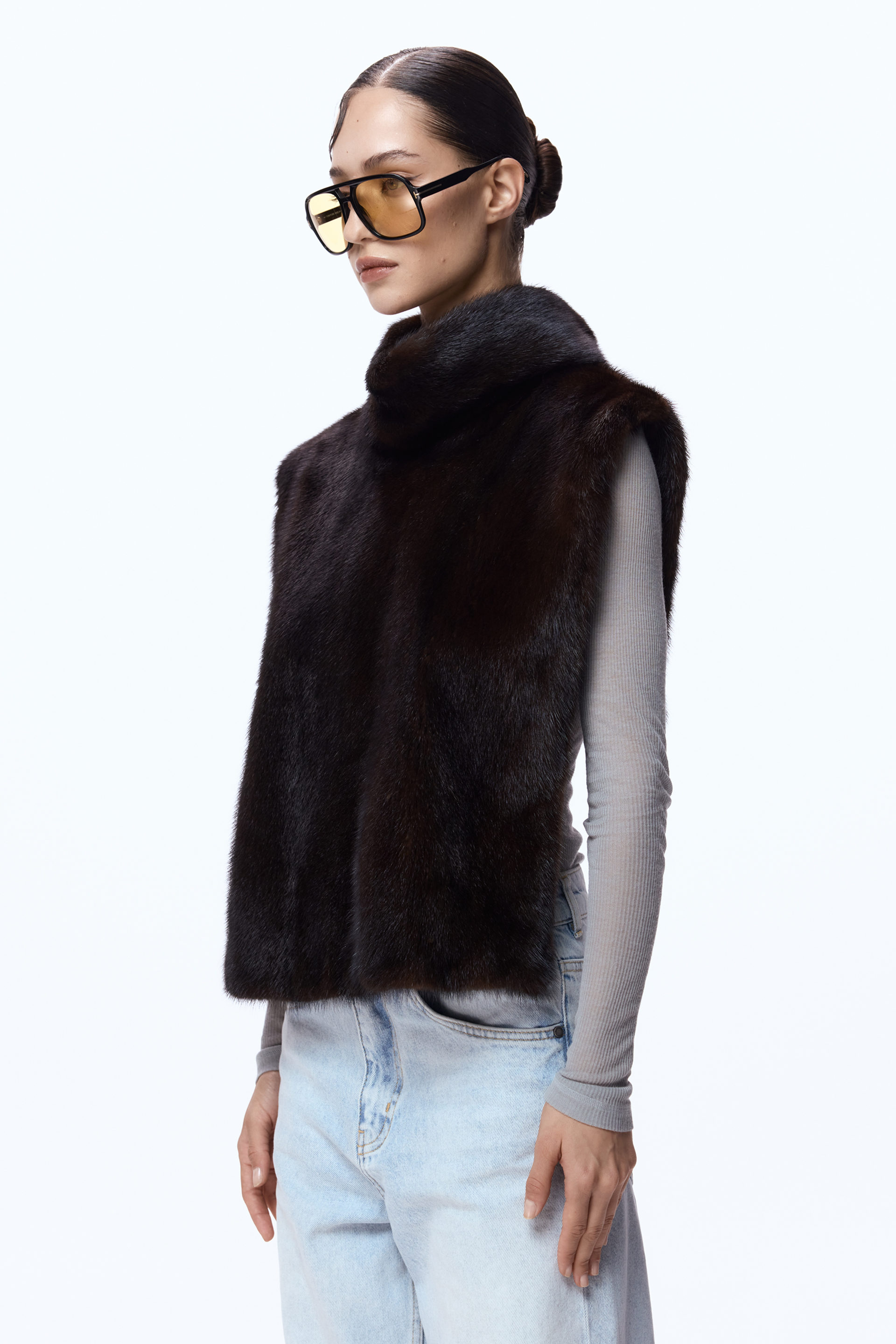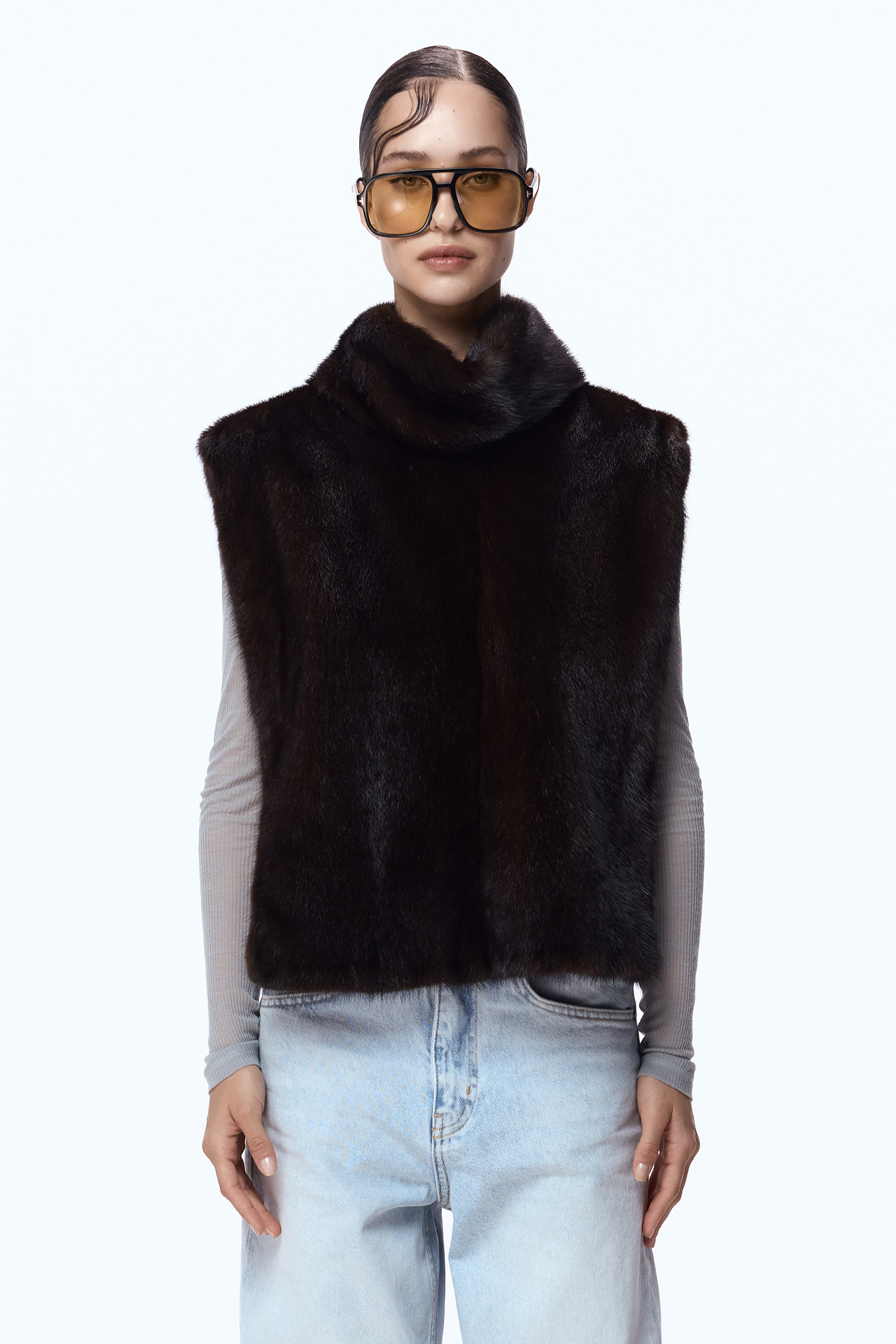 Вінтажна манішка — розкішний аксесуар із натурального хутра норки, що поєднує тепло і елегантність. Темно-коричневий відтінок і стоячий комір додають образу вишуканості та впевненого характеру. BAZHANE відроджує вінтажне хутро, переосмислюючи його через рух reuse та recycle — ця манішка створена, щоб продовжити життя унікальному матеріалу з минулого.
