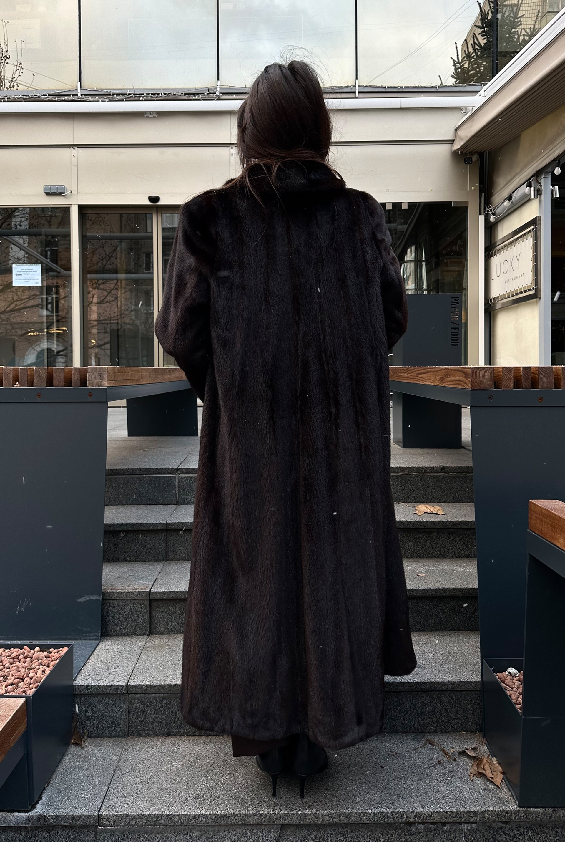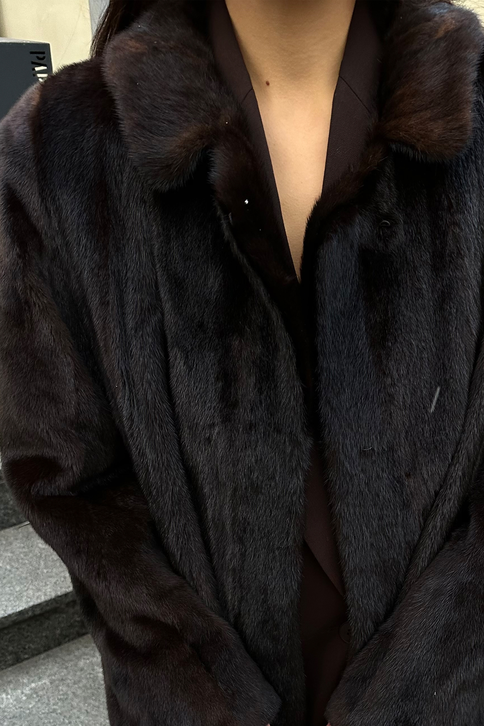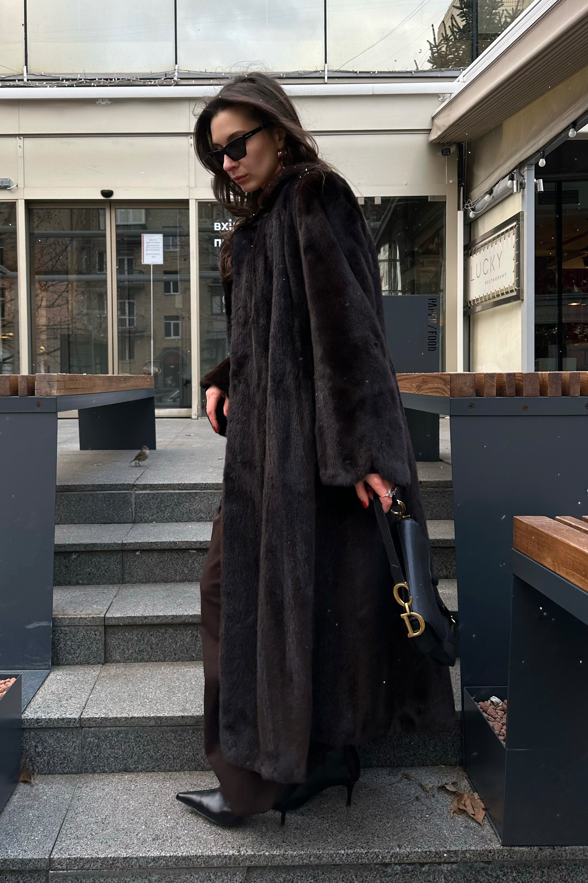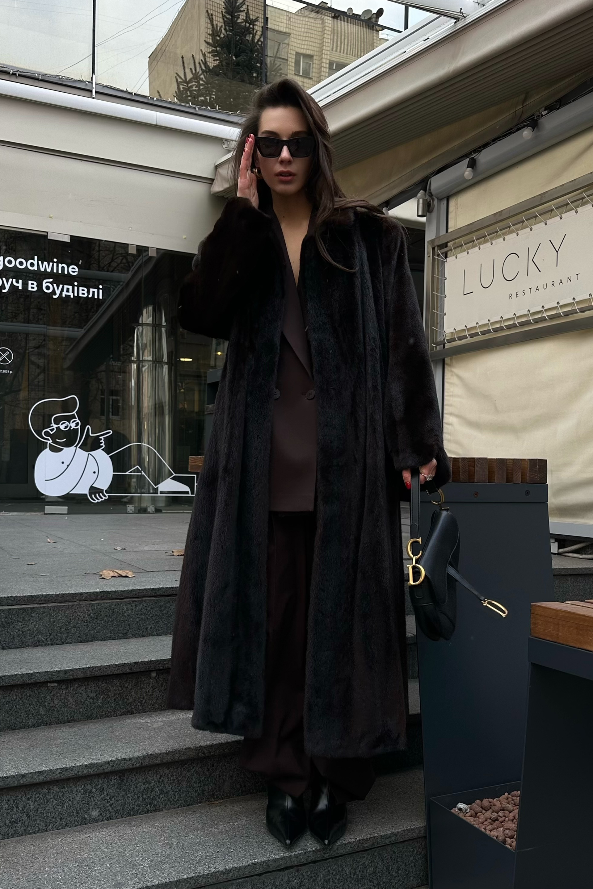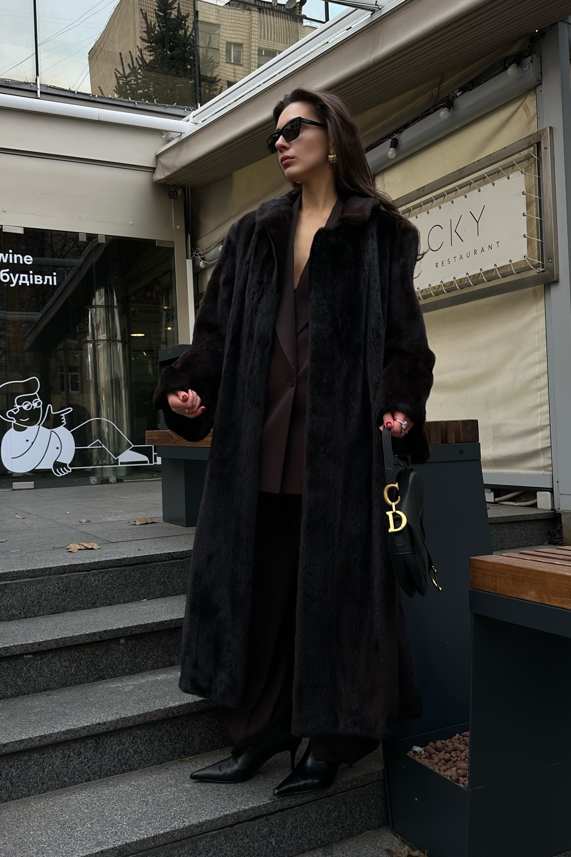 Шуба прямого крою з англійським коміром — класика, що ніколи не втрачає актуальності. Виготовлена з натурального хутра норки, вона дарує відчуття тепла й витонченого комфорту. Глибокий темно-коричневий відтінок робить цю модель універсальною для різних стилів — від стриманого ділового до розкішного вечірнього. Ідеальний вибір для формування елегантного зимового гардероба. Гармонійно поєднується з класичними аксесуарами й лаконічними сумками для завершеного образу.