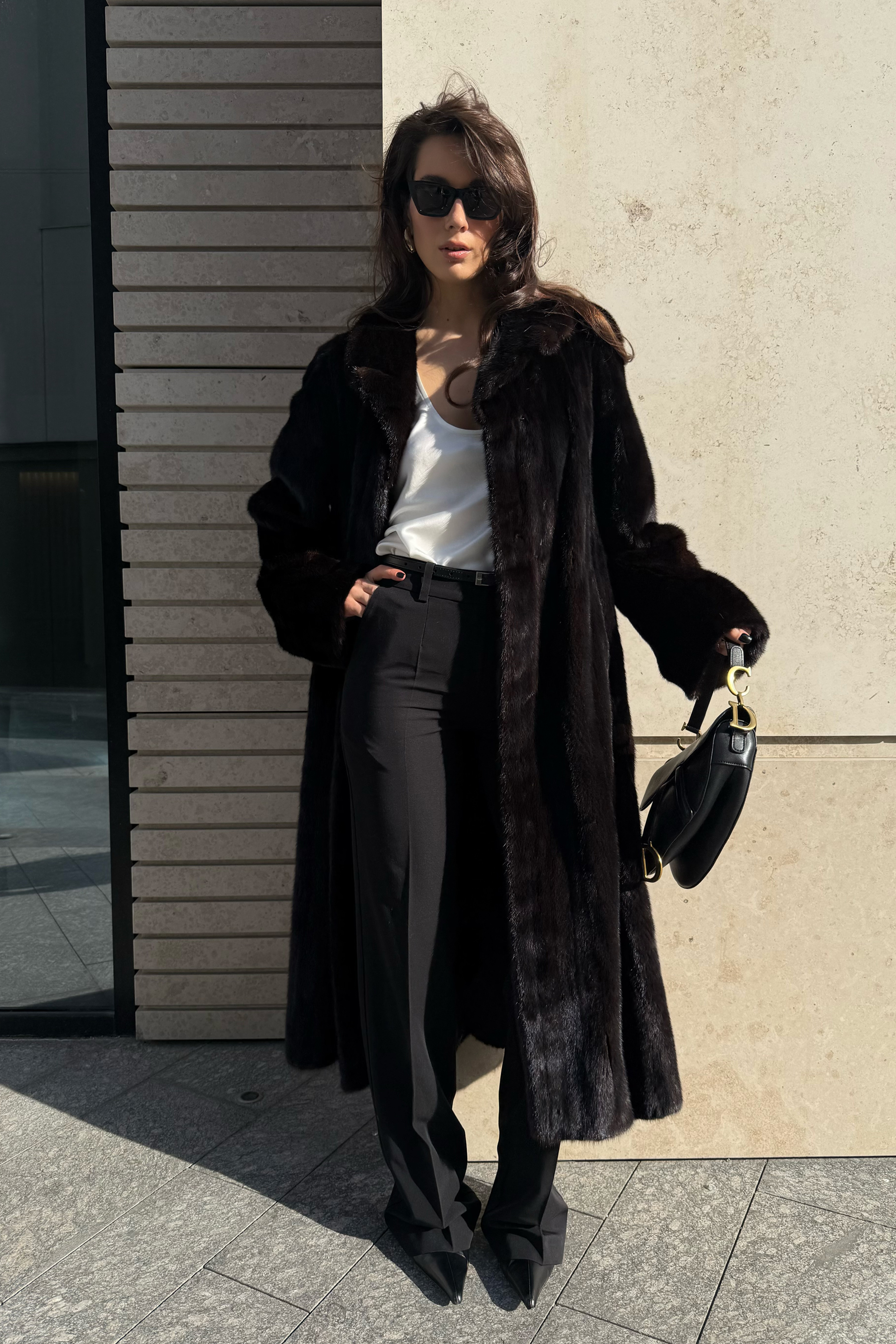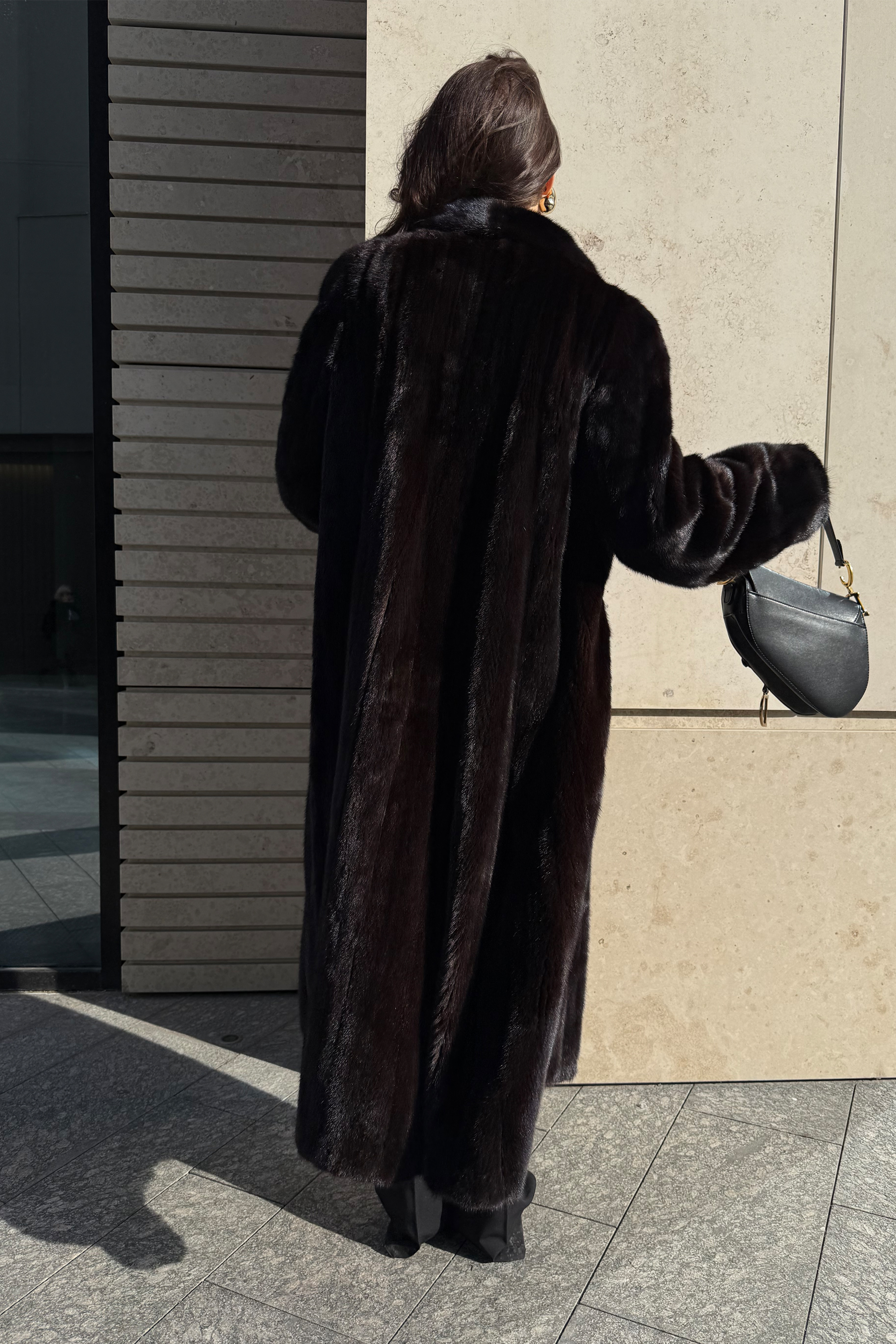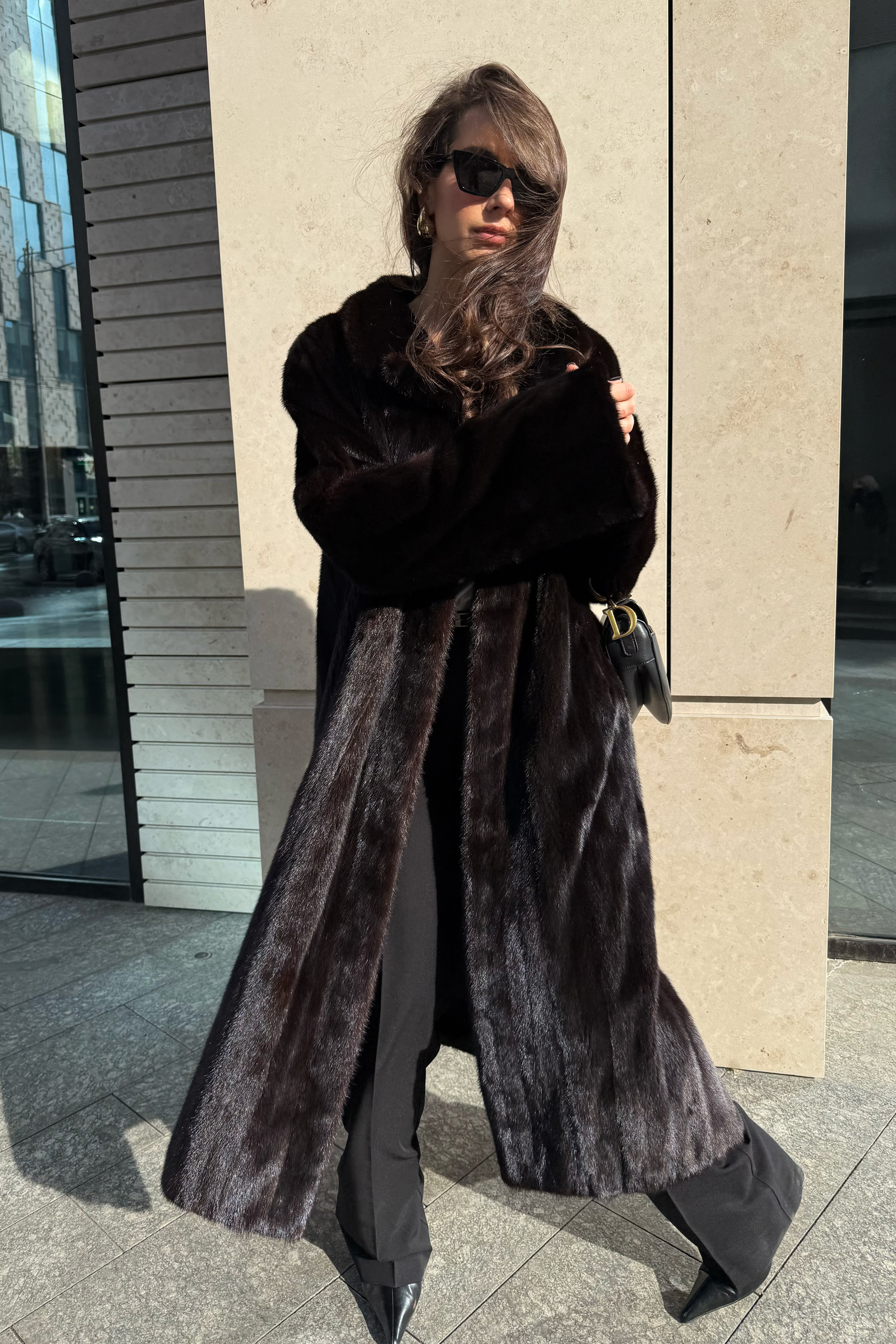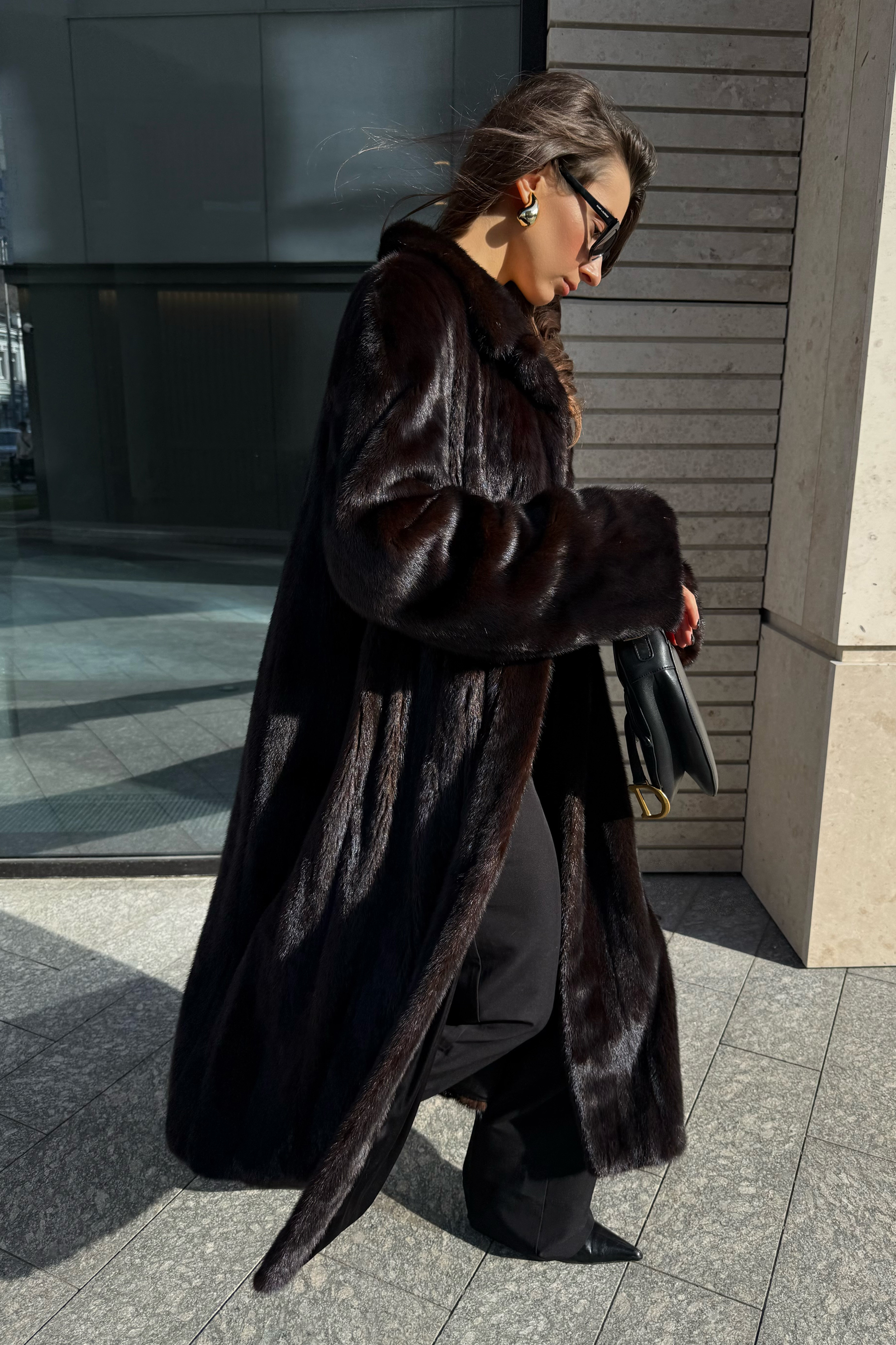 Довга шуба BAZHANE vintage з натурального хутра норки Saga Mink — це втілення елегантності та розкоші. Глибокий коричневий відтінок, класичний англійський комір і бездоганна якість хутра створюють вишуканий образ, що поза часом. Легка, м'яка та неймовірно комфортна, ця шуба стане справжньою перлиною гардеробу.
