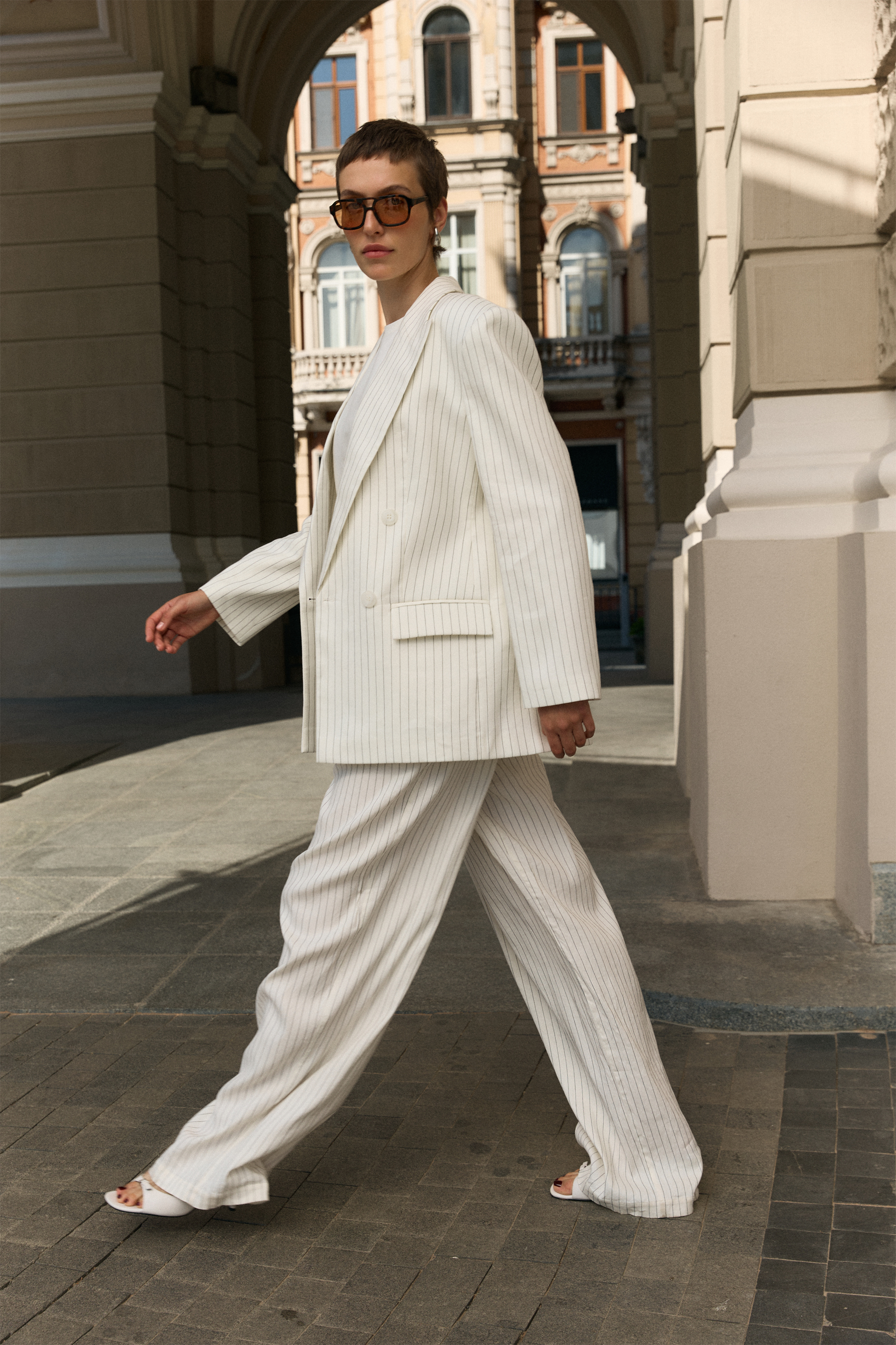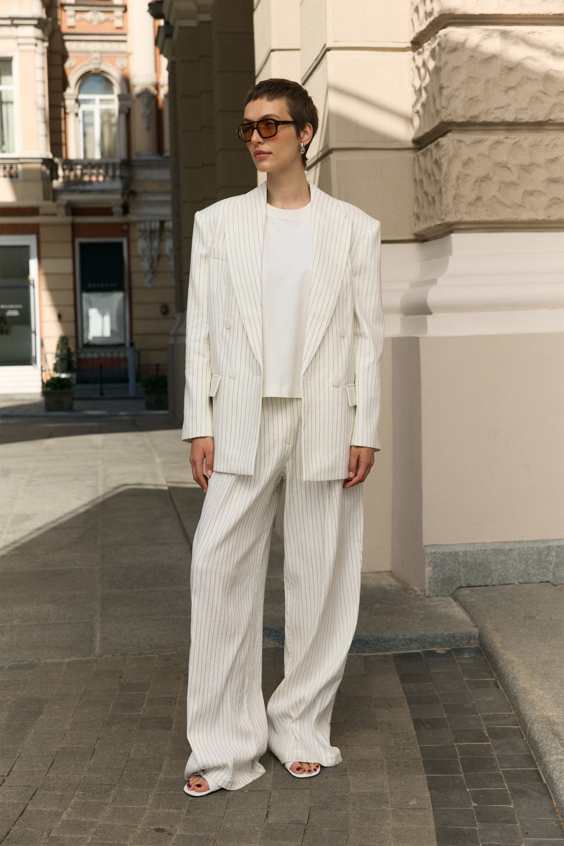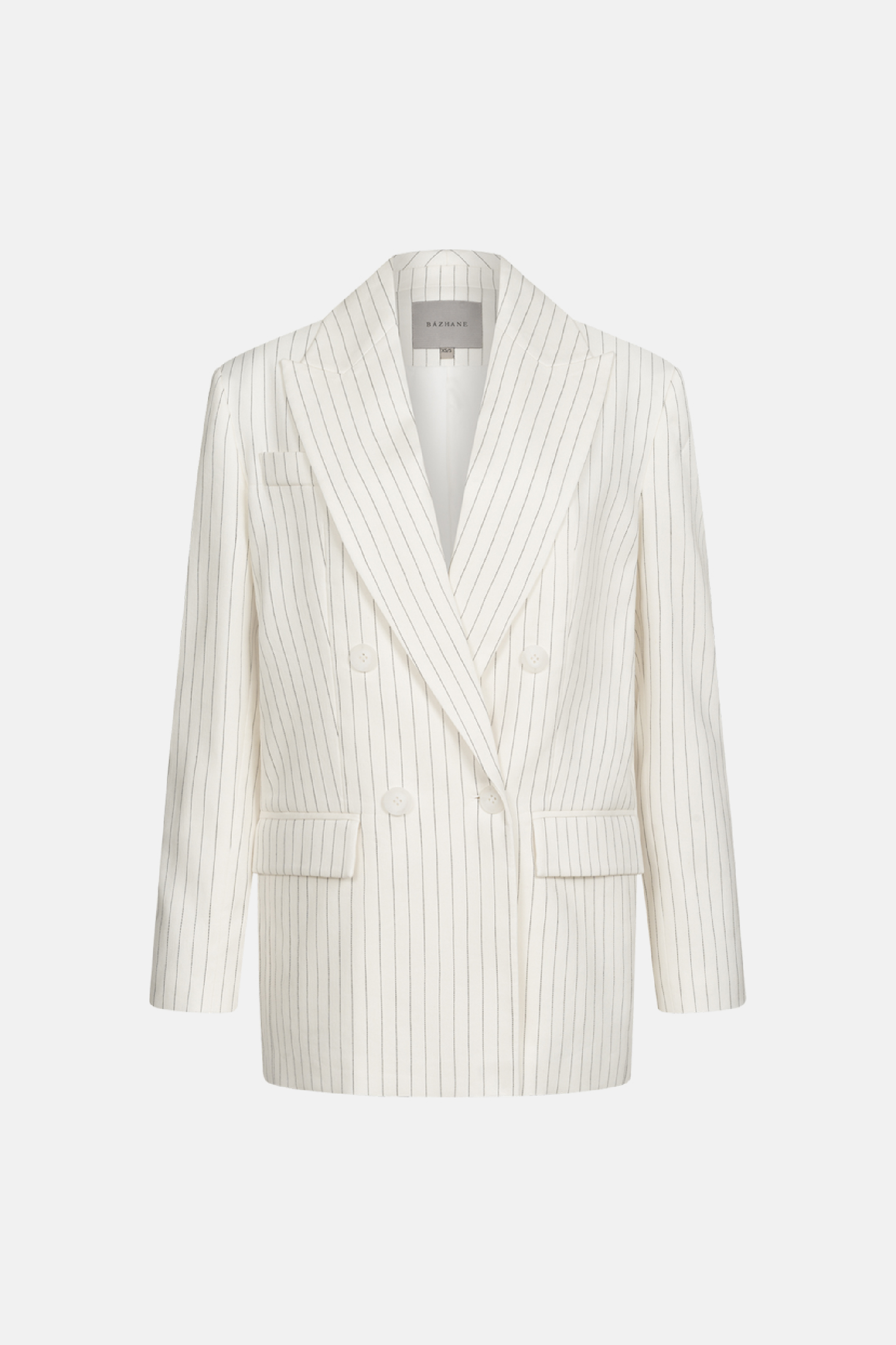 Жакет двобортний оверсайз з підплічниками. Виготовлений з міксу льону та віскози, що забезпечує легкість і дихаючі властивості. Ідеальний вибір для створення стильних образів на теплі сезони. Гармонійно виглядає з брюками, спідницями або лонгслівами.