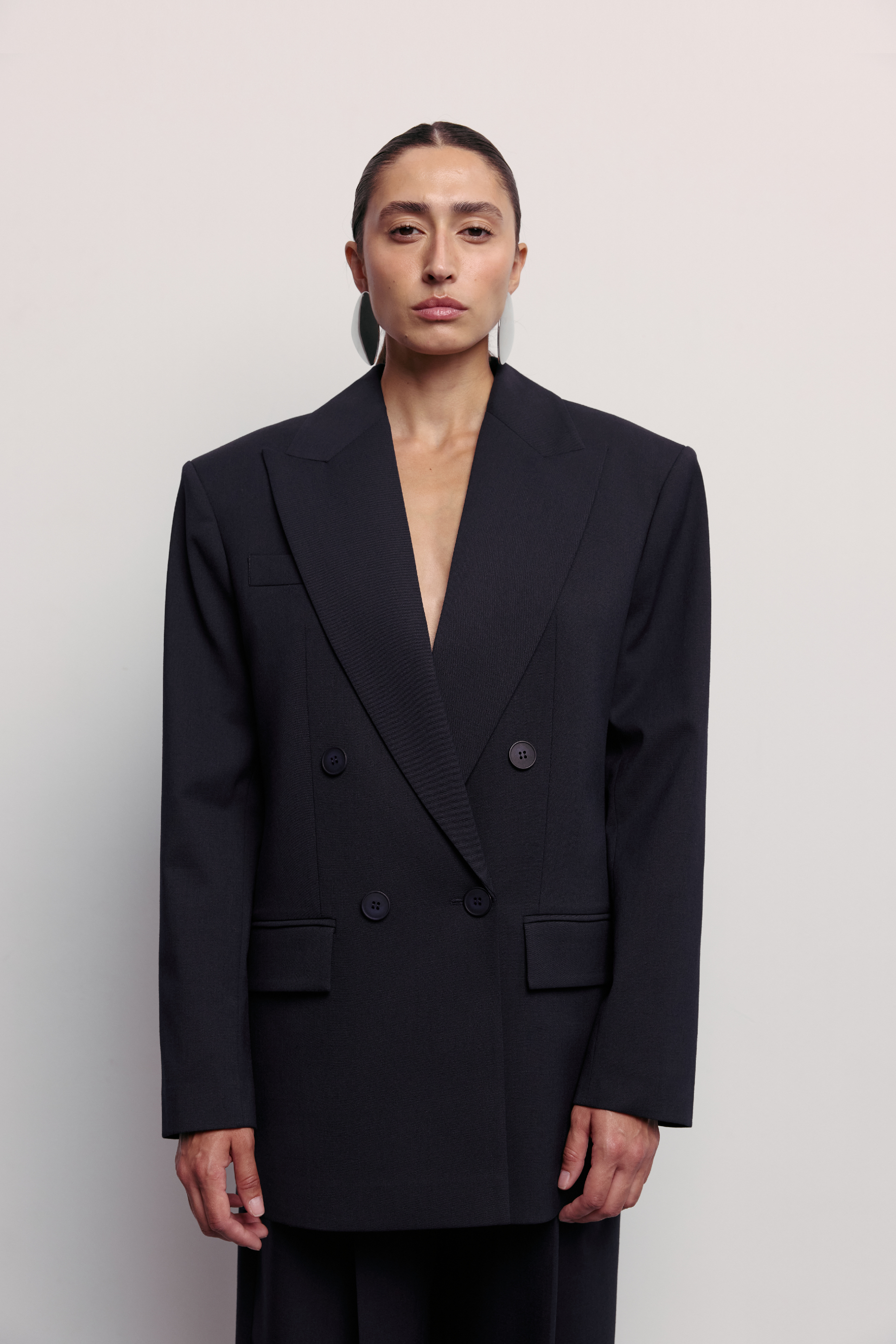 Жакет двобортний оверсайз з підплічниками. Виготовлений з virginwool, що забезпечує тепло та комфорт. Ідеальний вибір для створення елегантних образів на кожен день.