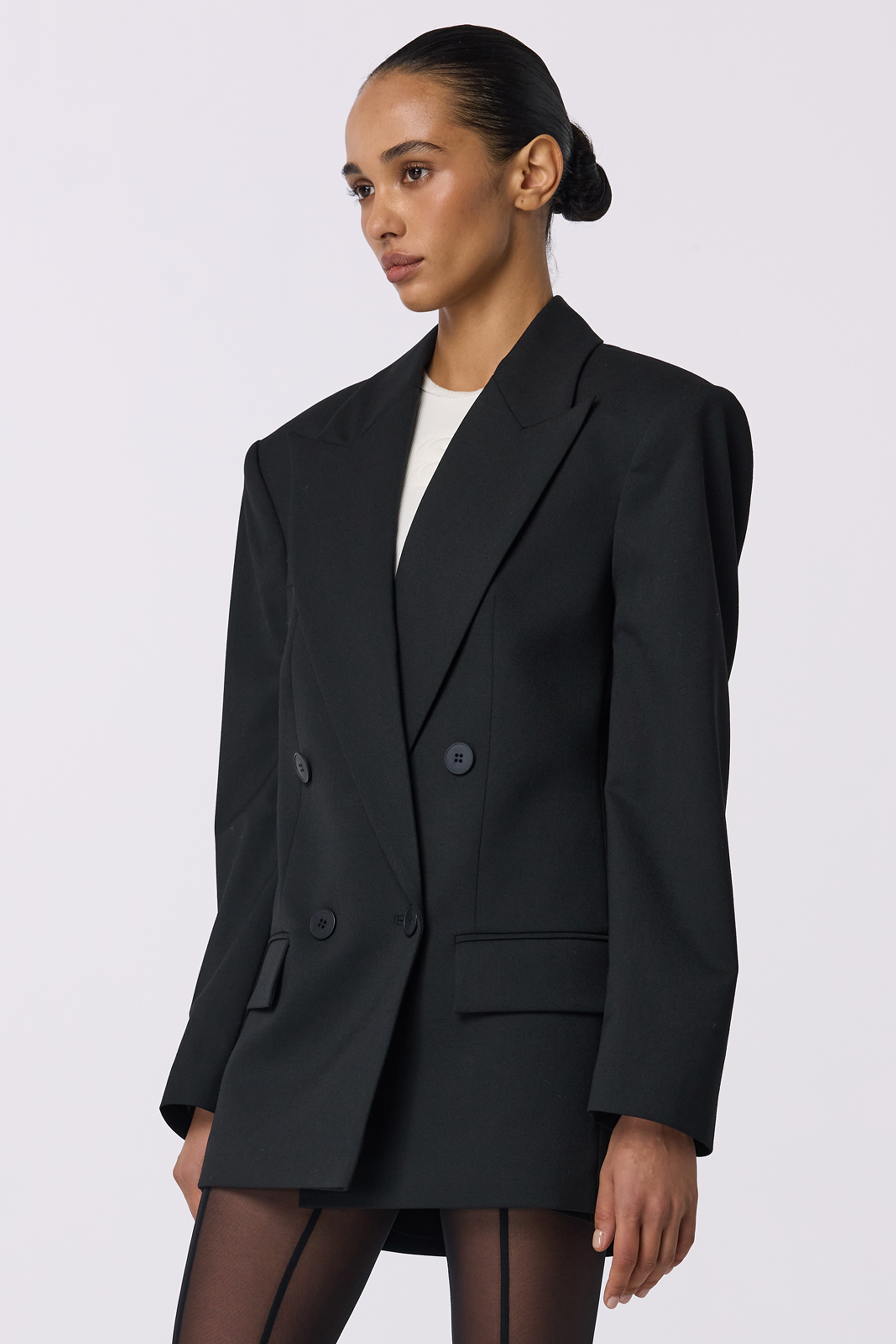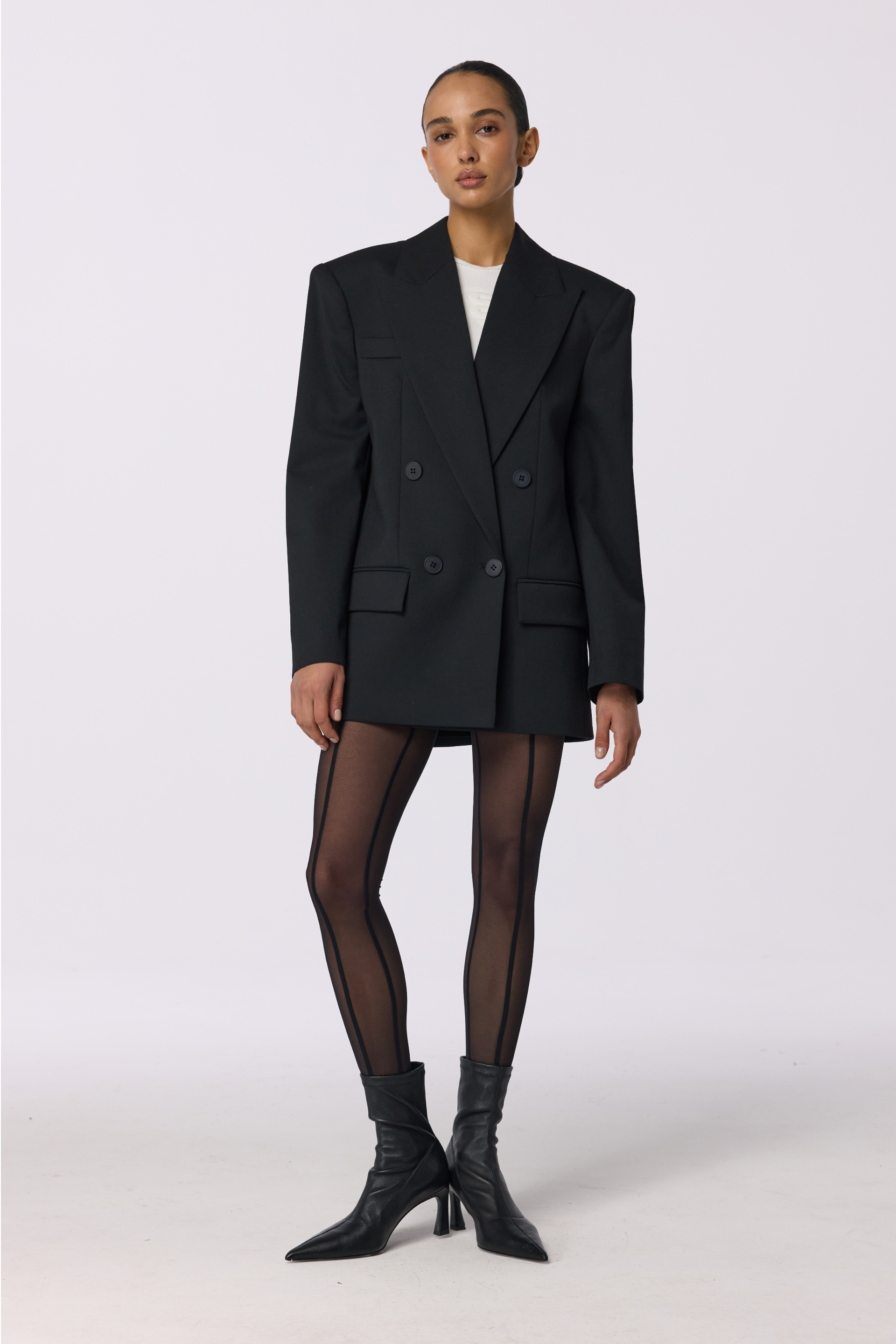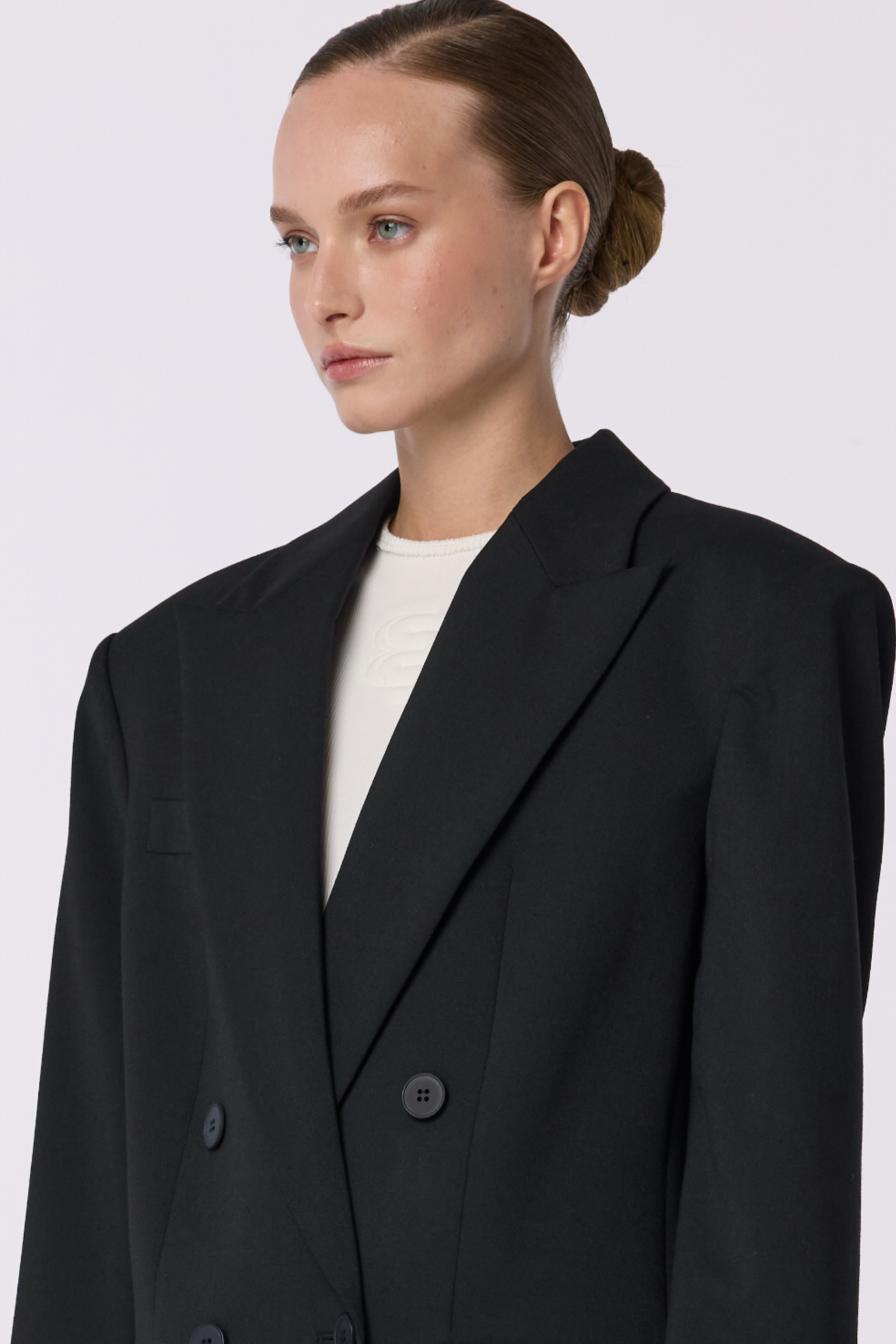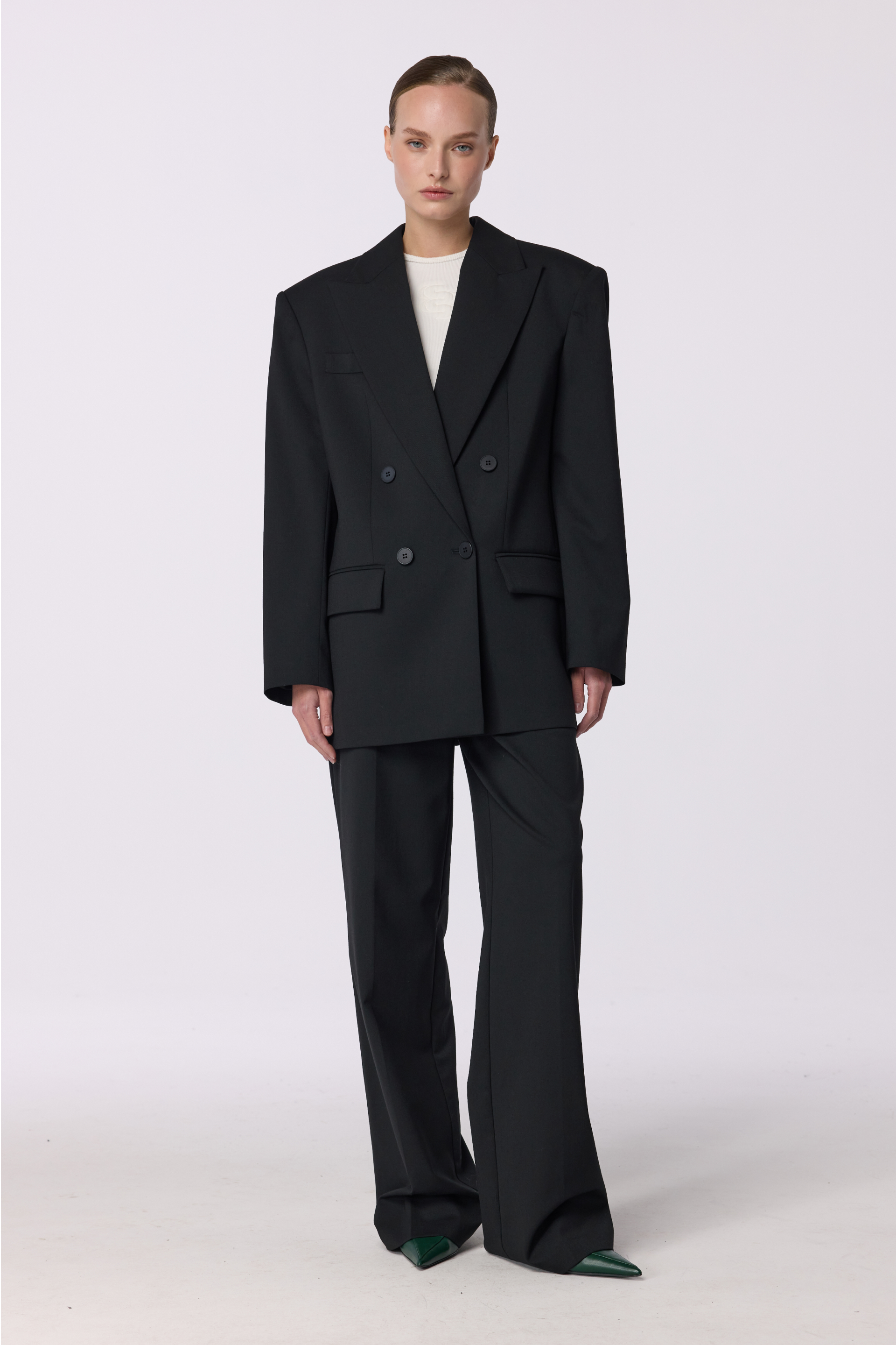 Жакет двобортний оверсайз з підплічниками. Виготовлений з virginwool, що забезпечує тепло та комфорт. Ідеальний вибір для створення елегантних образів на кожен день.