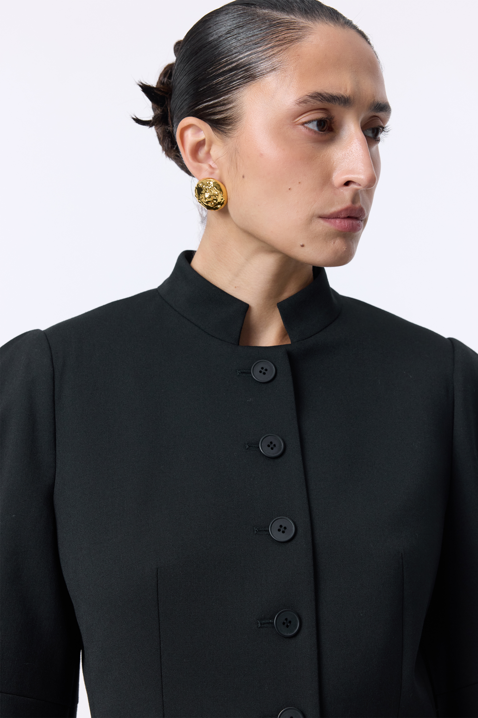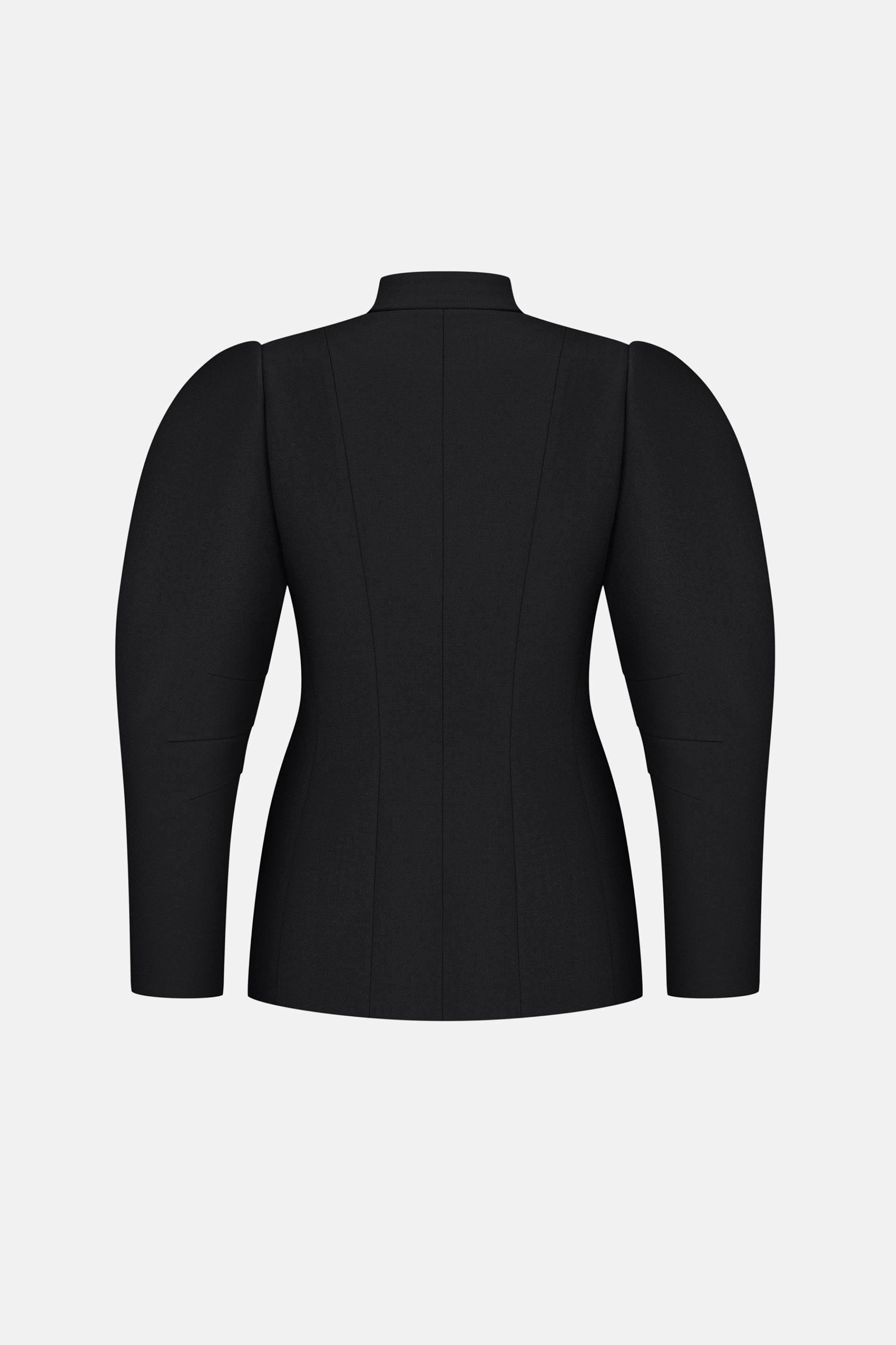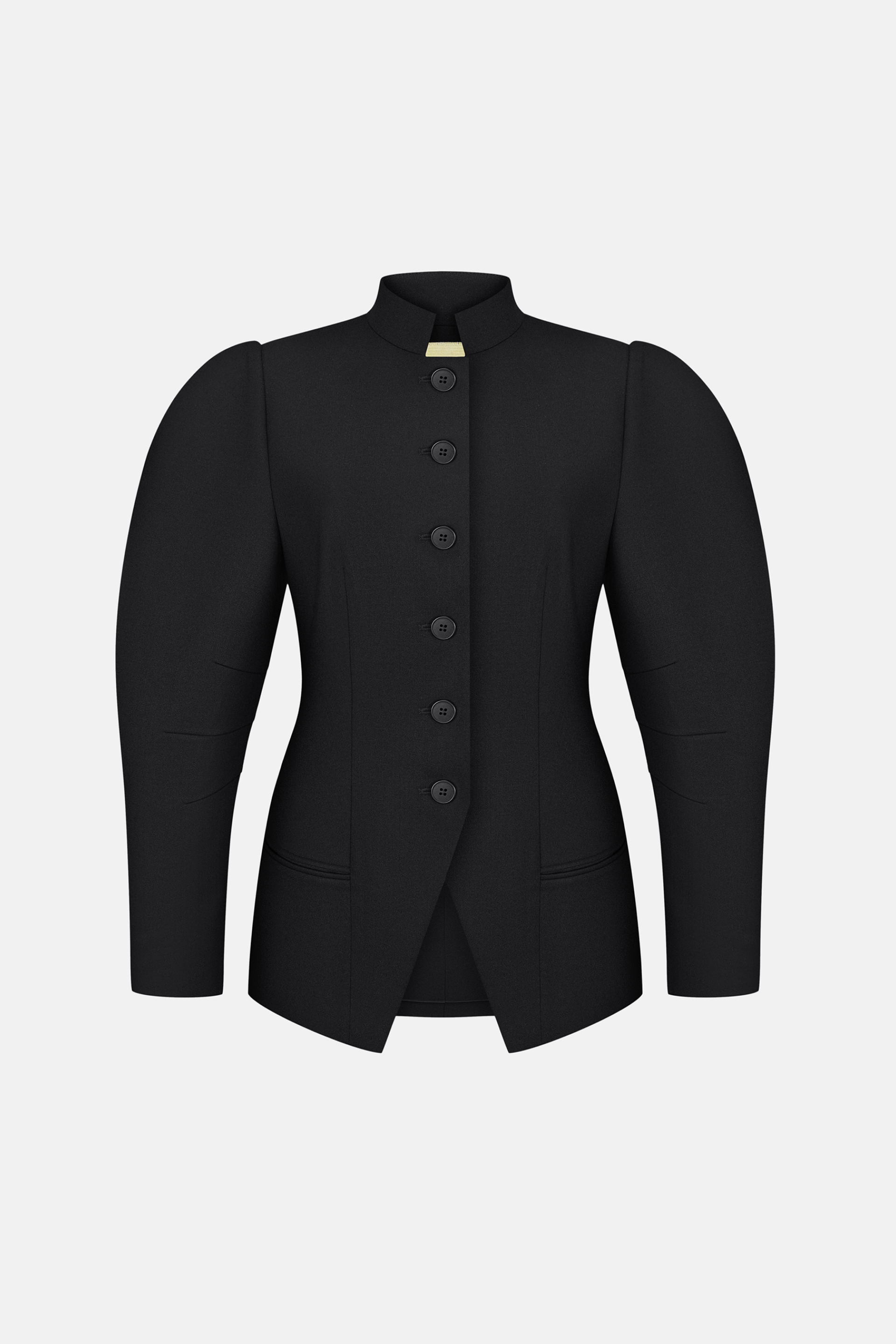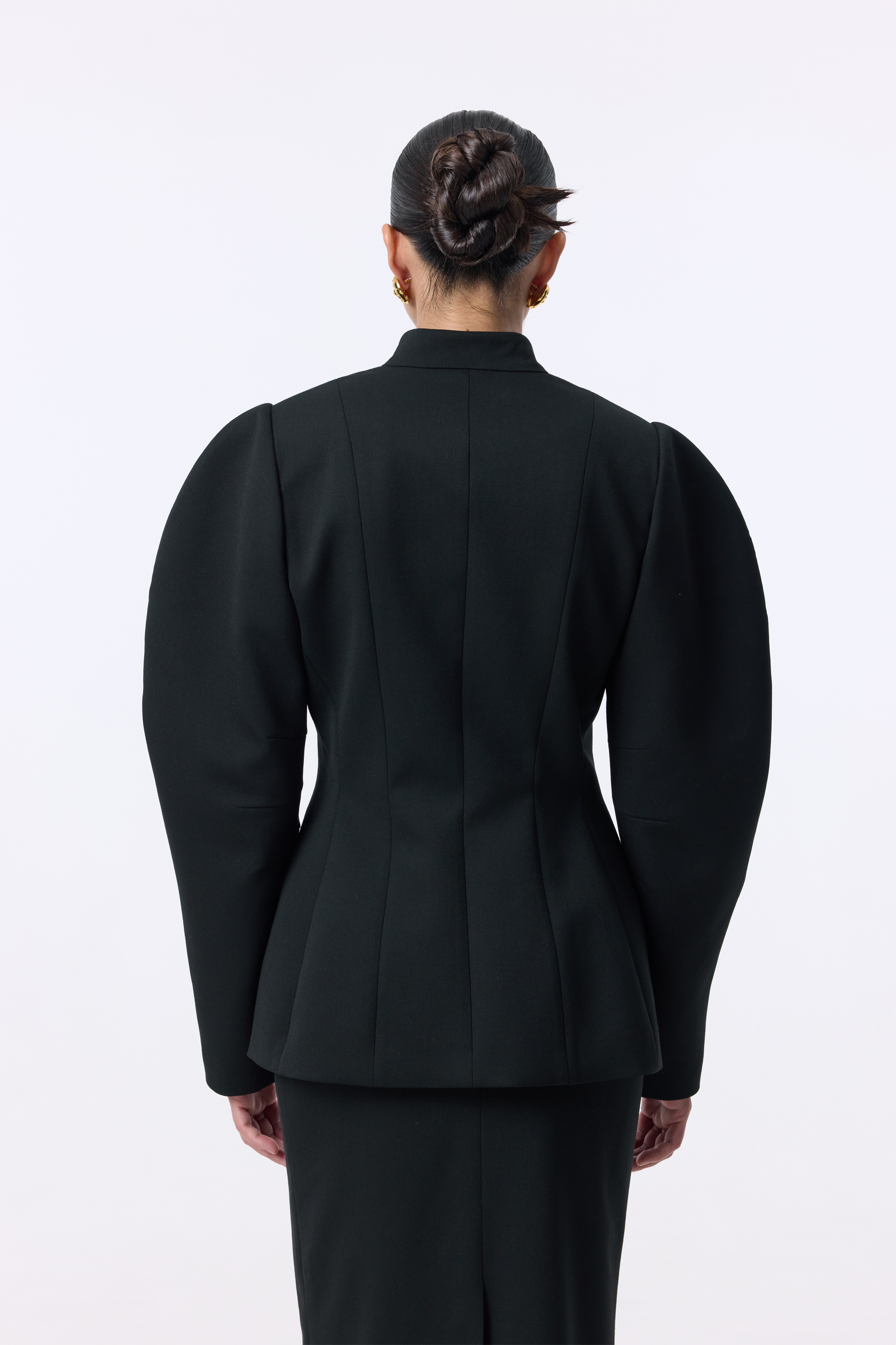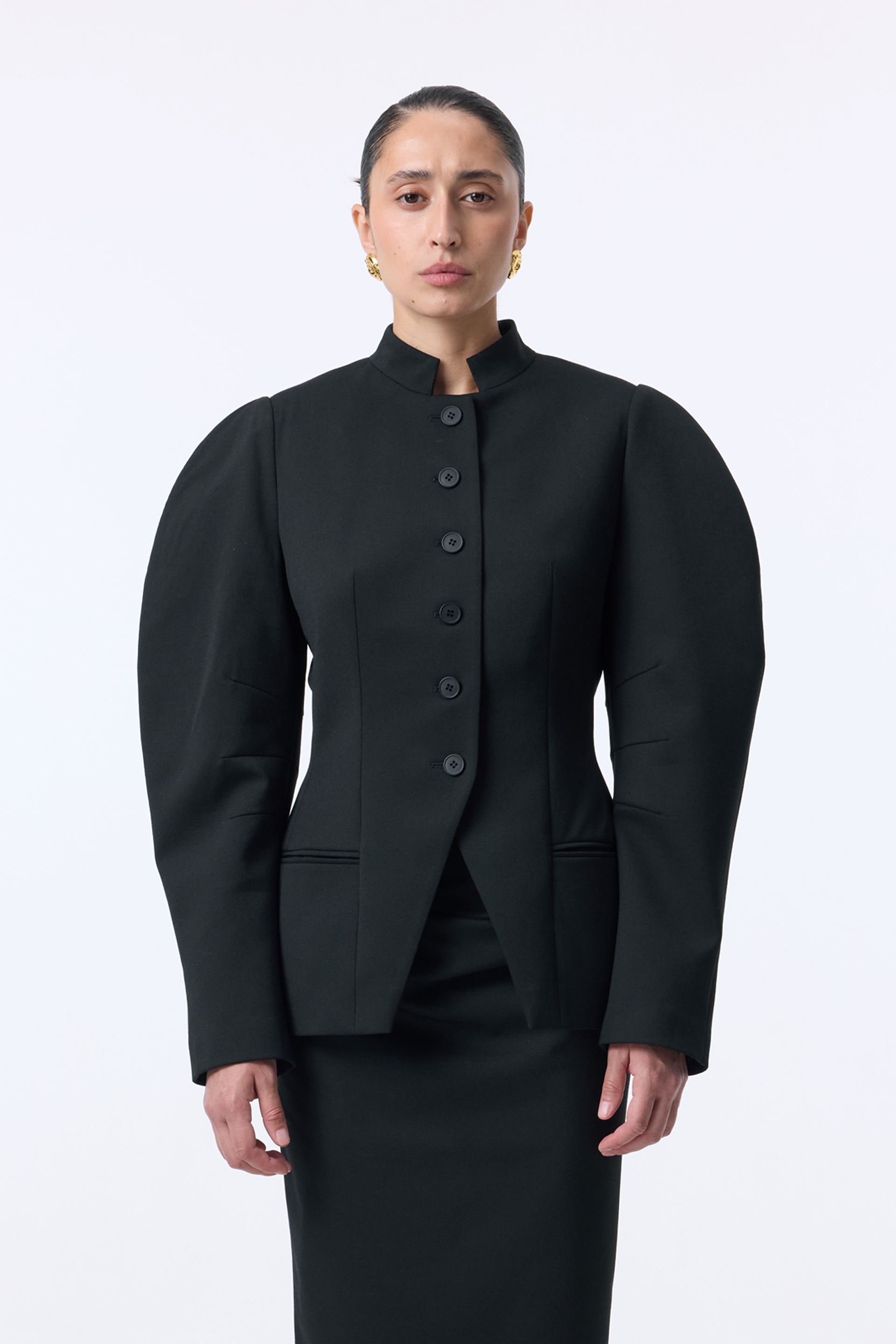 Жакет Tusk — скульптурна модель із чіткими лініями та виразними об’ємними рукавами. Комір-стійка й ряд ґудзиків по центру підкреслюють строгість силуету, тоді як приталений крій додає елегантної структури. Виконаний з міксу віскози, котону та еластану, що забезпечує комфорт і легкість.