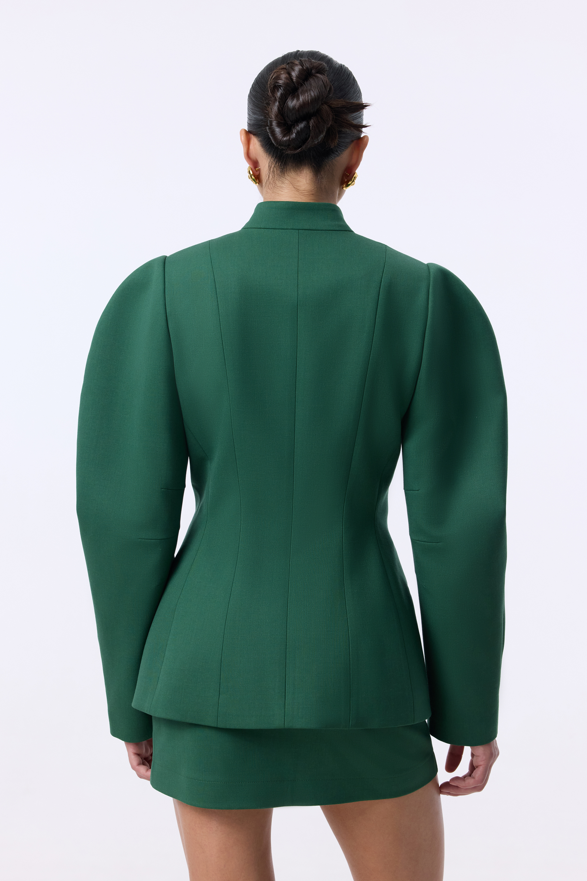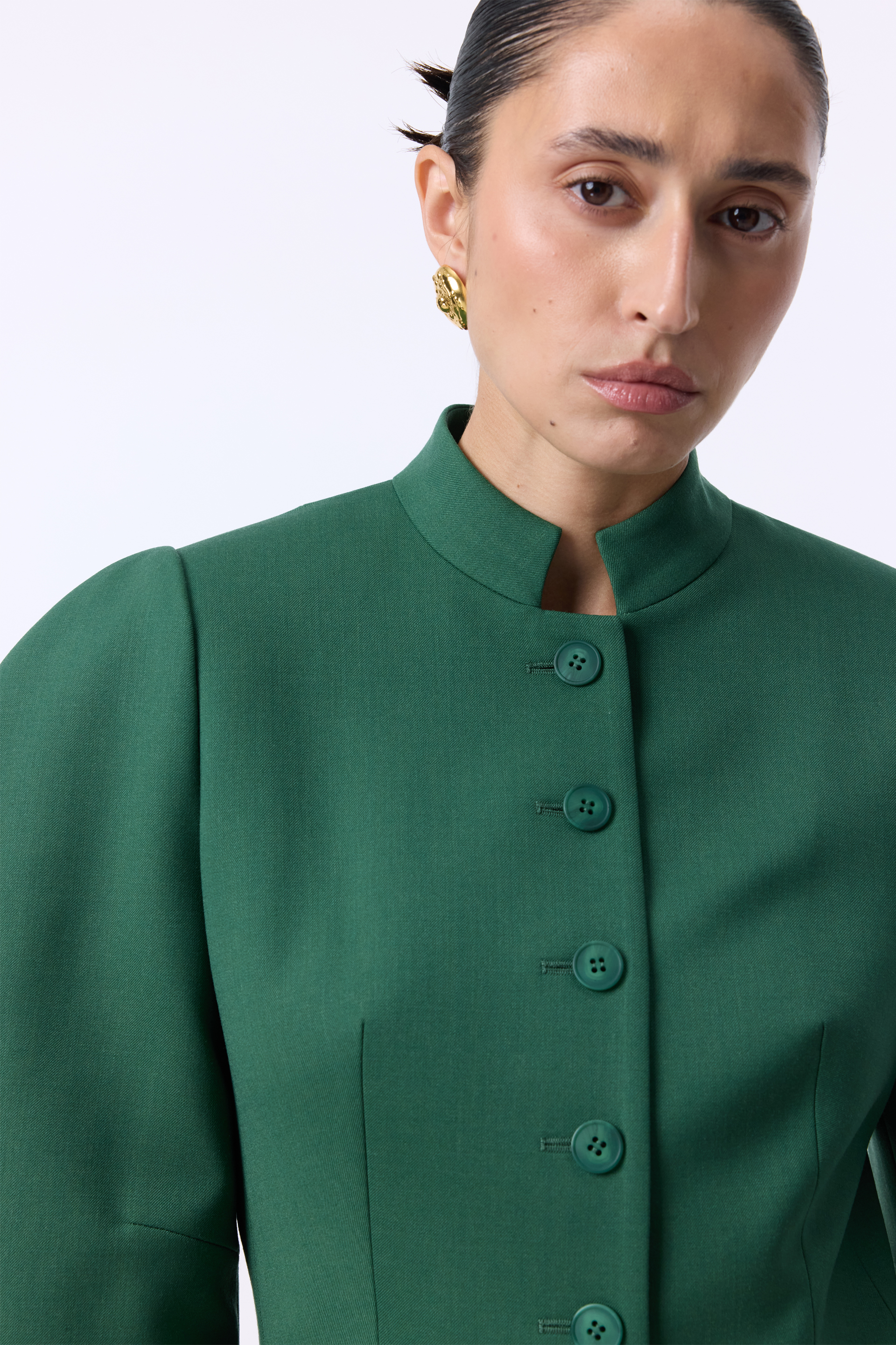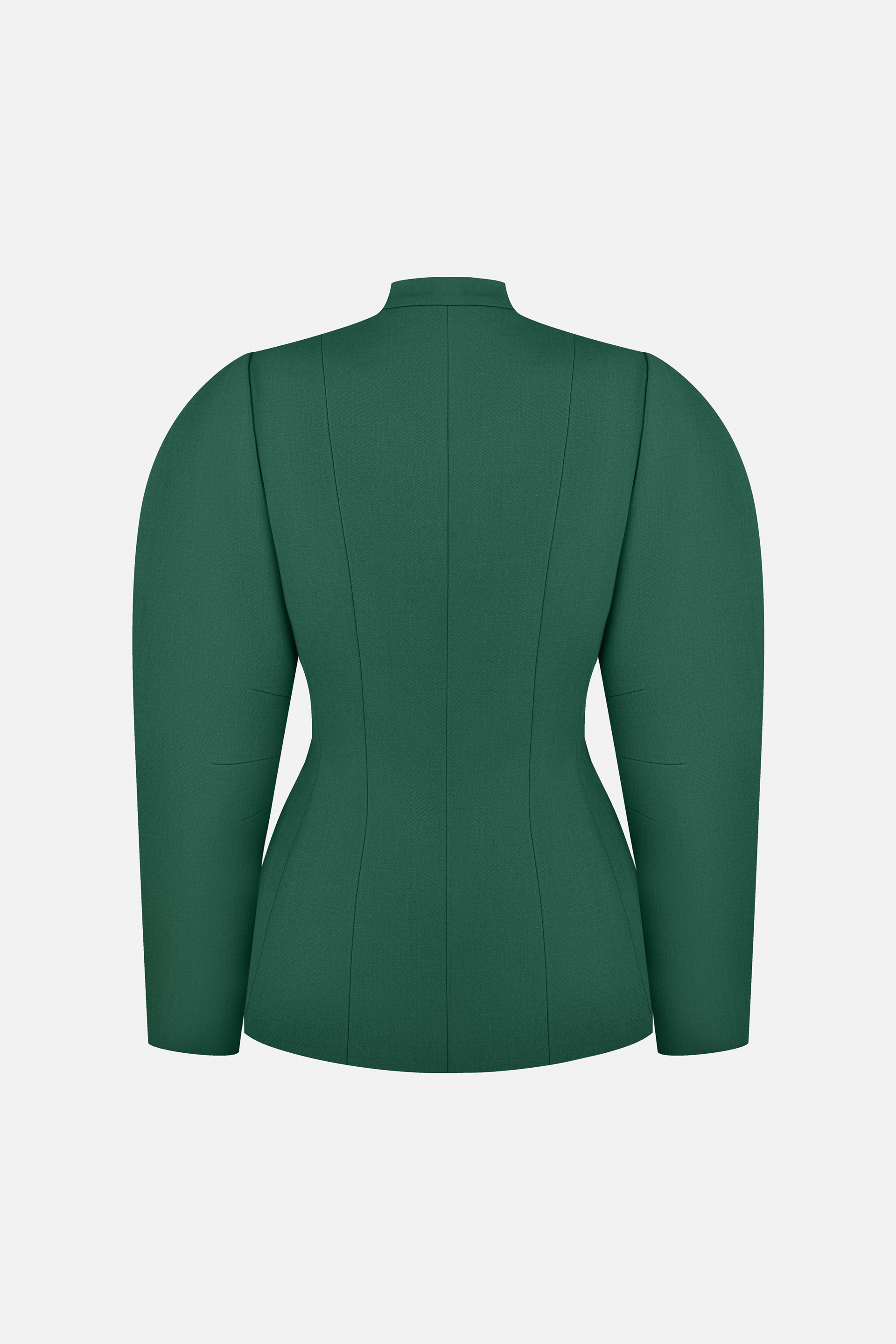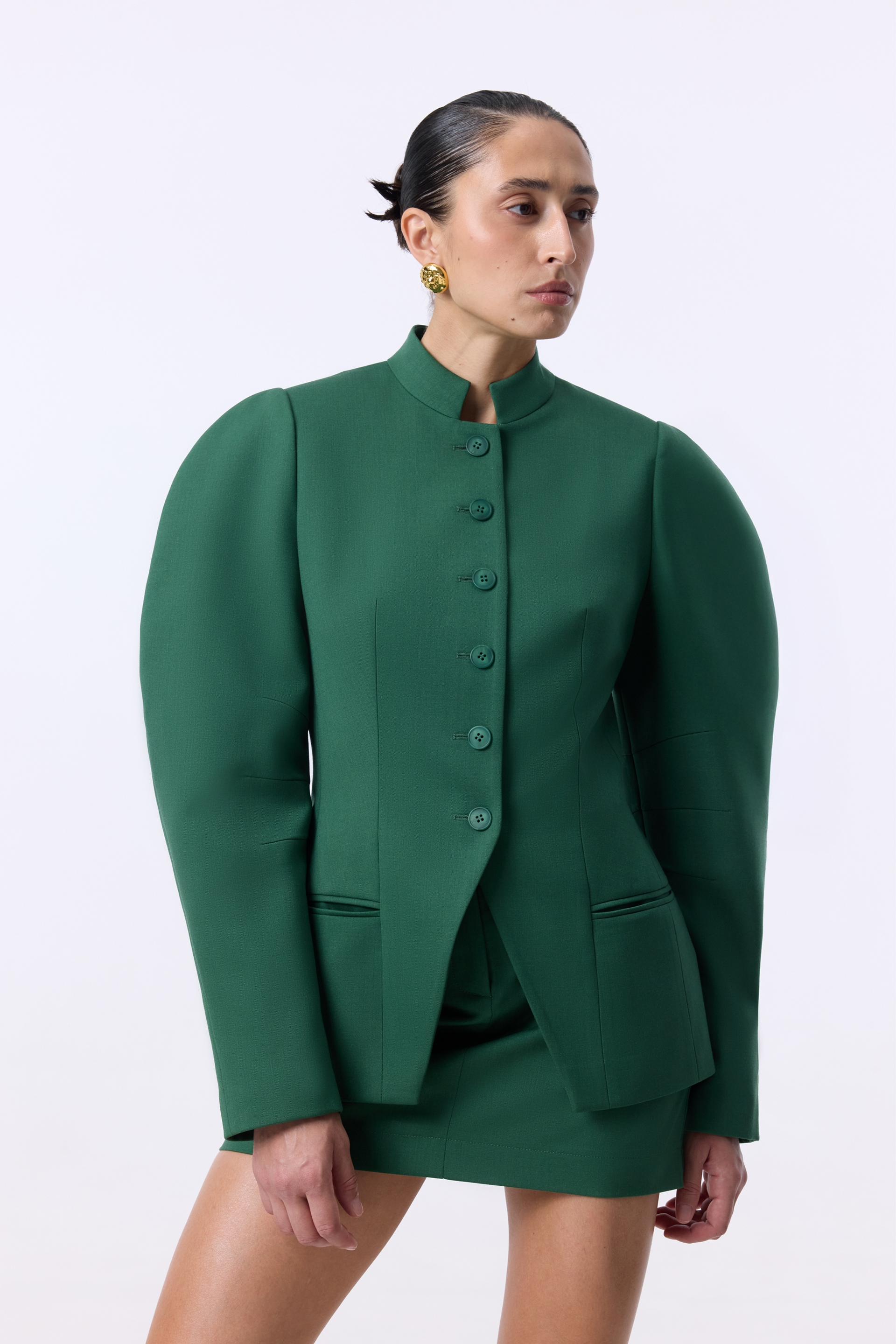 Жакет Tusk — скульптурна модель із чіткими лініями та виразними об’ємними рукавами. Комір-стійка й ряд ґудзиків по центру підкреслюють строгість силуету, тоді як приталений крій додає елегантної структури. Виконаний з міксу віскози, котону та еластану, що забезпечує комфорт і легкість.
