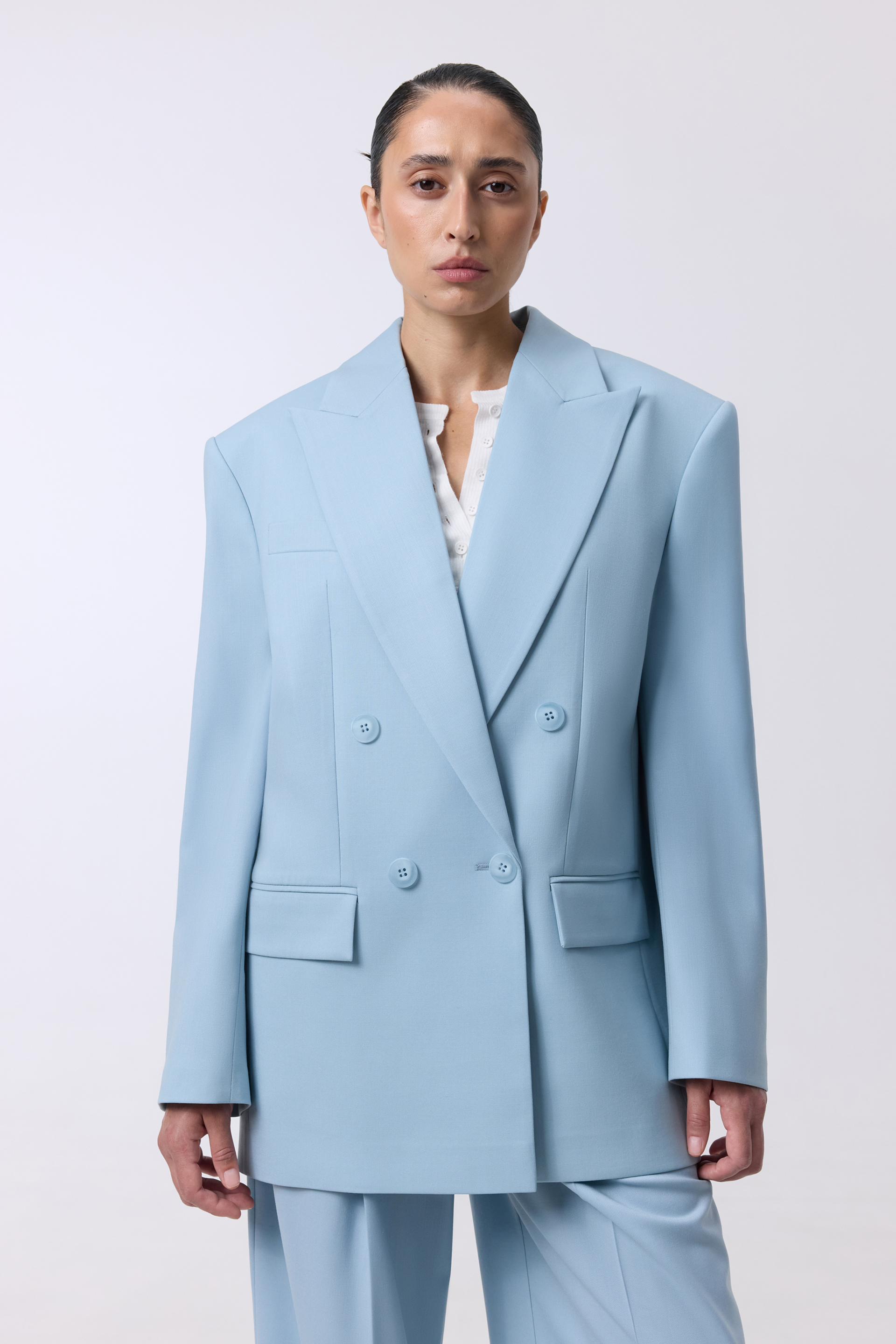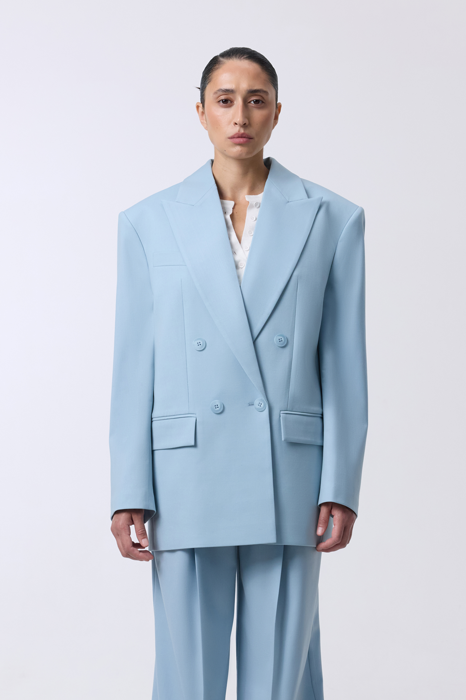 Двобортний жакет оверсайз з підплічниками. Виготовлений з virginwool, що забезпечує тепло та комфорт. Ідеальний вибір для створення елегантних образів на кожен день.