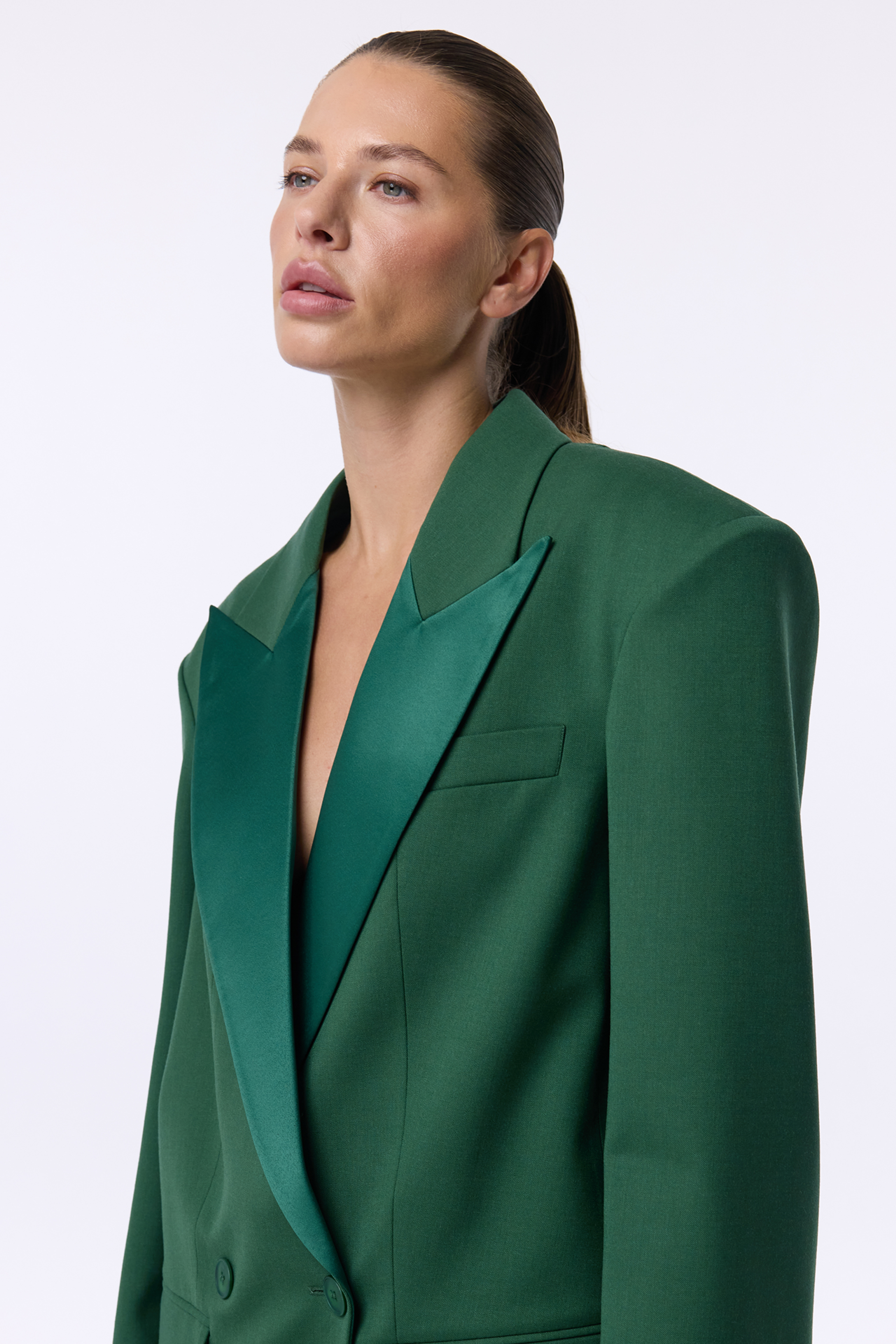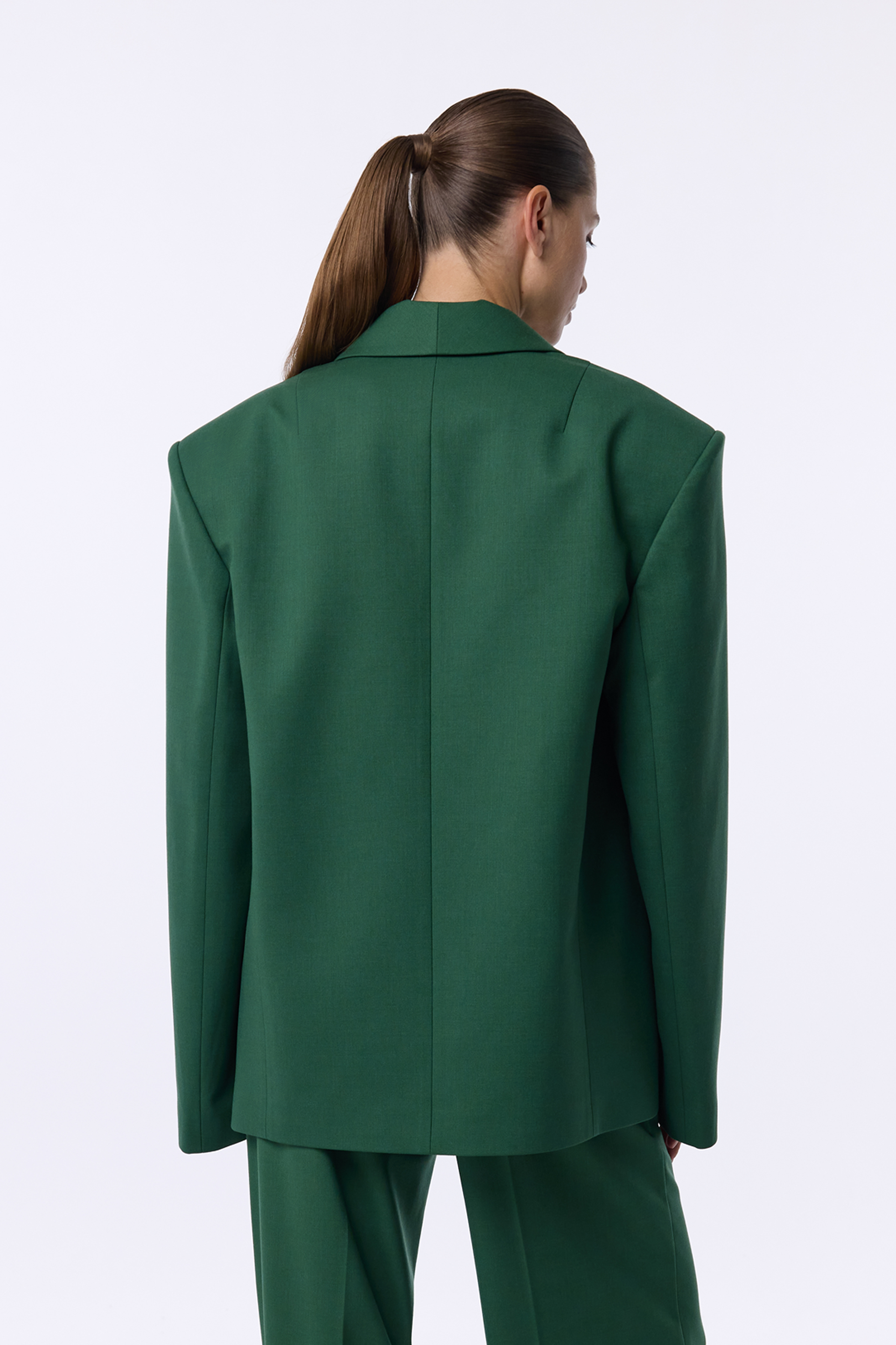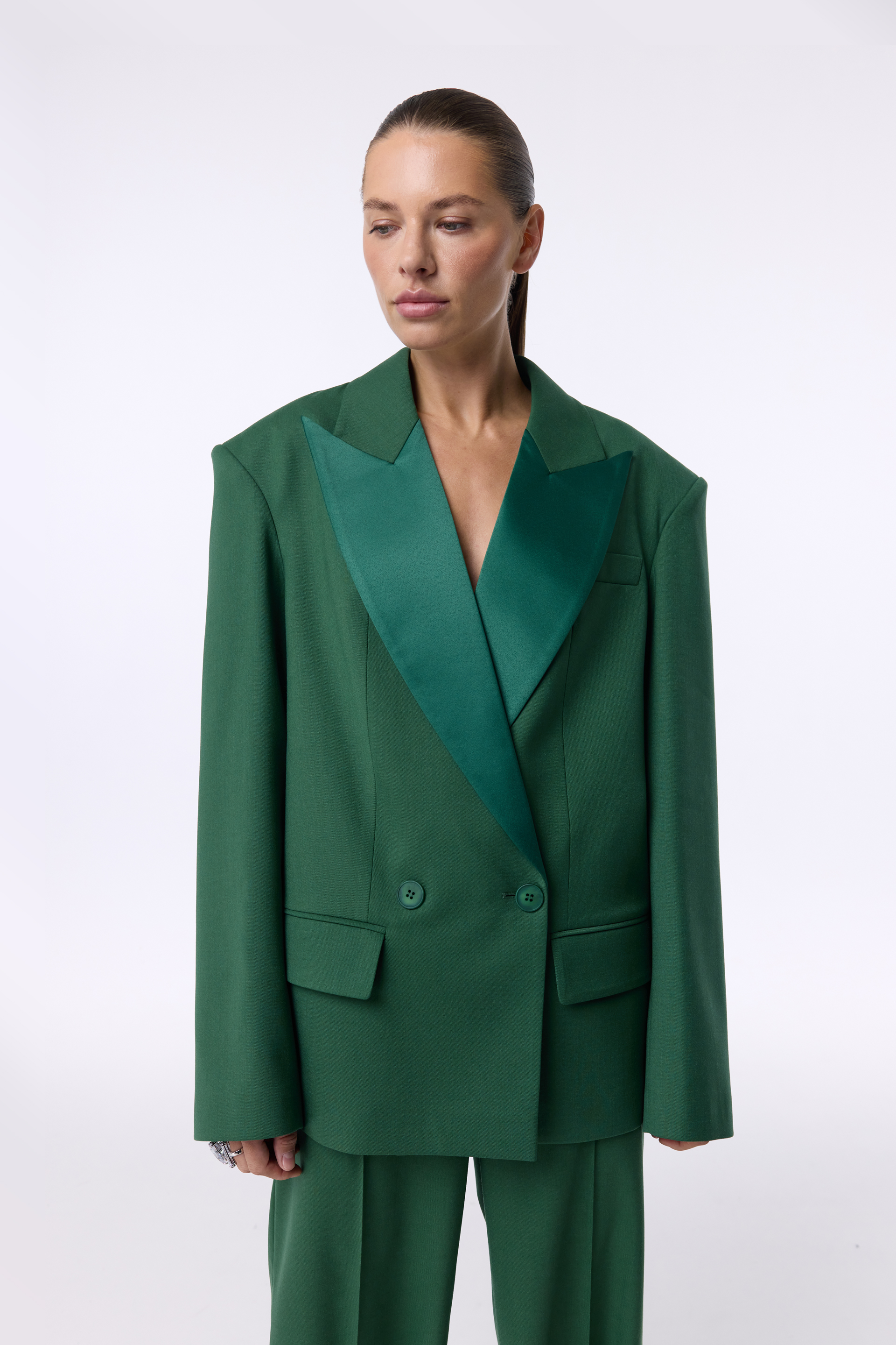Жакет Opulent — виразна oversize-модель із акцентними плечима та широкими лацканами з атласним відблиском. Двобортний крій додає строгості, водночас залишаючи простір для вільного силуету. Виконаний із virginwool, він тримає форму та виглядає бездоганно в будь-якому поєднанні — від вечірнього образу до ділового стилю.