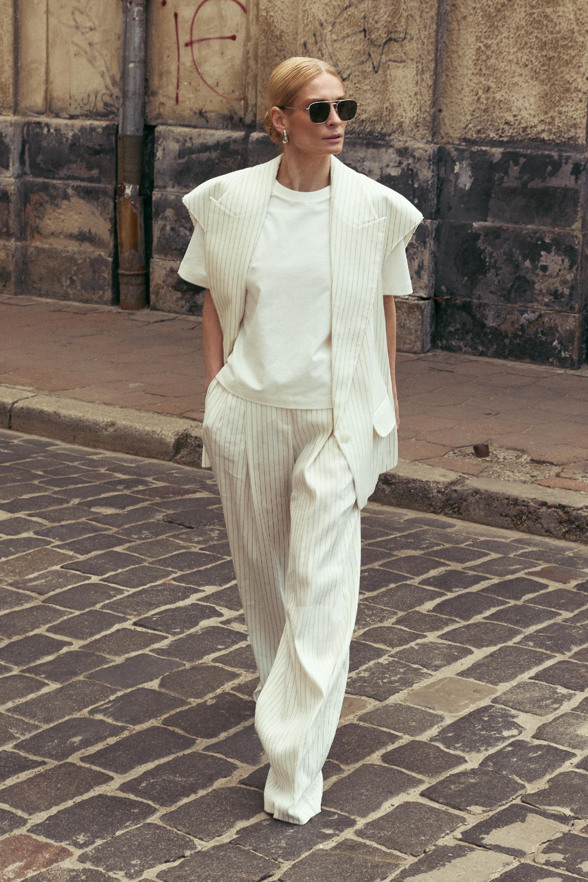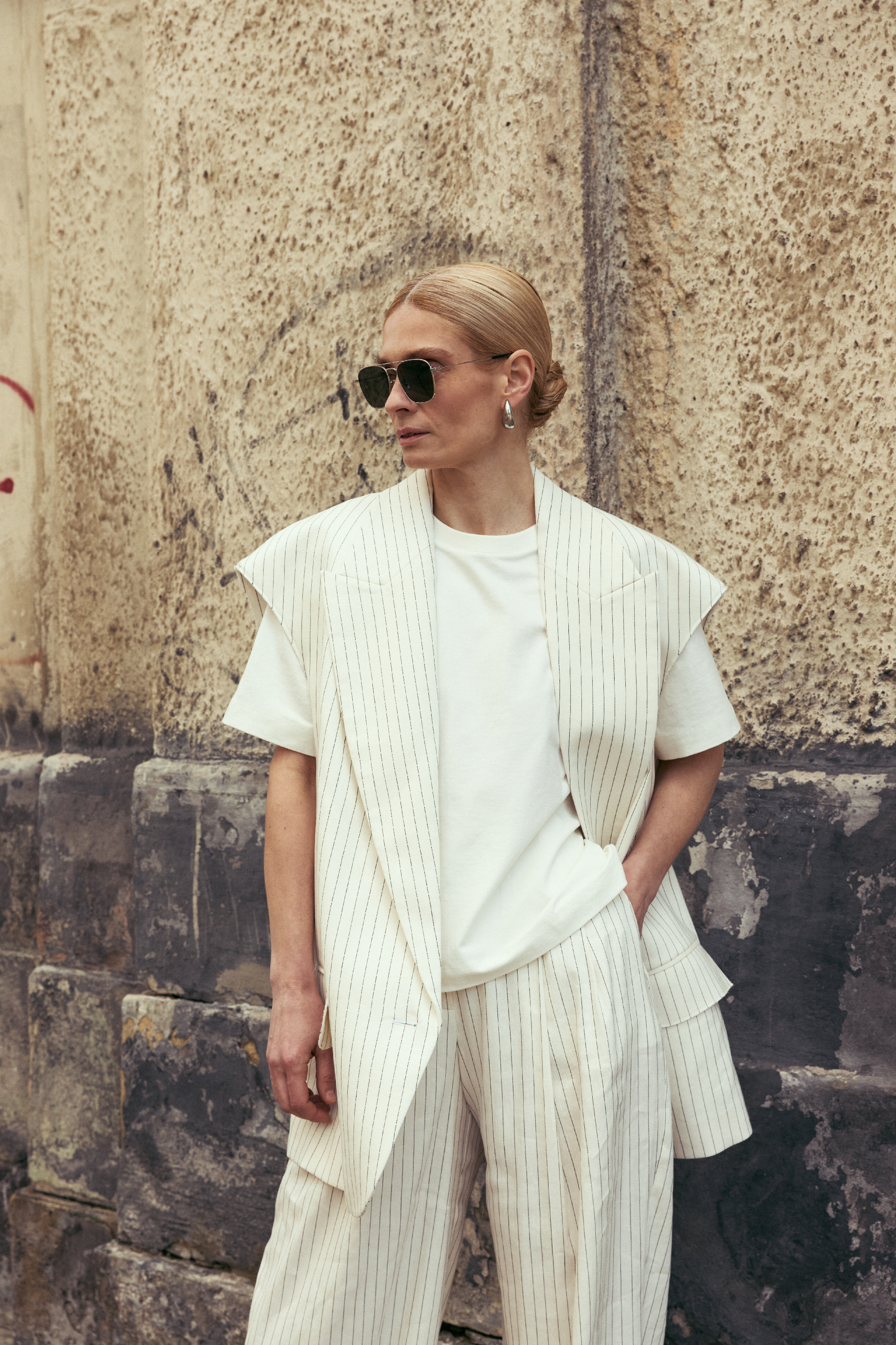 Оверсайз жилет — повітряна структура з функціональним характером. Виготовлений із льону з додаванням віскози, він дарує легкість у носінні та тримає форму. Лаконічний крій дозволяє легко інтегрувати жилет у ділові та повсякденні образи. Добре поєднується з сорочками, лонгслівами або блузами, формуючи стильні багатошарові композиції.