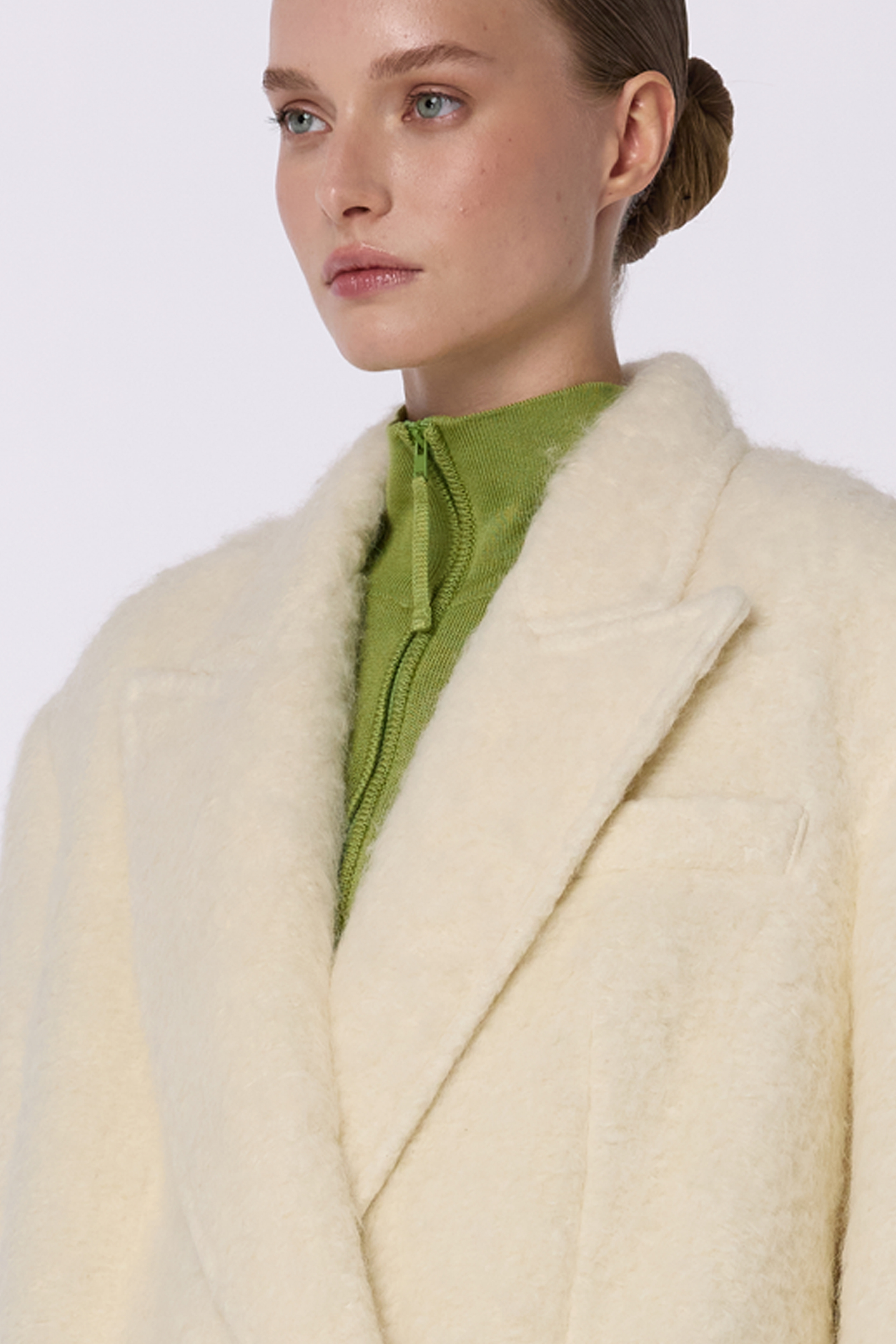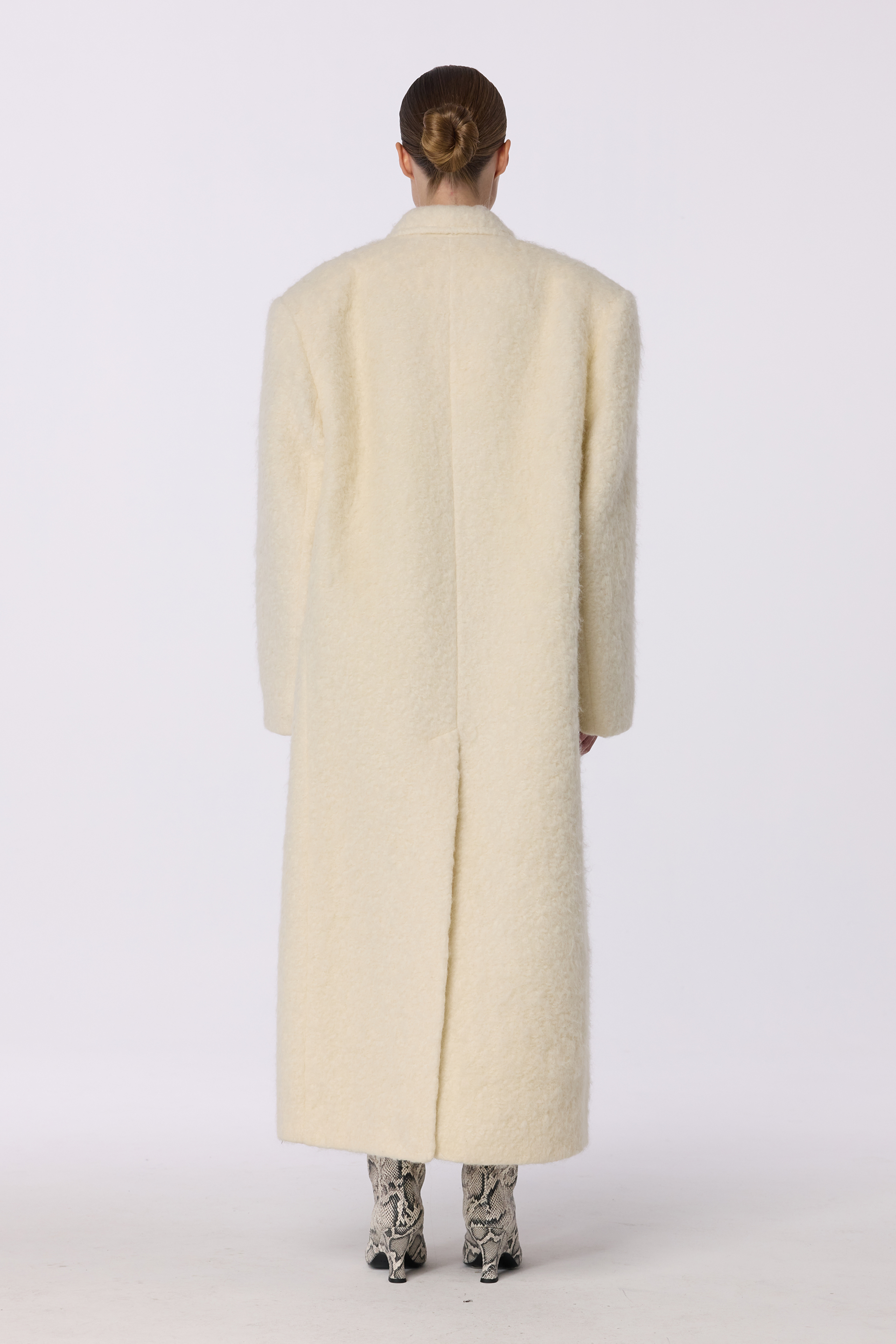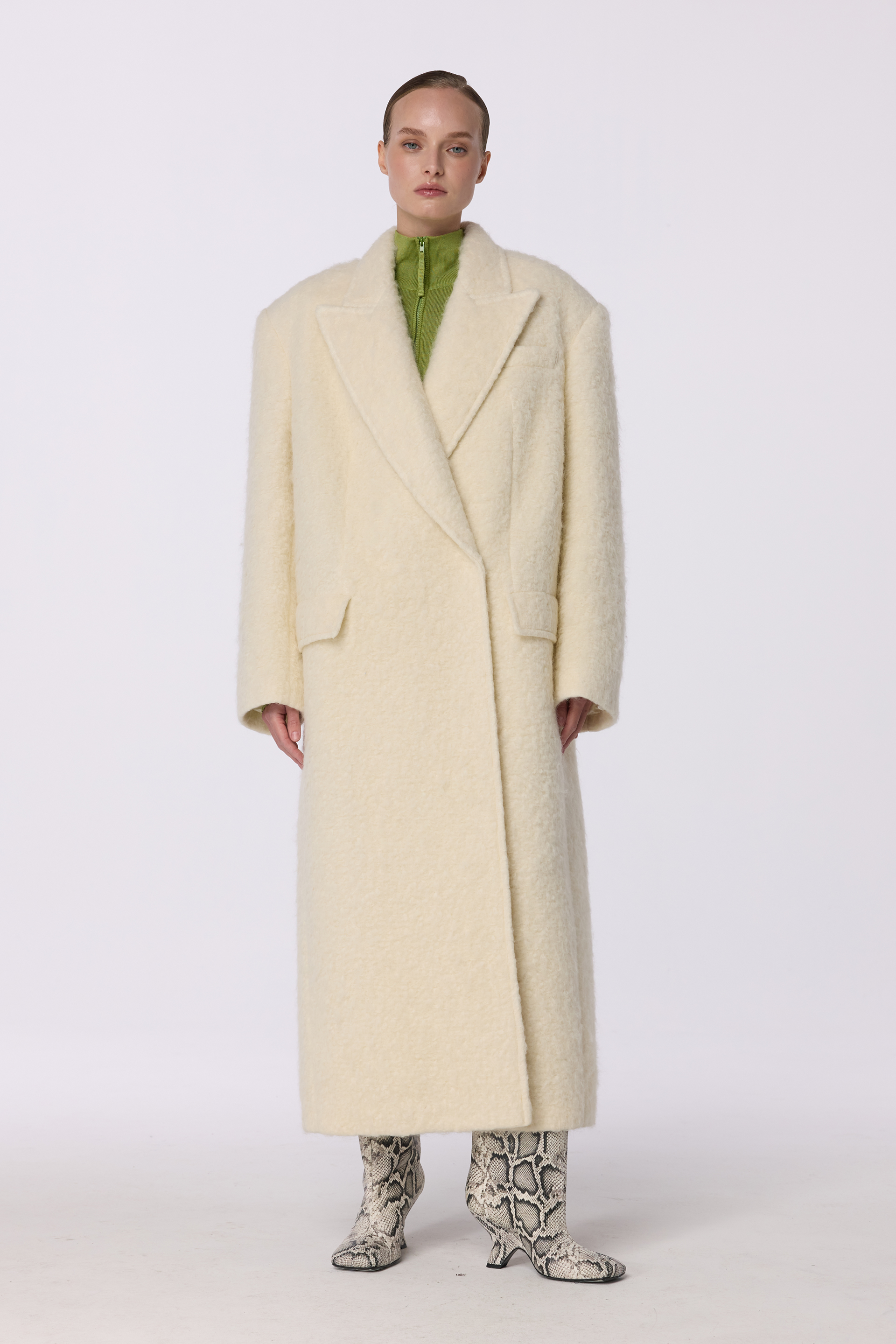 Довге пальто оверсайз прямого крою з акцентним плечем — естетика впевненого стилю та тепла. Виготовлене з міксу virginwool, мохеру та альпаки, воно забезпечує затишок і преміальну текстуру. Вільний силует у поєднанні з лаконічним дизайном додає образу сучасної елегантності. Ідеально підходить для створення стильних зимових аутфітів. Гармонійно поєднується з брюками або спідницями, доповнюючи будь-який гардероб. Пальто розраховане на комфортне носіння до -10°C.